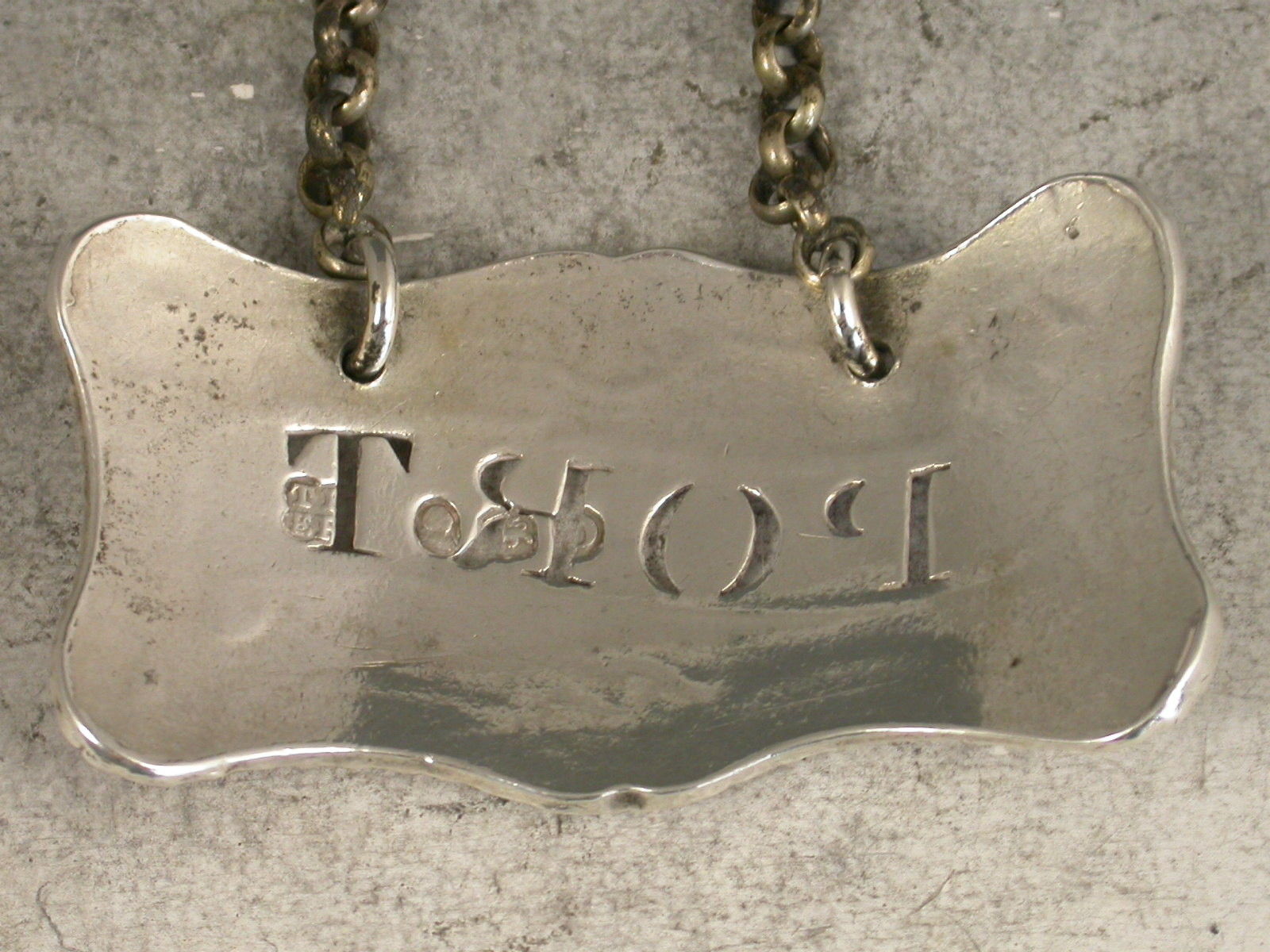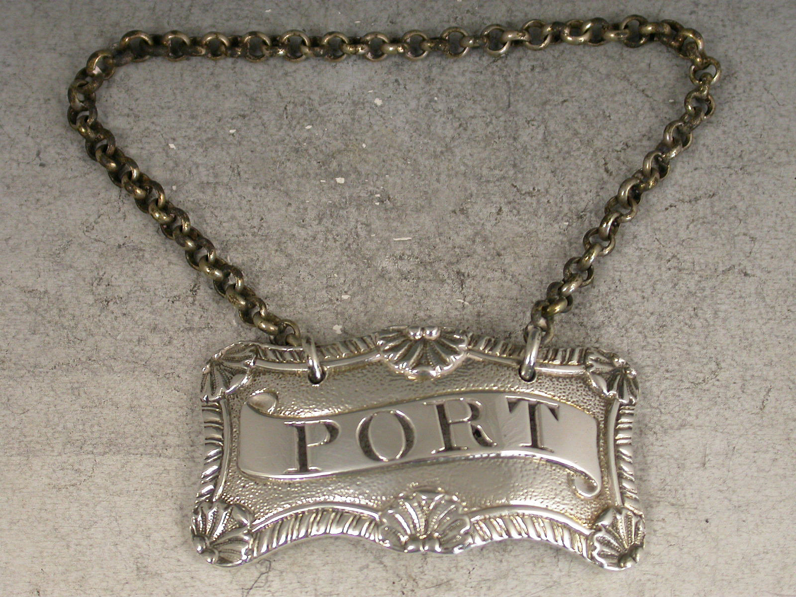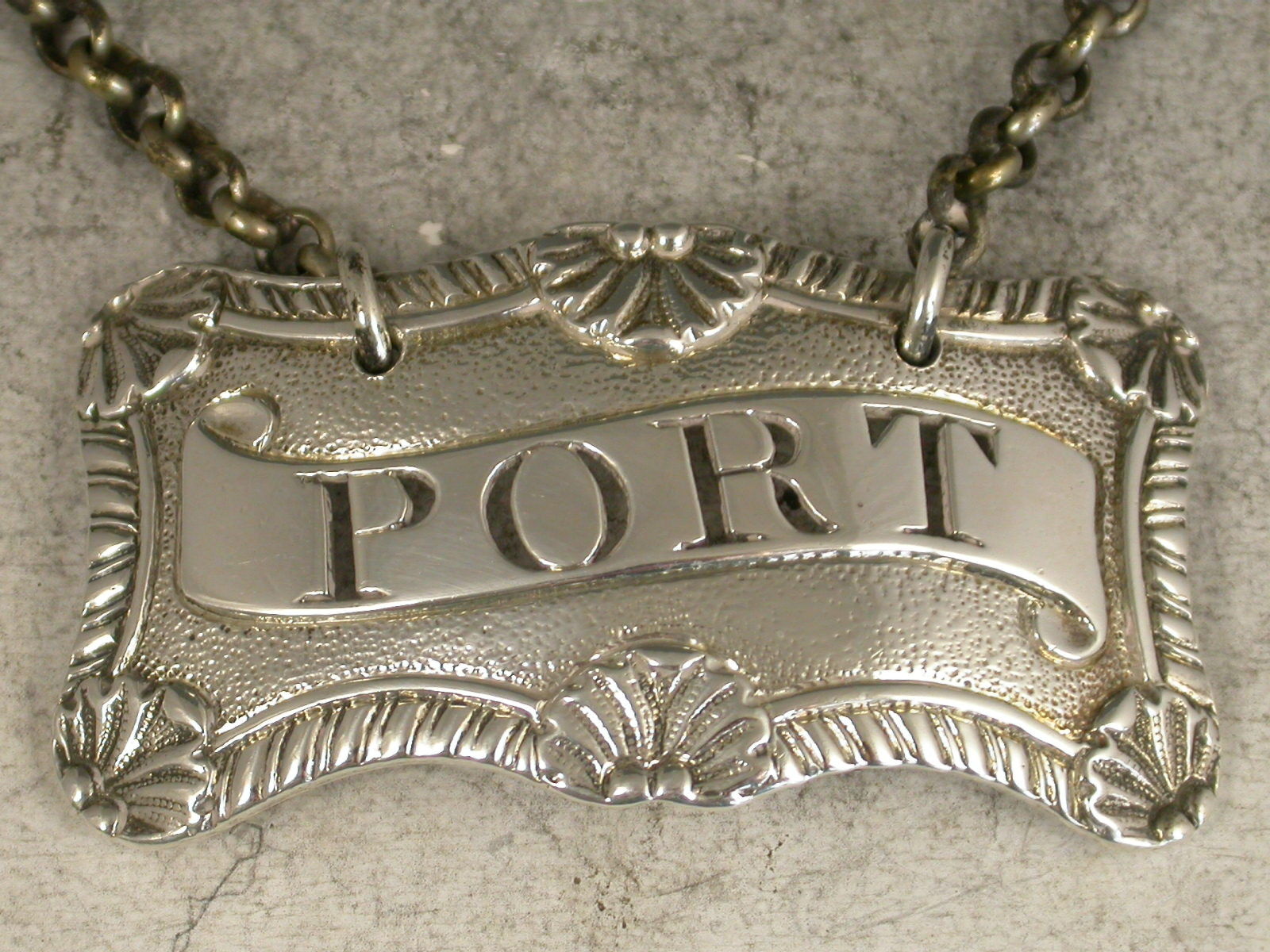 A good George III heavy cast silver Wine Label of shaped broad rectangular form with waved sides and gadrooned border, shells too each corner & top and bottom, pierced for Port on a scrolled nameplate with matted background.