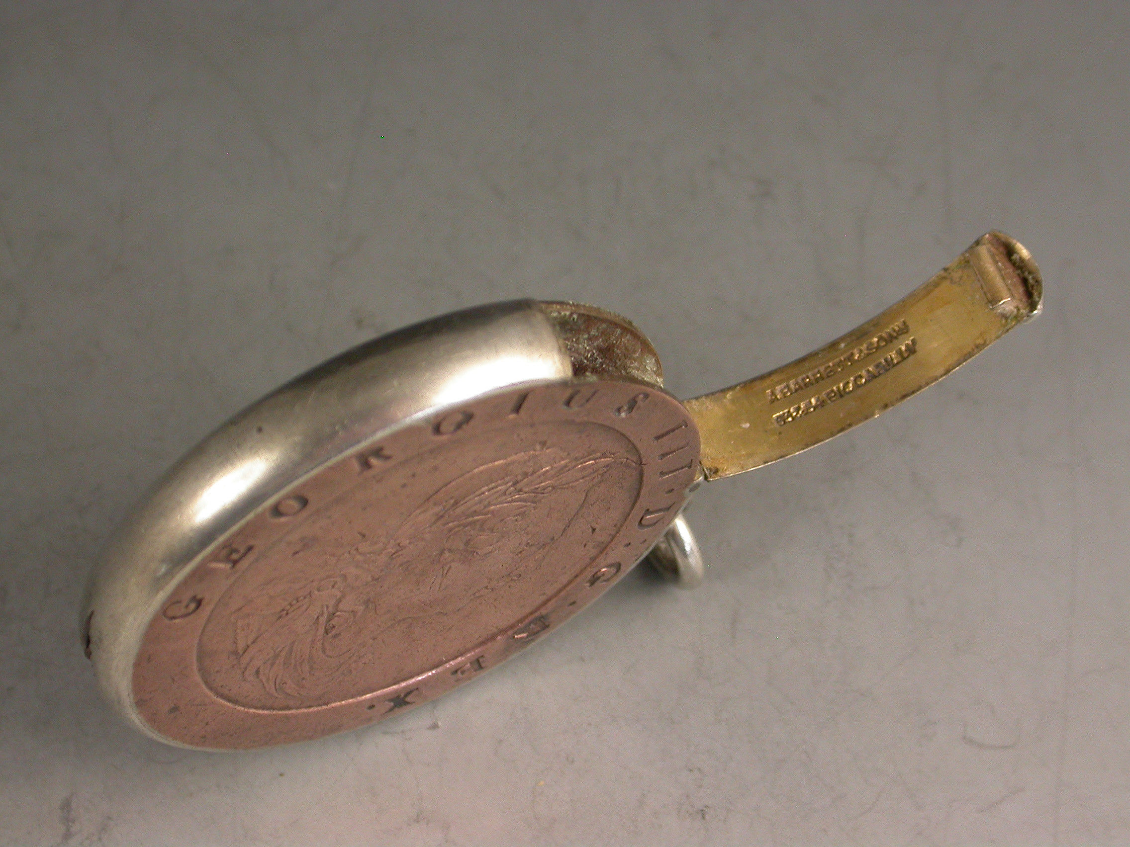 A rare Victorian silver mounted Vesta Case formed from a large George III copper ""Cartwheel"" twopence coin, with attached suspension ring and hinged lid. Silver gilt interior.