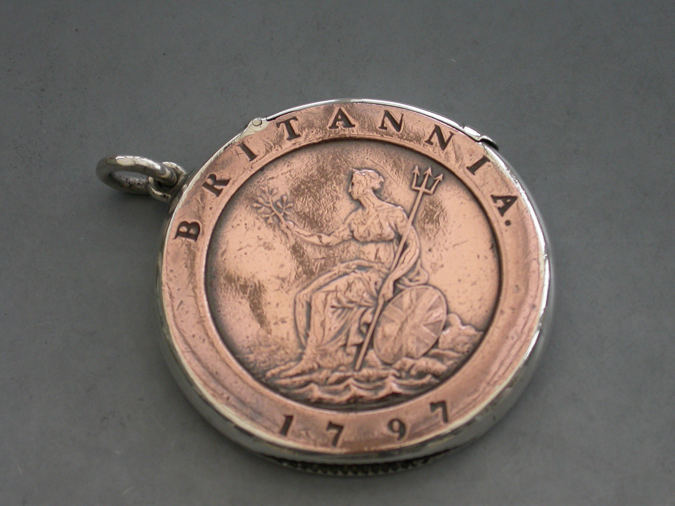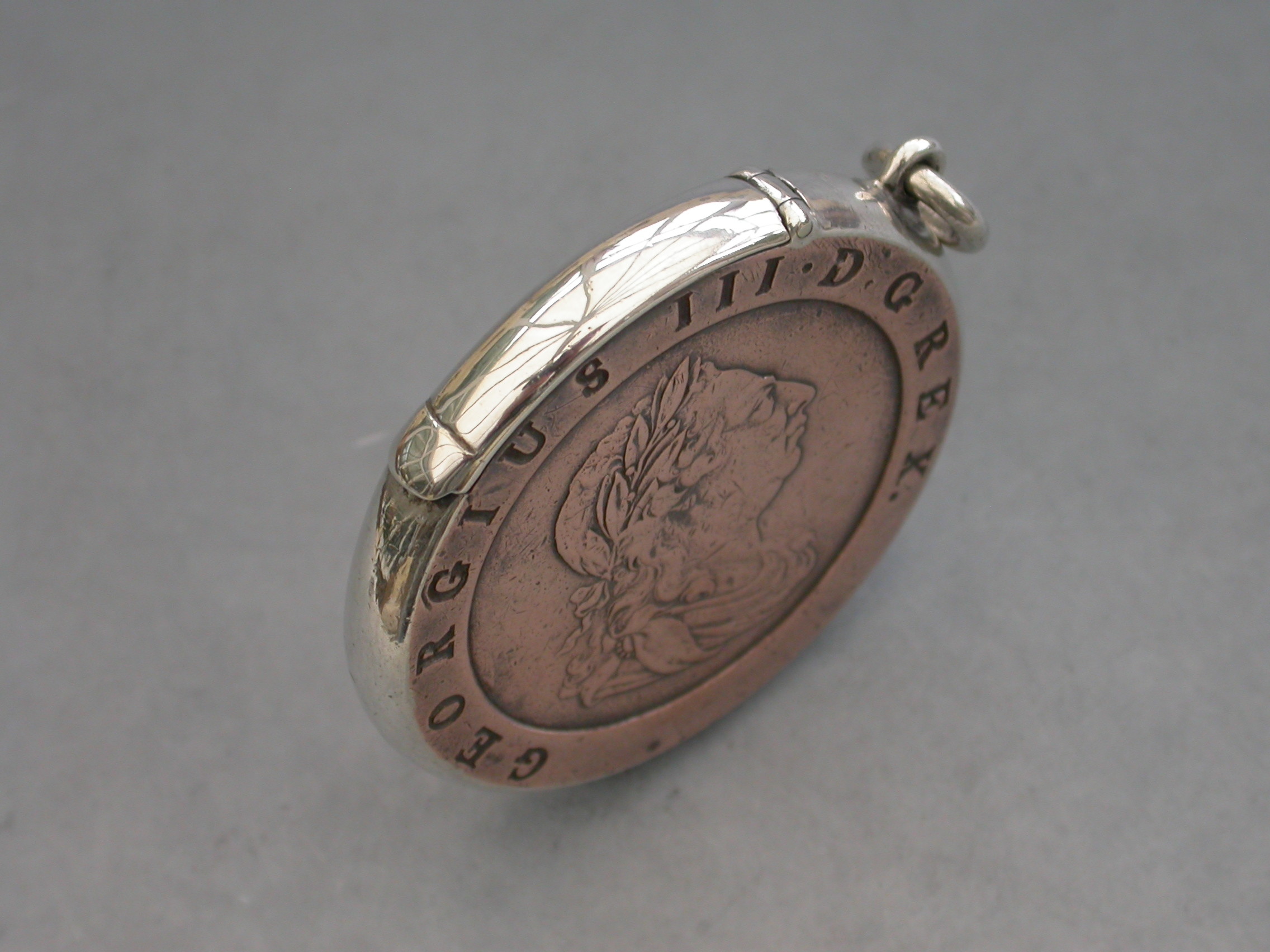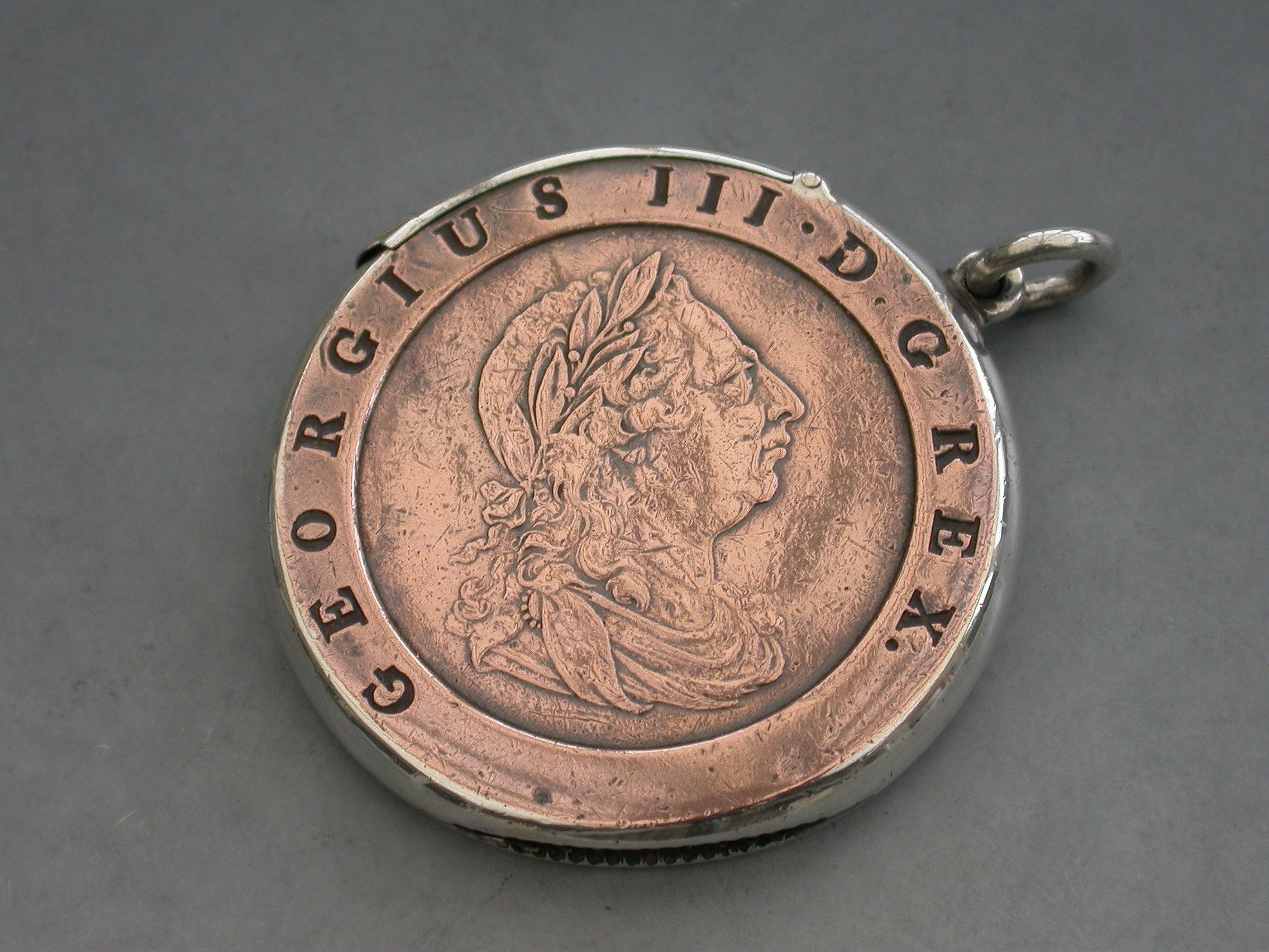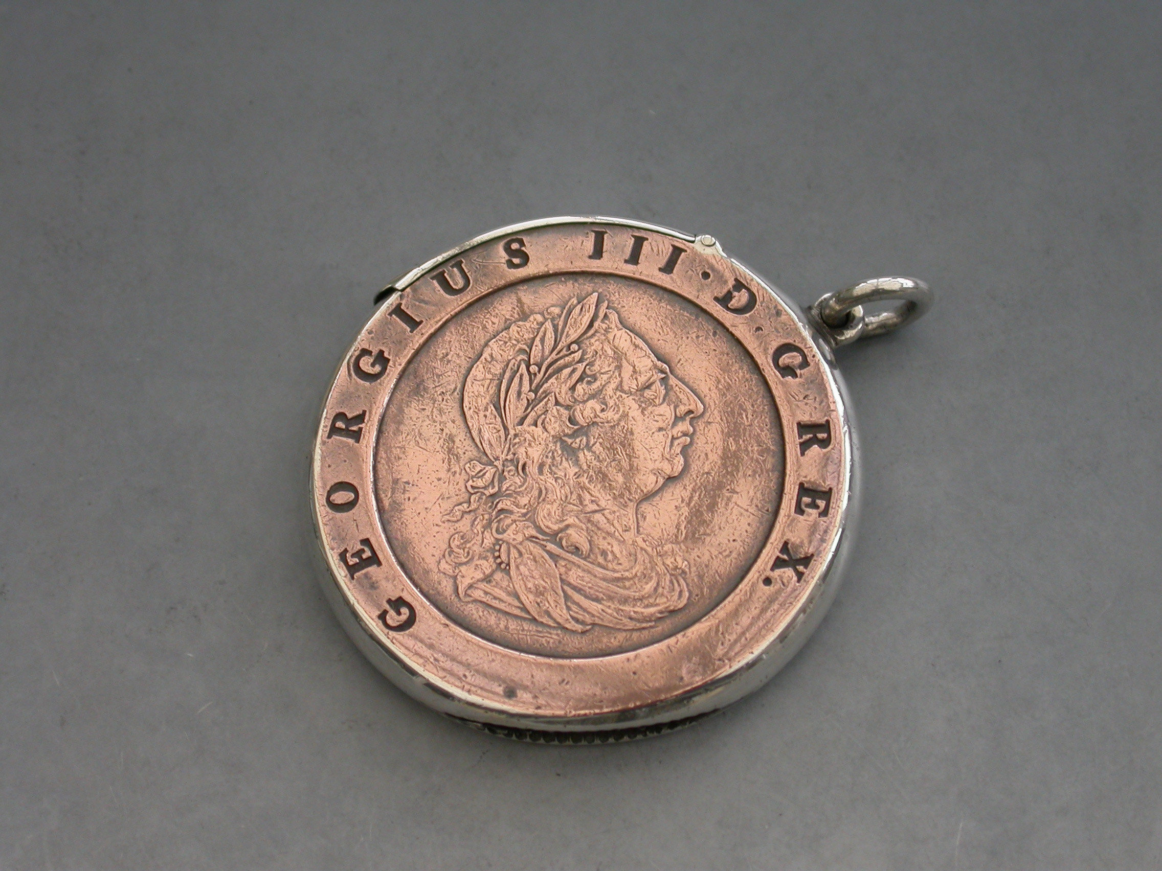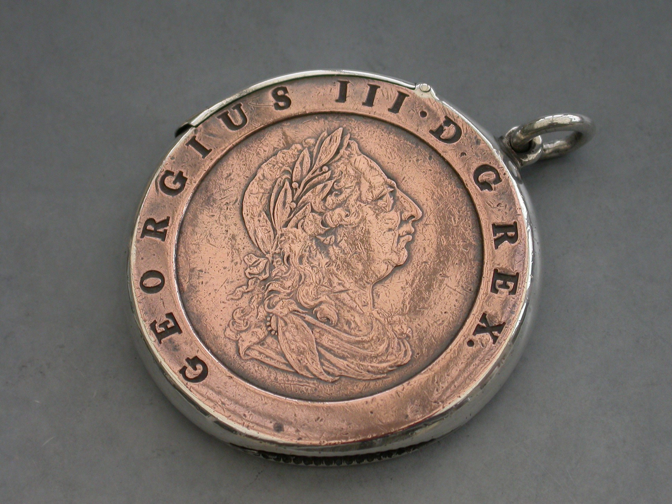 A rare Victorian silver mounted Vesta Case formed from a large George III copper ""Cartwheel"" twopence coin, with attached suspension ring and hinged lid. Silver gilt interior.