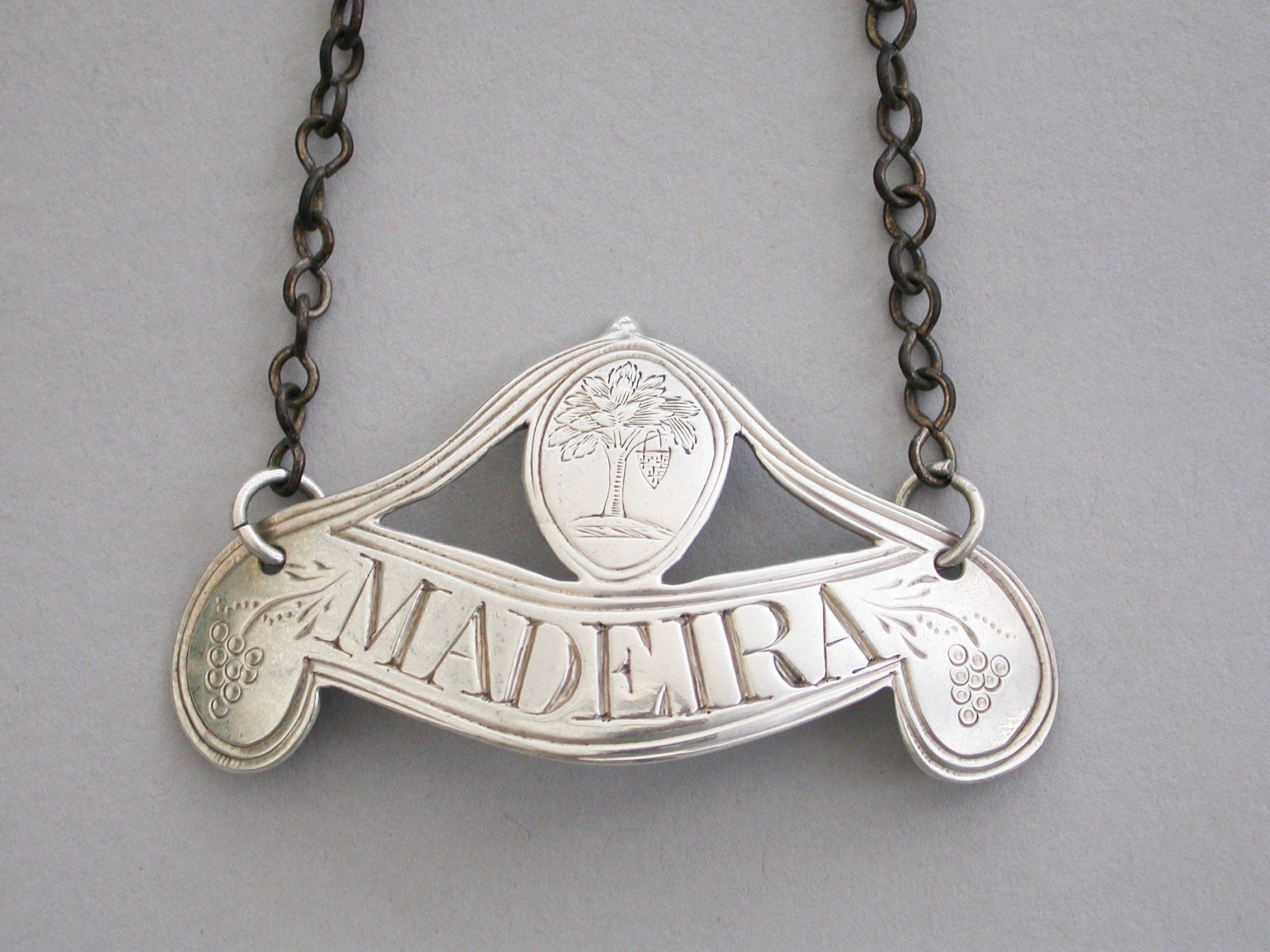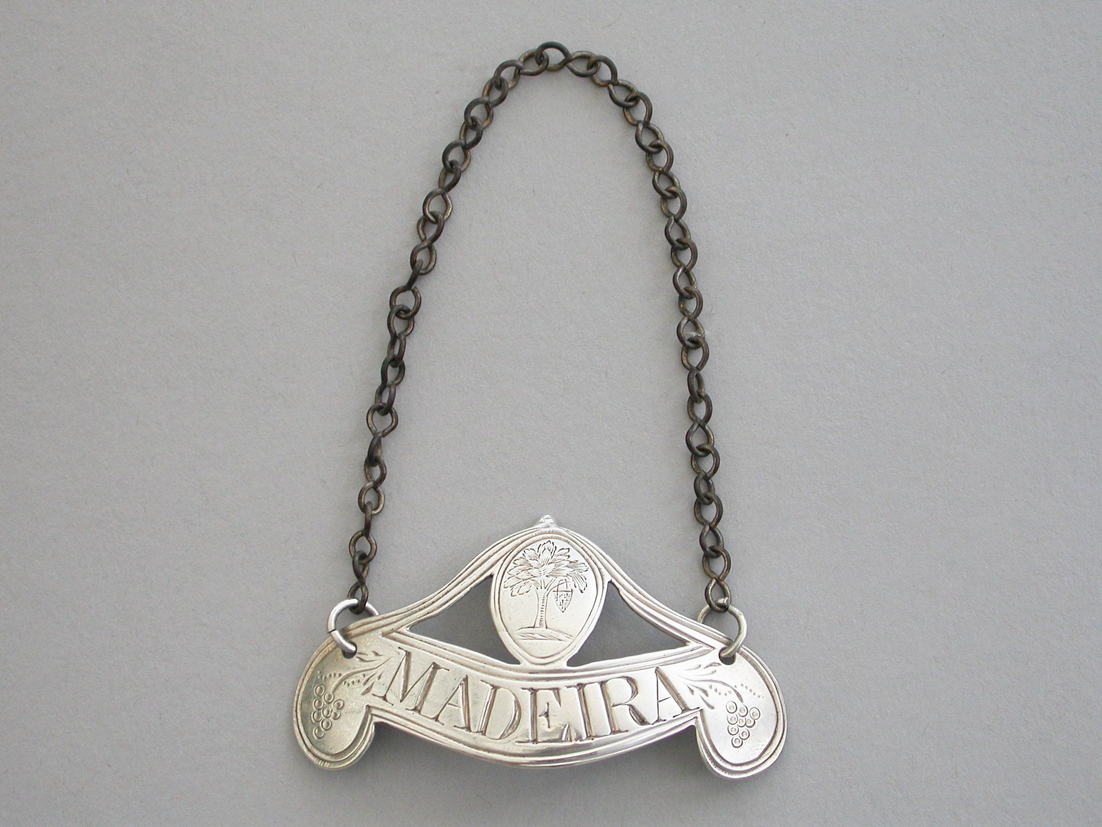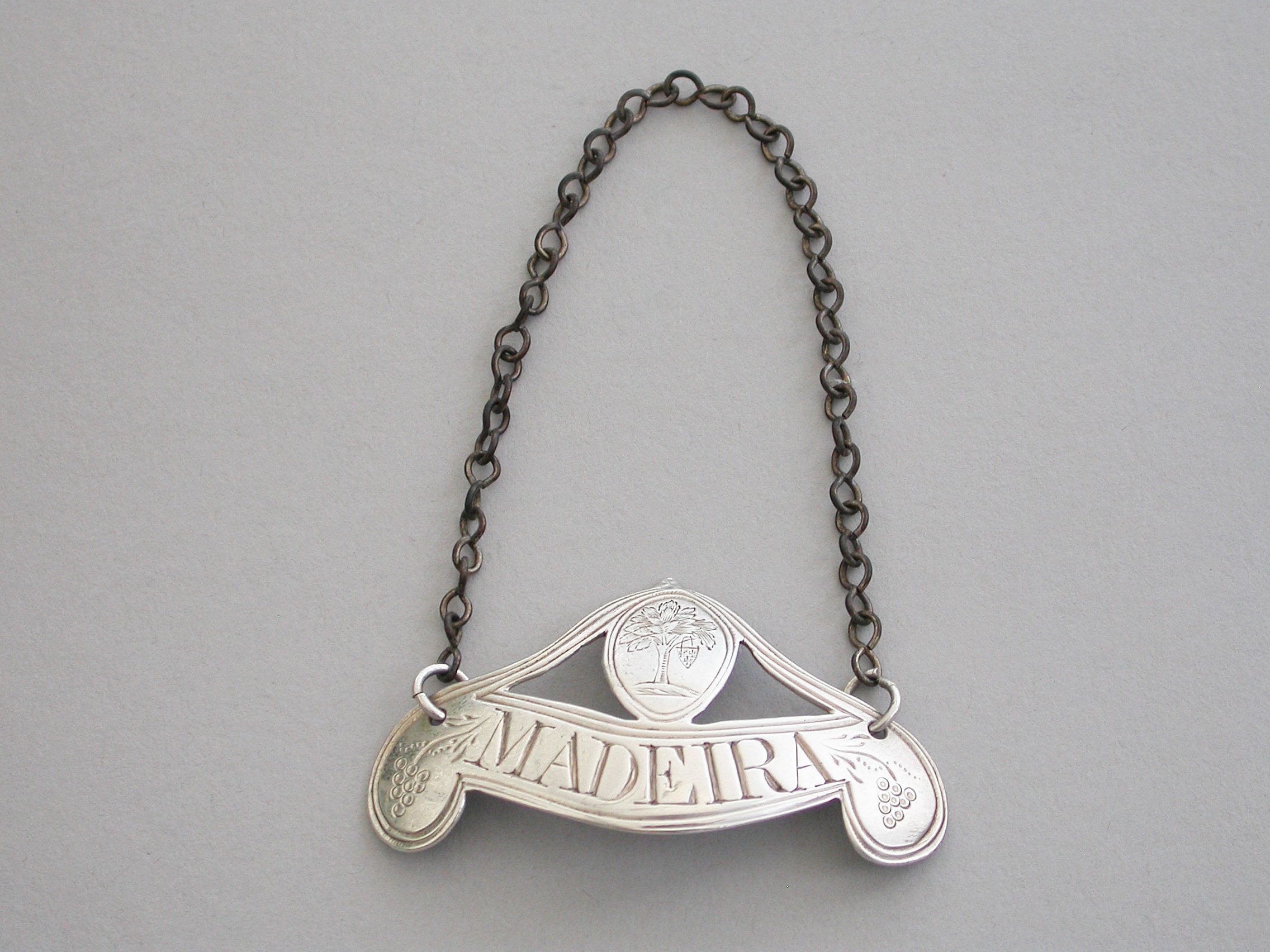 A rare George III silver Wine Label of down turned double scroll form surmounted by a oval cartouche with a double reeded border and supports, the ends engraved with bunches of grapes and the cartouche engraved with an armorial crest depicting a walnut tree ppr on a mount vert, an escutcheon hanging from the branches, for the Waller family. Incised for Madeira.