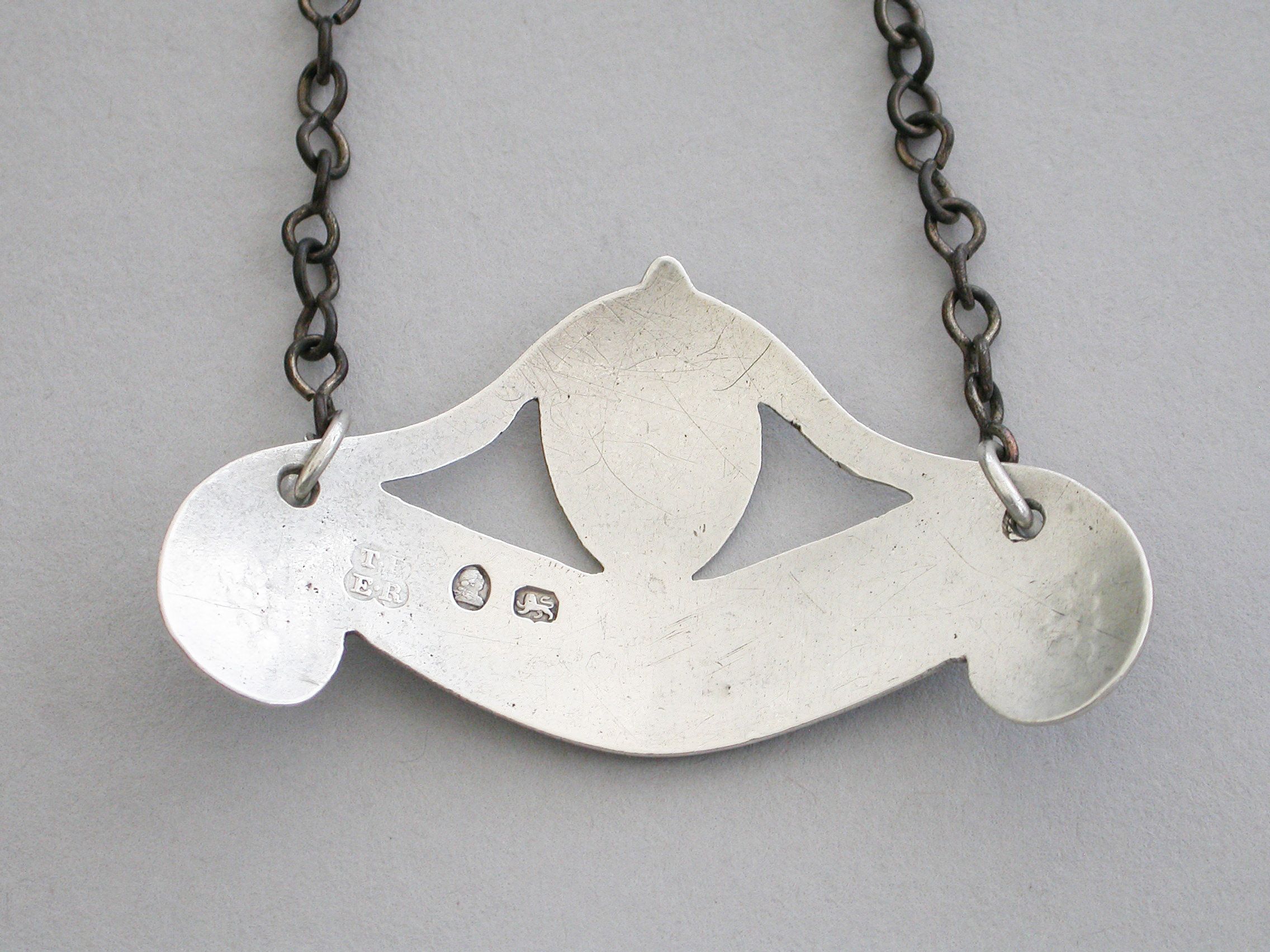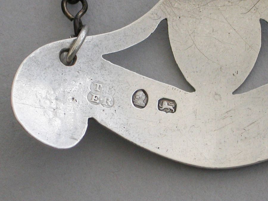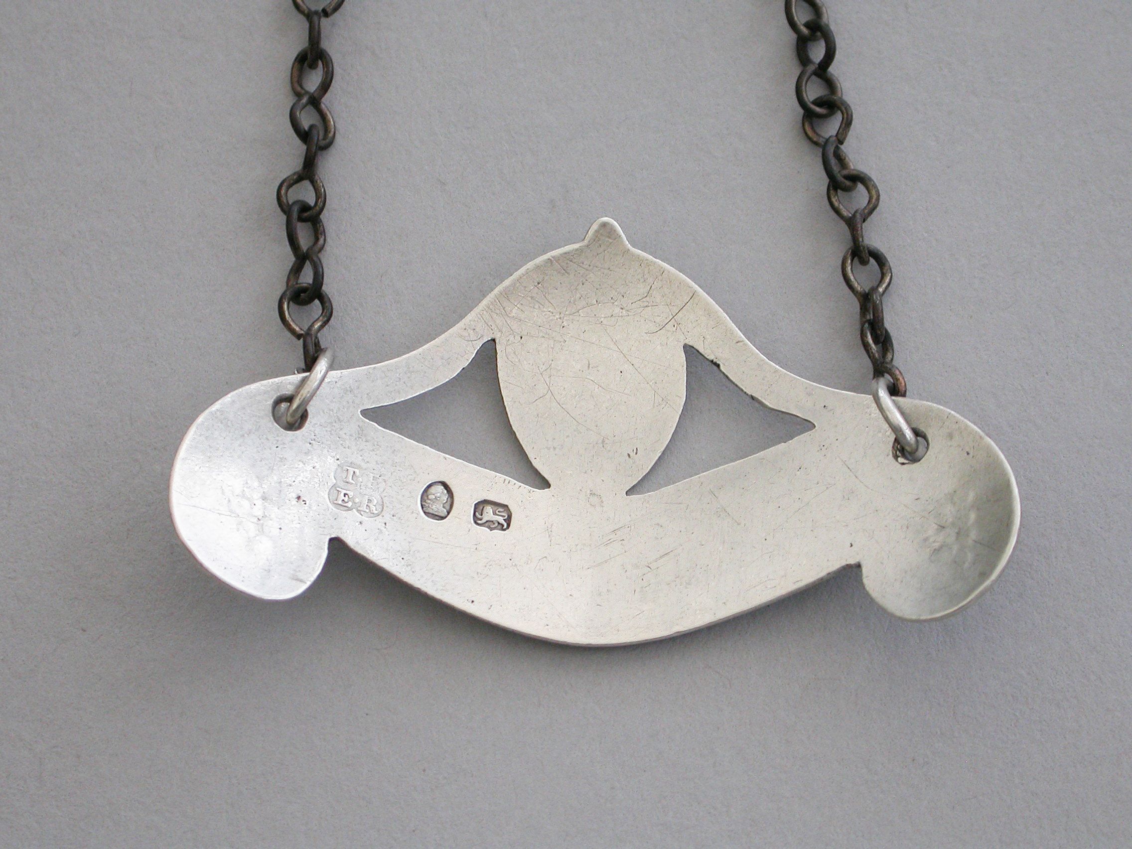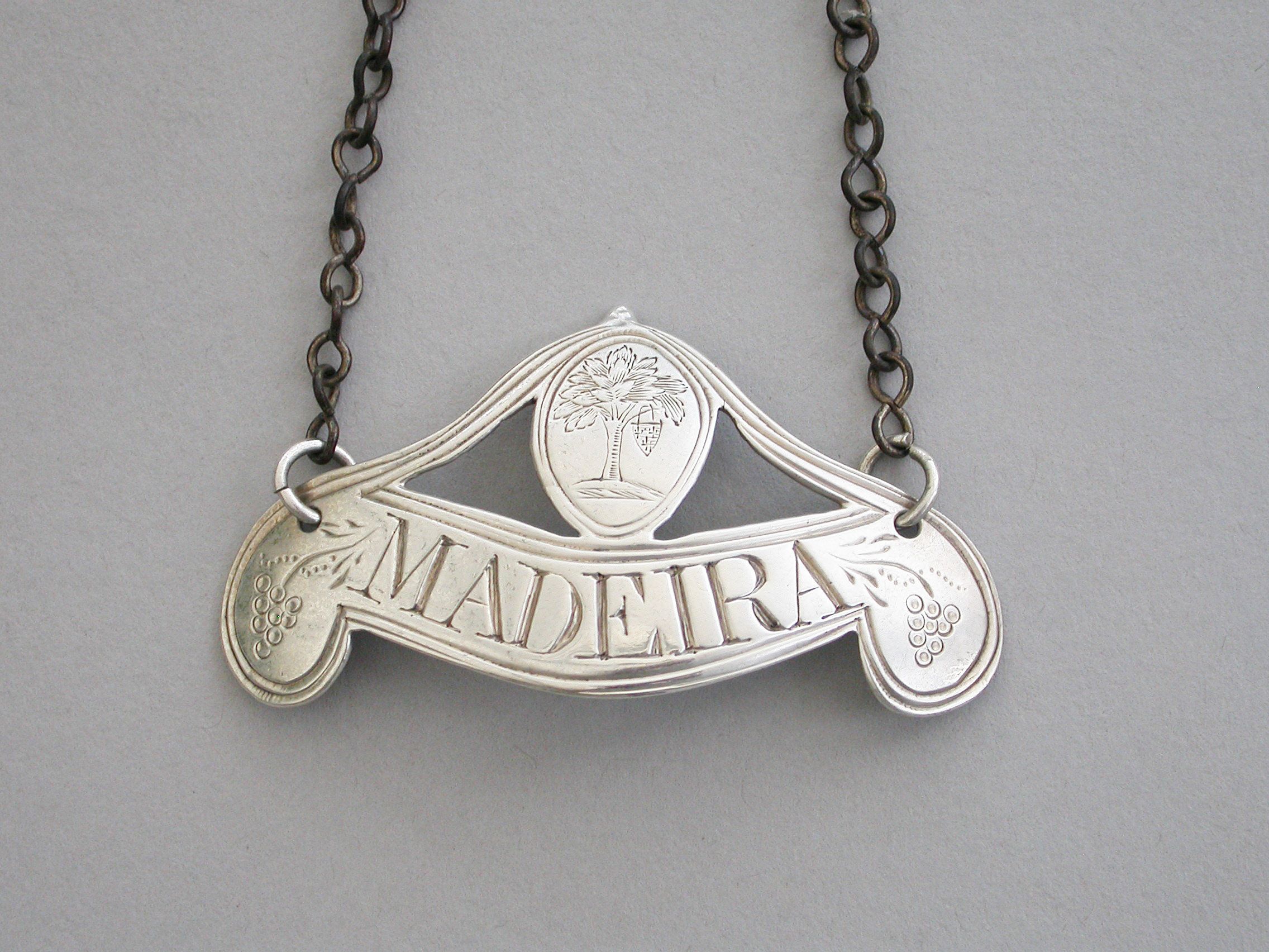 A rare George III silver Wine Label of down turned double scroll form surmounted by a oval cartouche with a double reeded border and supports, the ends engraved with bunches of grapes and the cartouche engraved with an armorial crest depicting a walnut tree ppr on a mount vert, an escutcheon hanging from the branches, for the Waller family. Incised for Madeira.