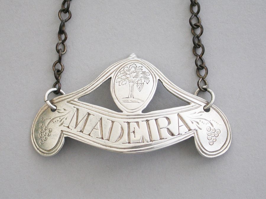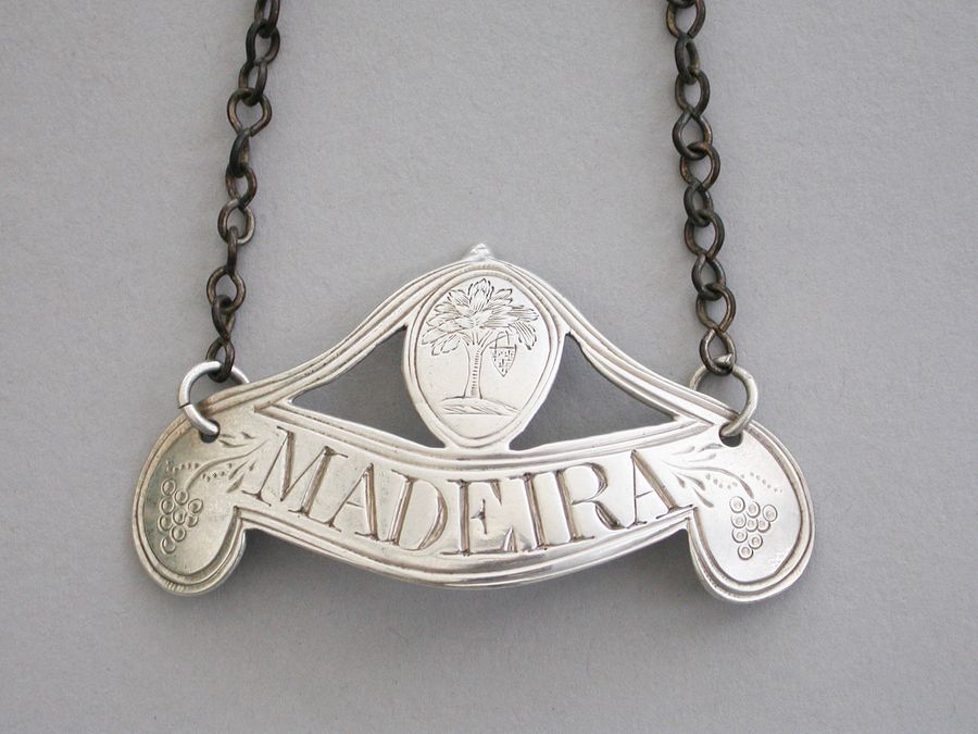 George III Crested Silver Double Scroll Shaped Wine Label 'Madeira' Waller Family