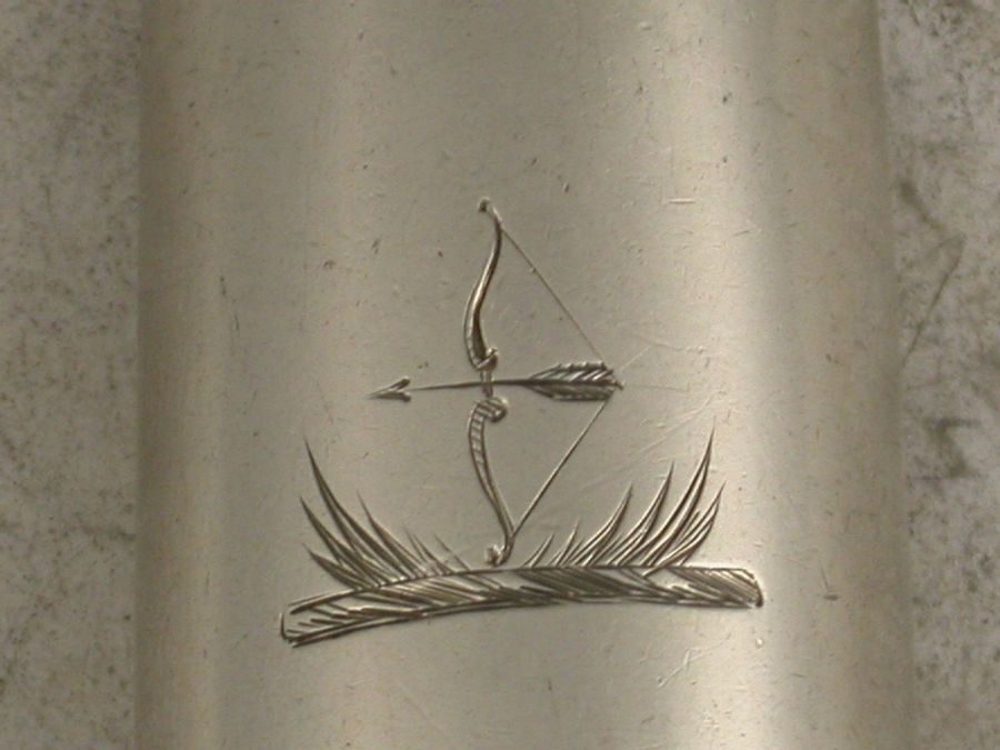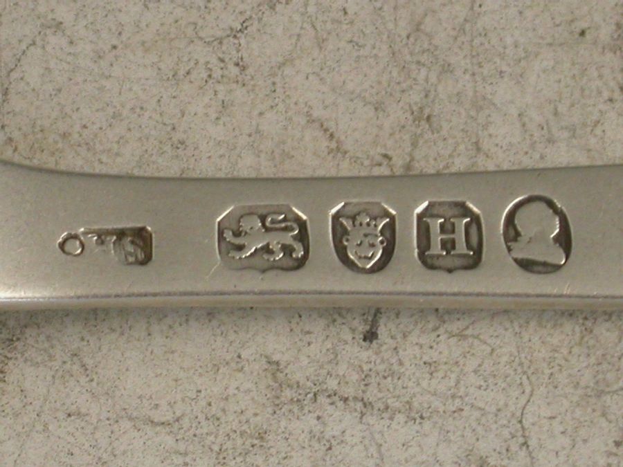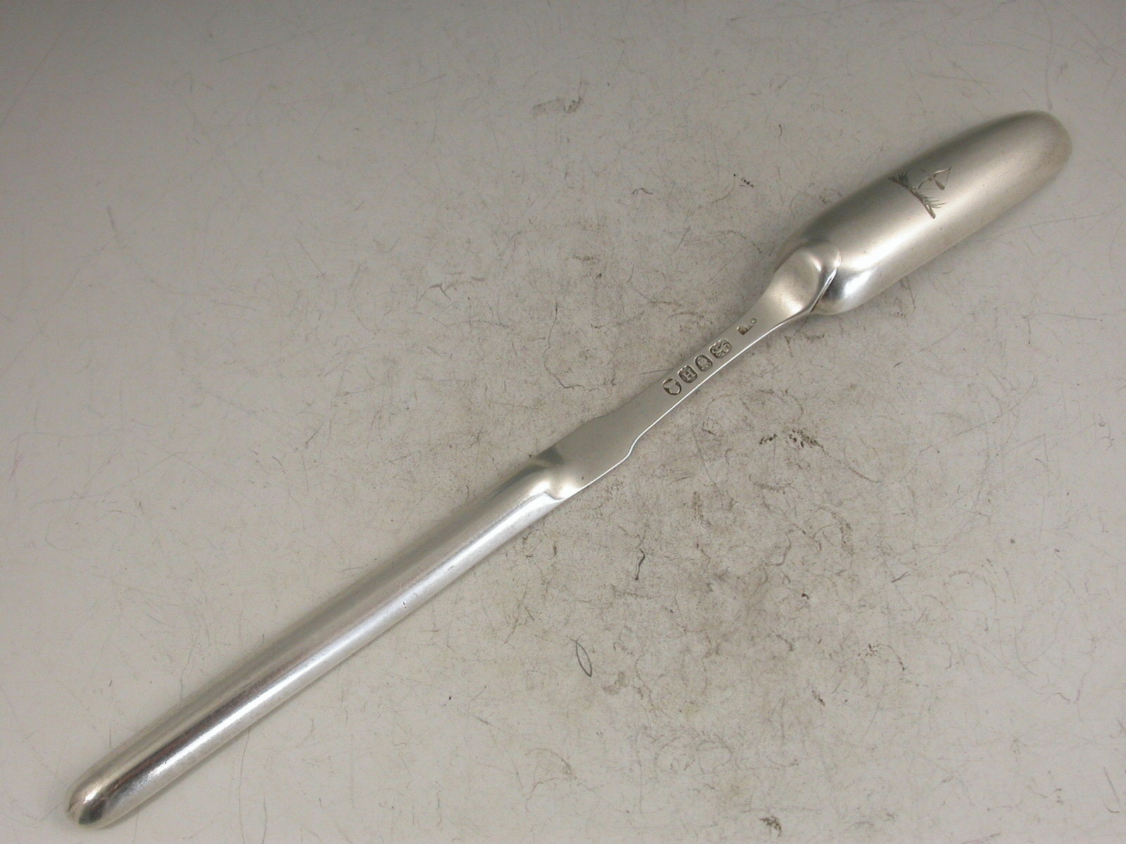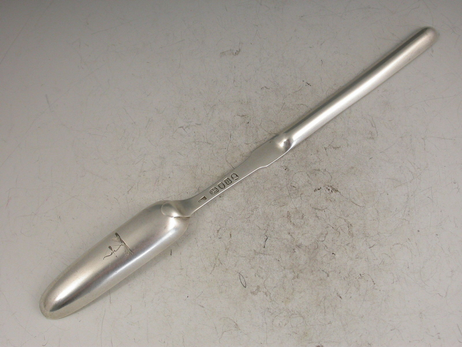 A good George III silver Marrow Scoop with two bowls and fiddle pattern stem, the larger bowl engraved with a crest of a bow and arrow.