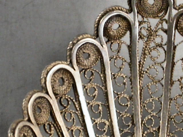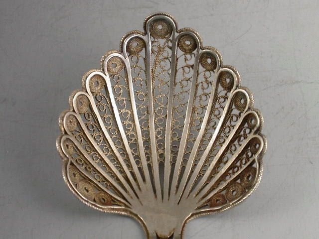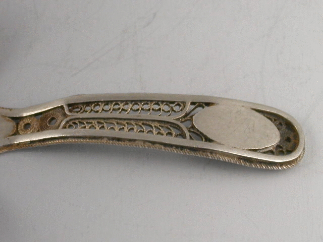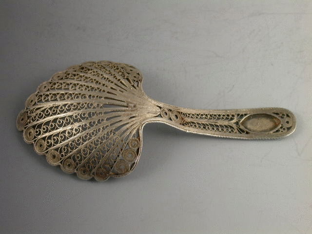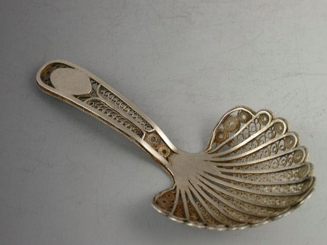 A George III Filigree Caddy Spoon made most probably in Birmingham circa 1800. The spoon has a beautiful fan shaped bowl and filigree handle with a plain disc cartouche at the top of the stem.
