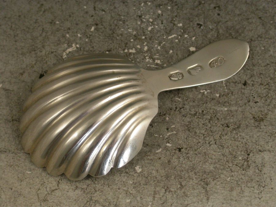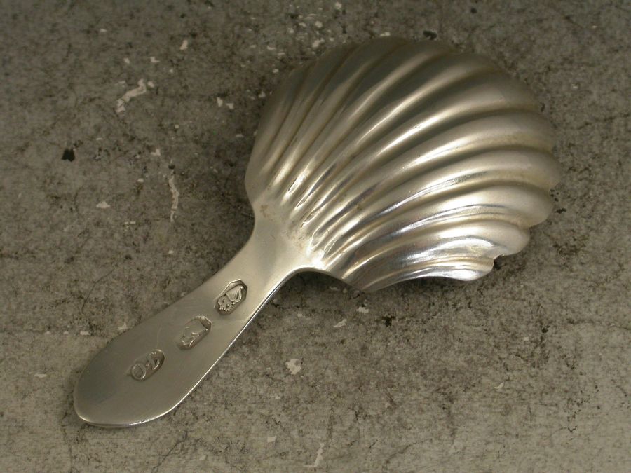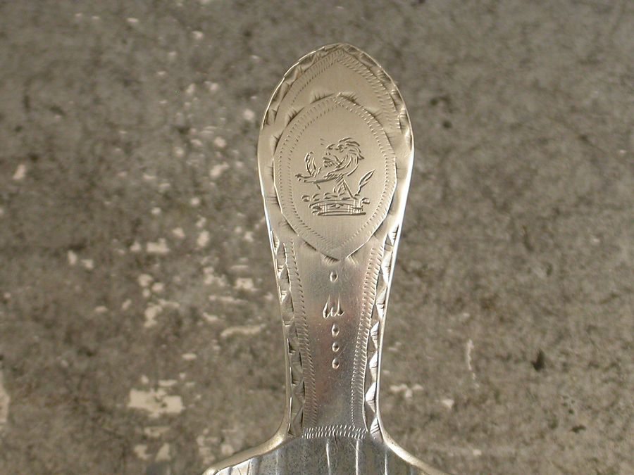 A rare George III Irish silver Caddy Spoon with unusual shell shaped bowl and bright-cut engraved Celtic point handle, the cartouche engraved with a crest of a demi lion rampant issuing out of a coronet.
