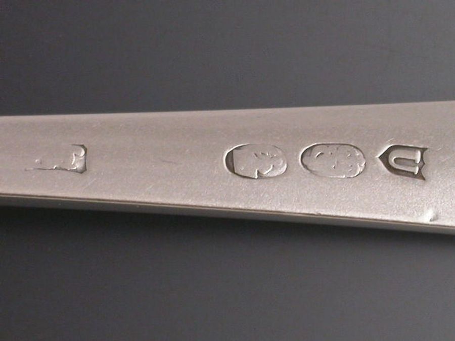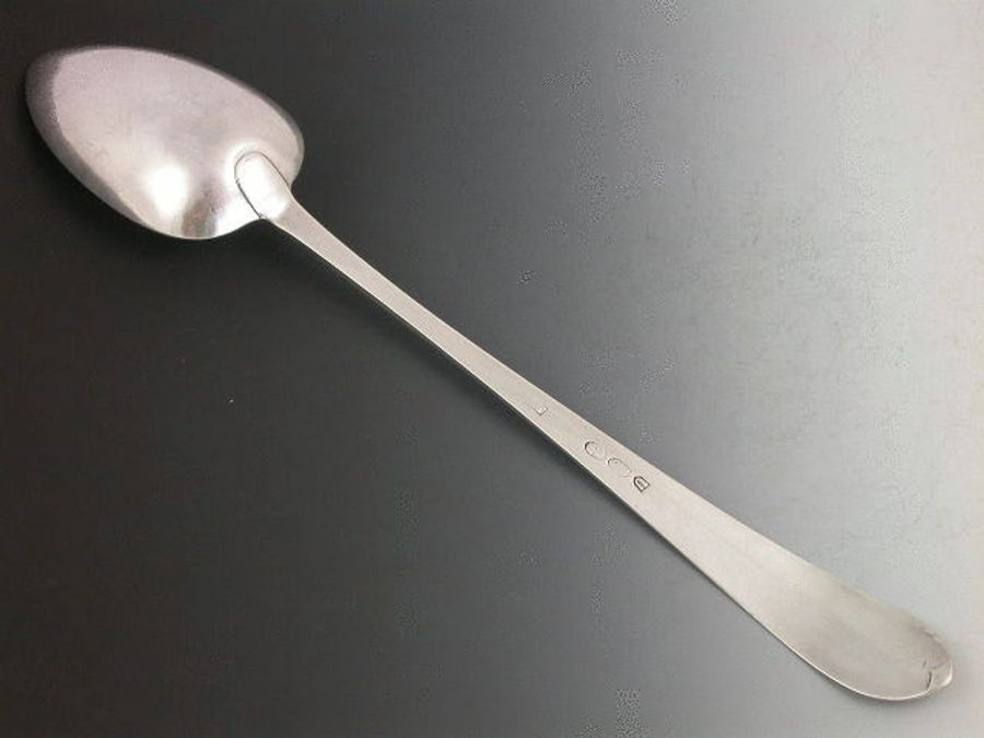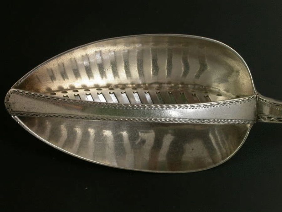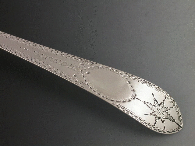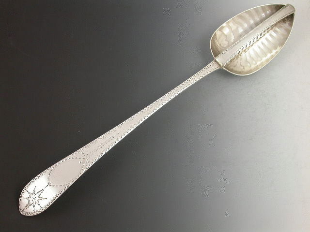 A very fine George III Irish silver Straining Spoon with bright cut engraved pointed Old English pattern handle with star and vacant cartouche.
