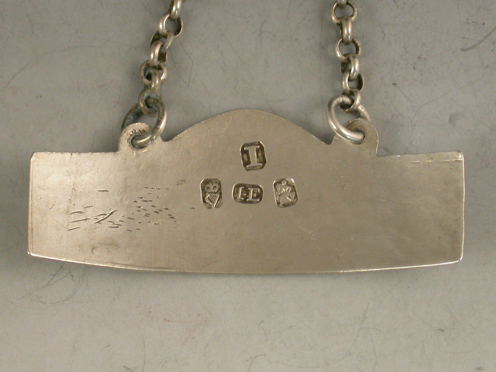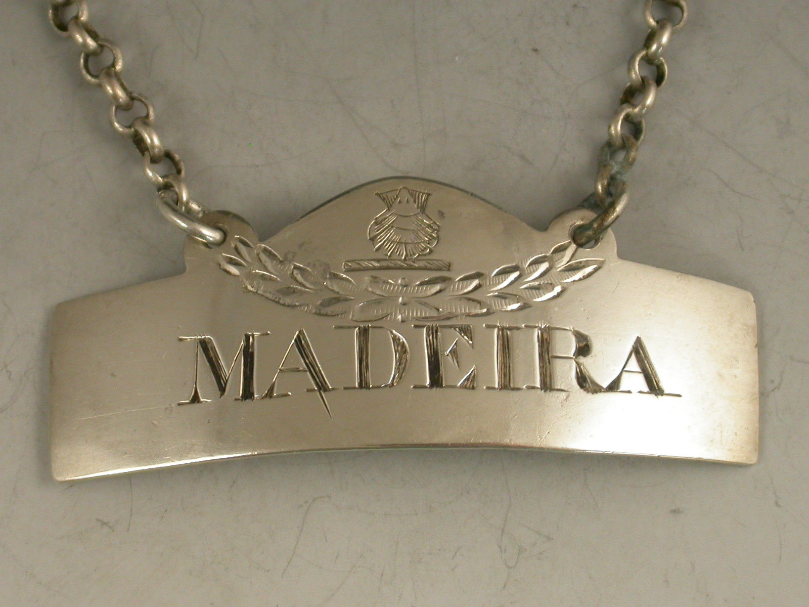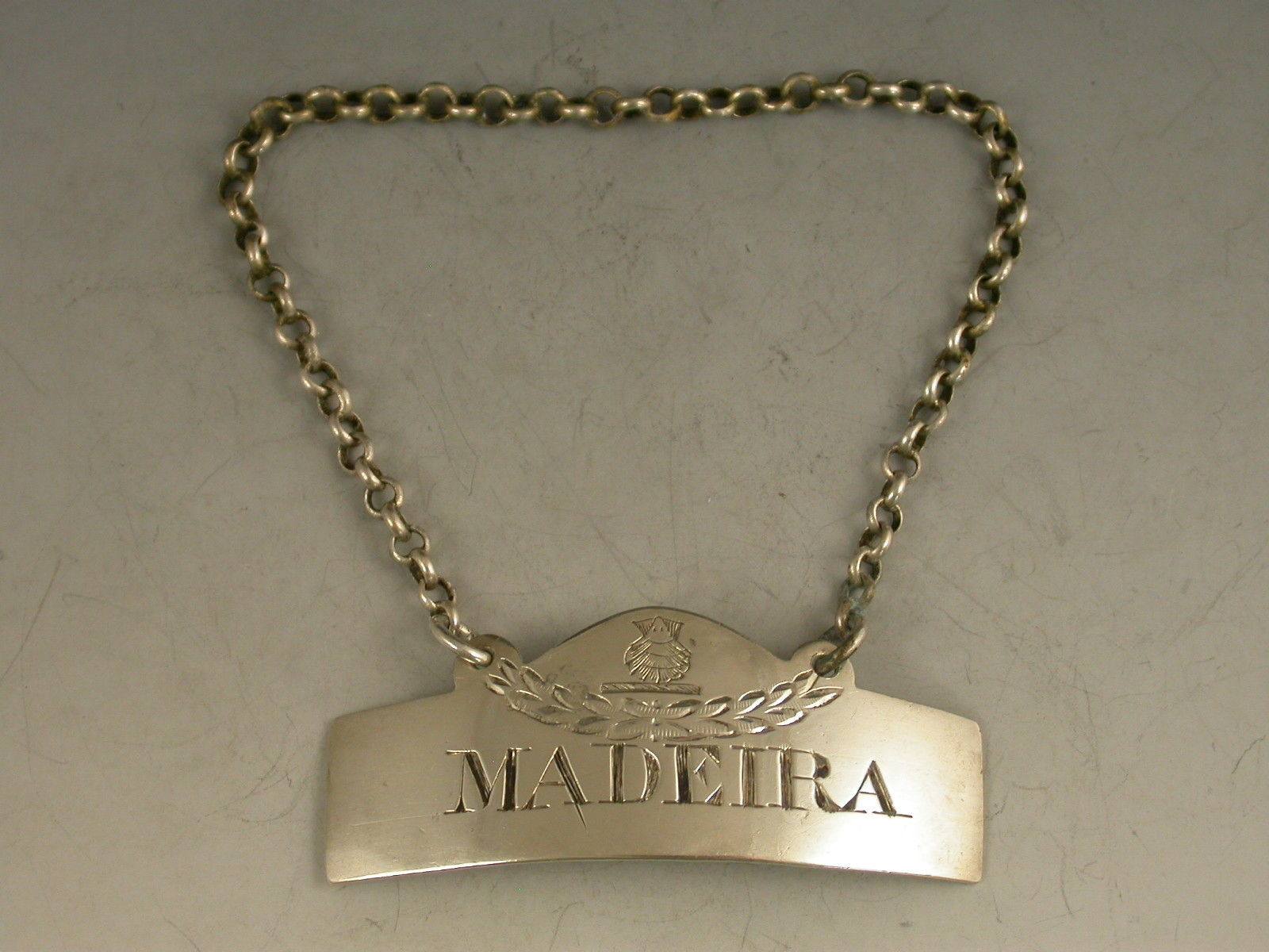 A good George III Irish silver Wine Label of typical plain narrow rectangular form with domed surmount and raised eyelets, incised for Madeira and engraved with a crest of an Escallop (scallop shell) above a festoon.