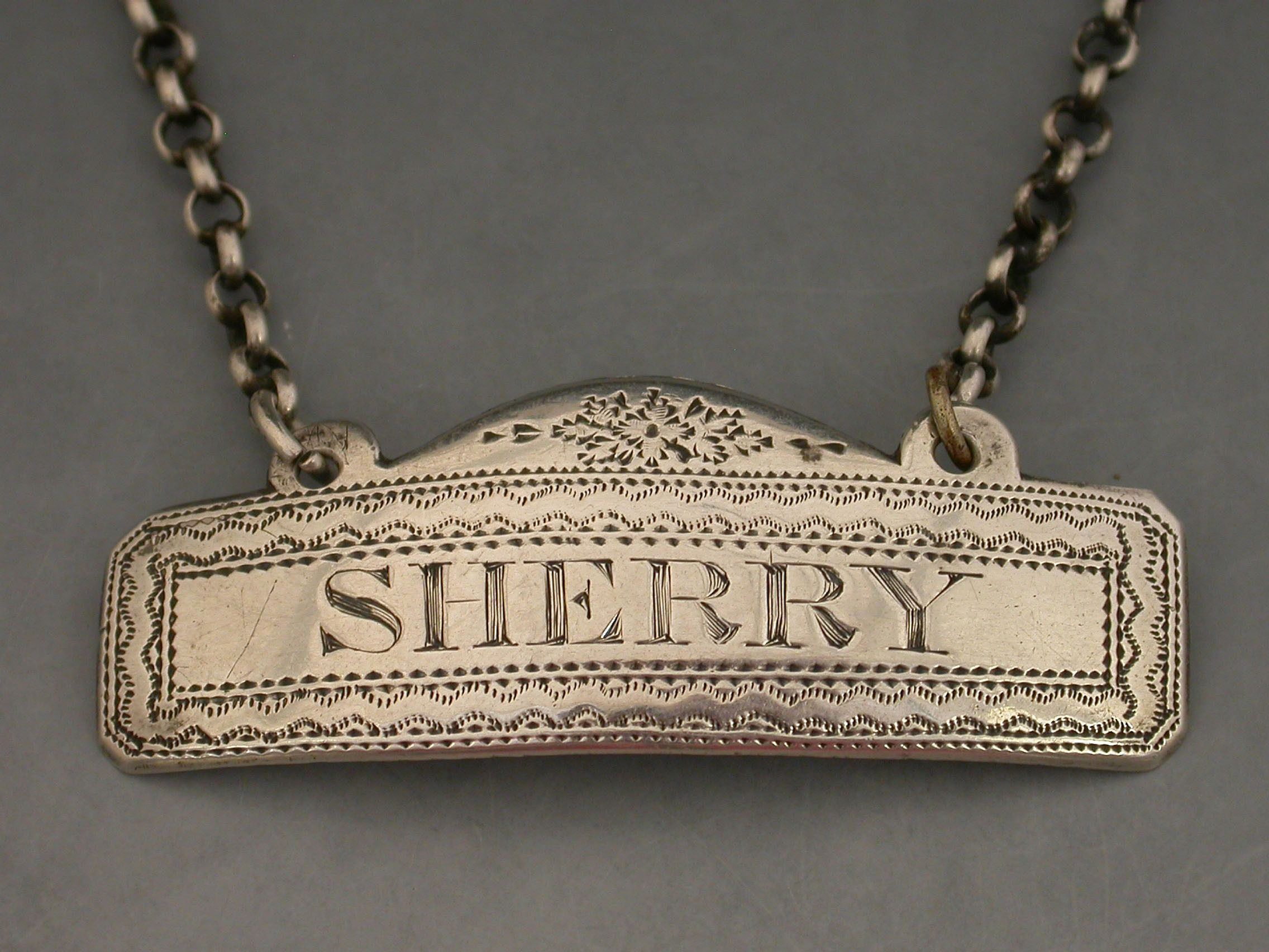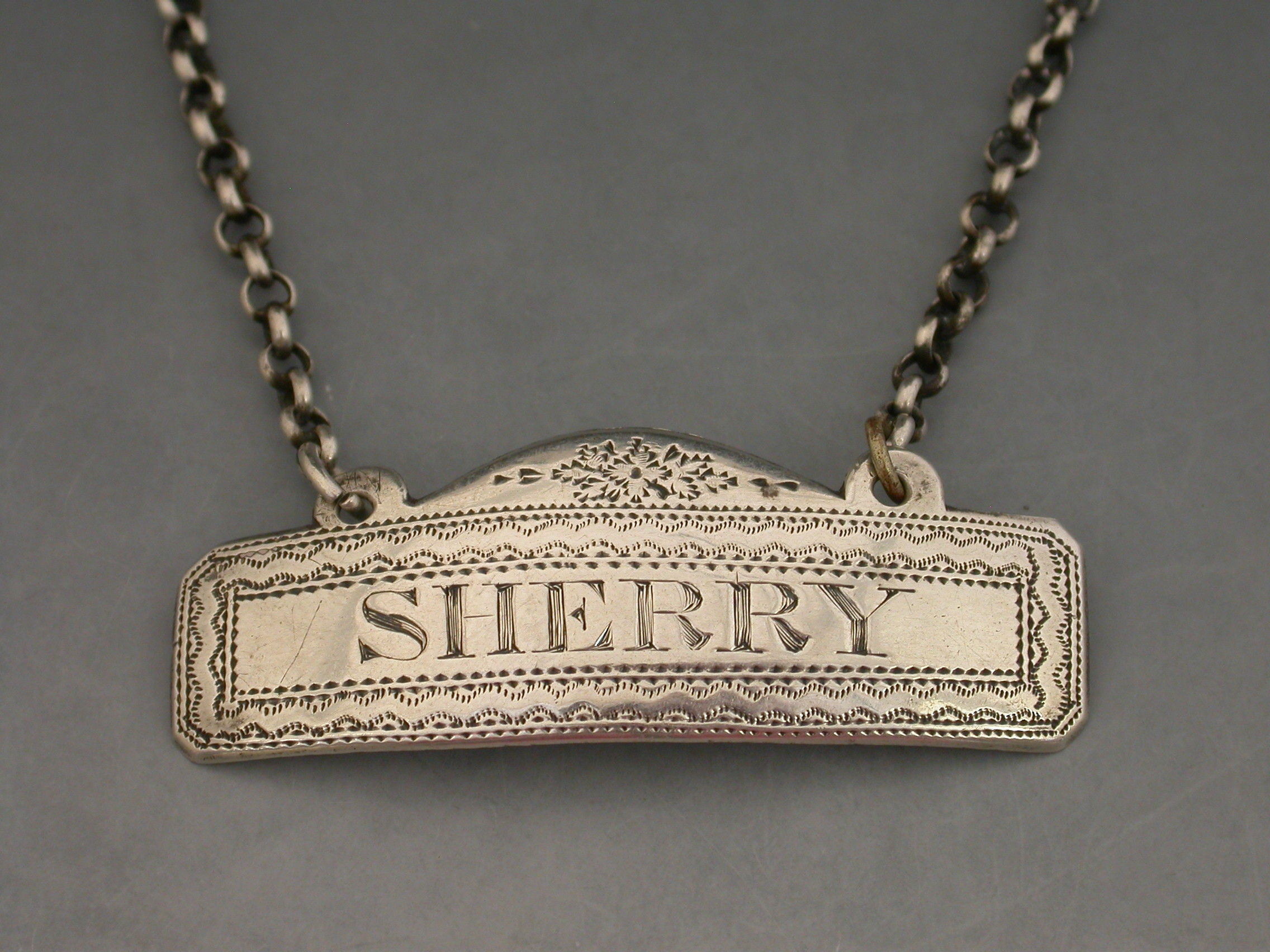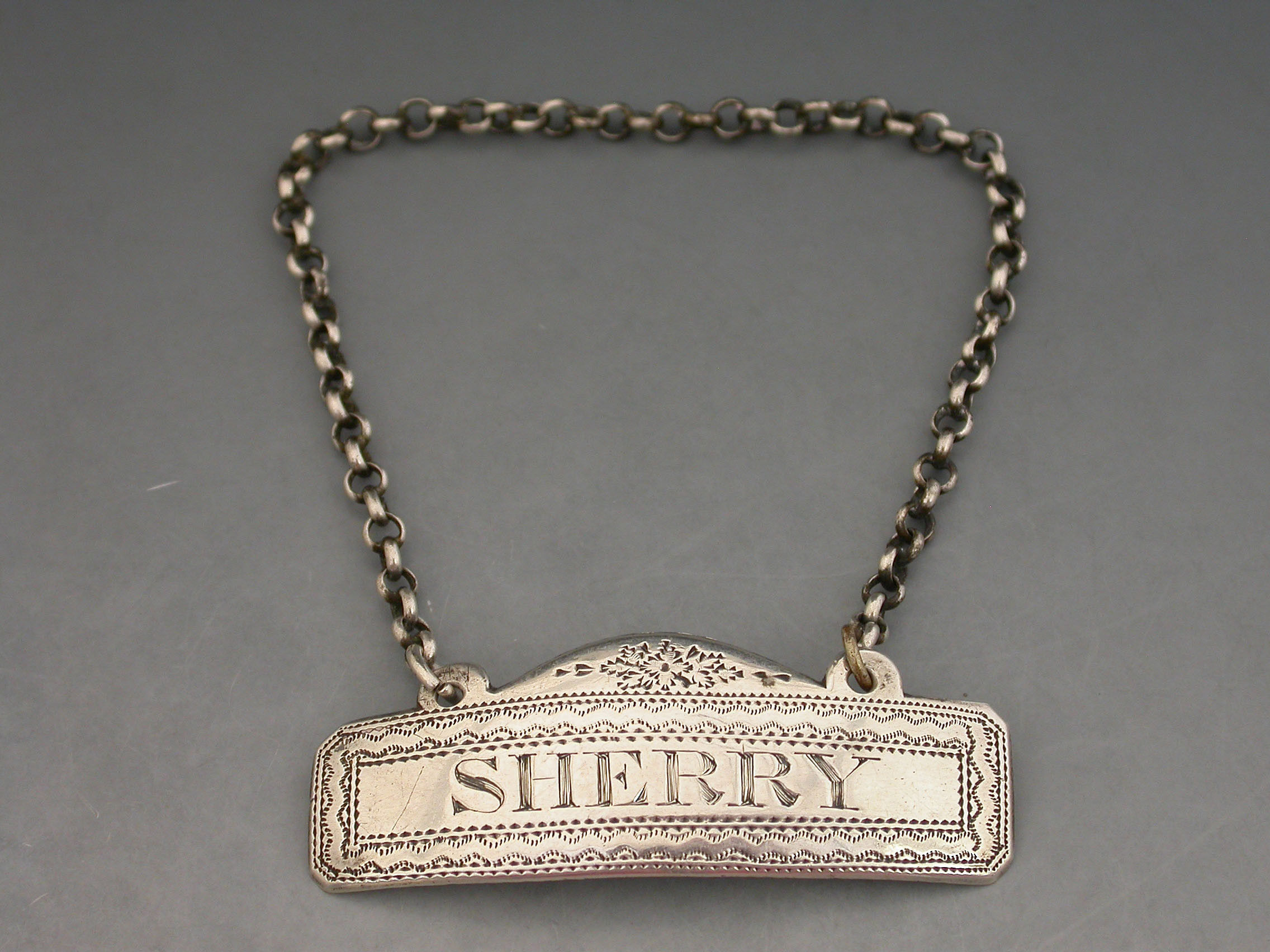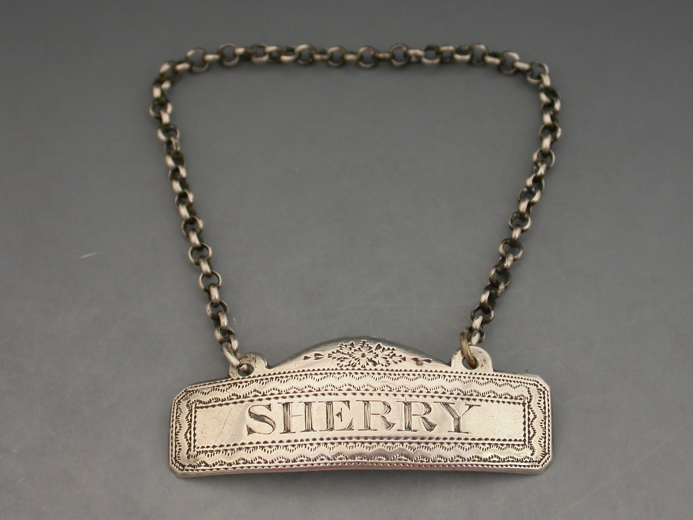 A good George III Irish silver Wine Label of typical narrow rectangular form with small cut-corners and domed surmount between raised eyelets, bright cut and wriggle work decoration, incised for Sherry.