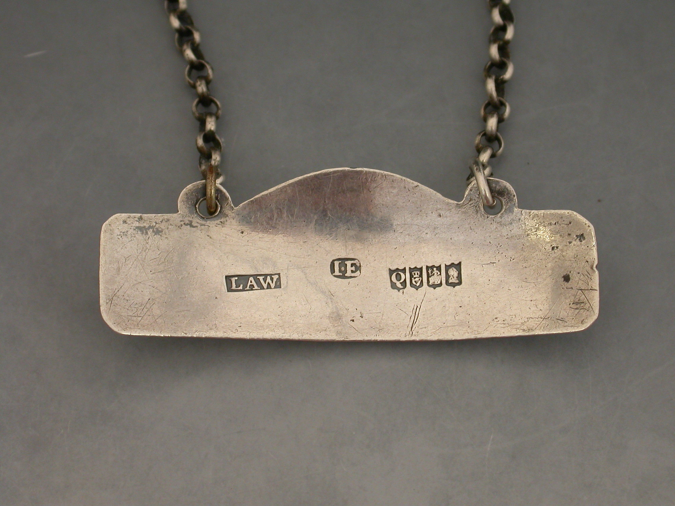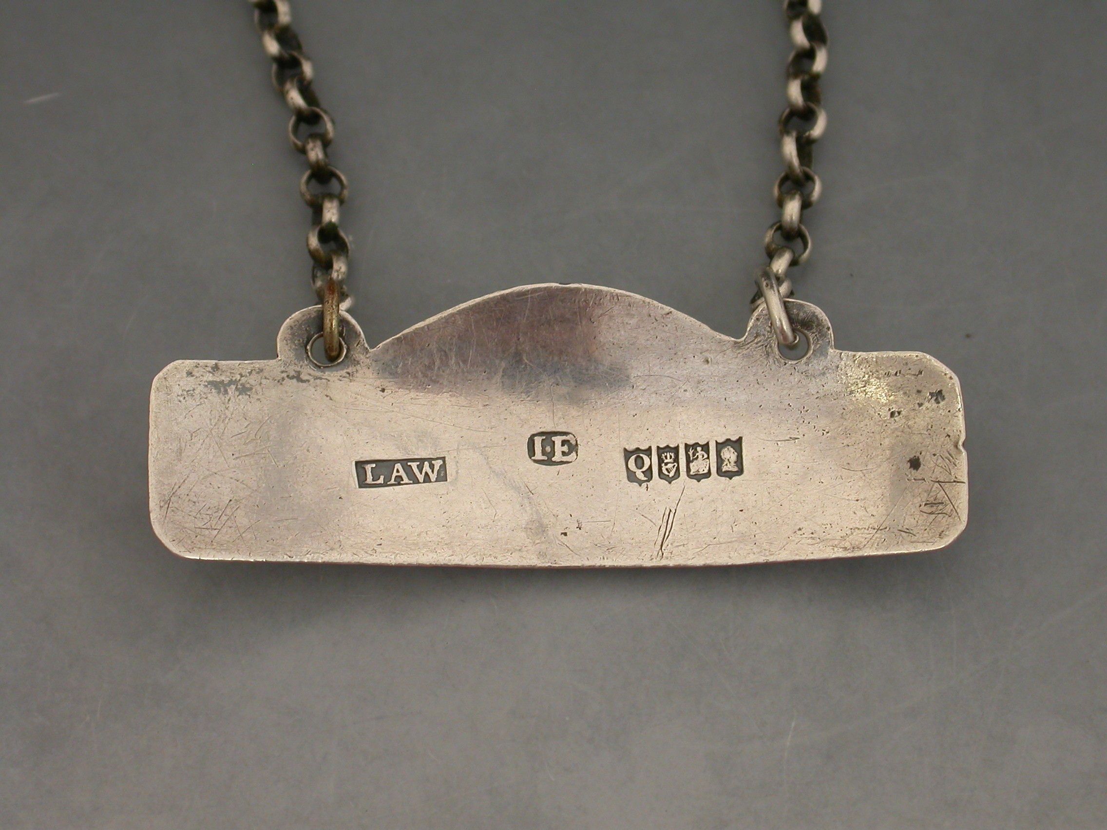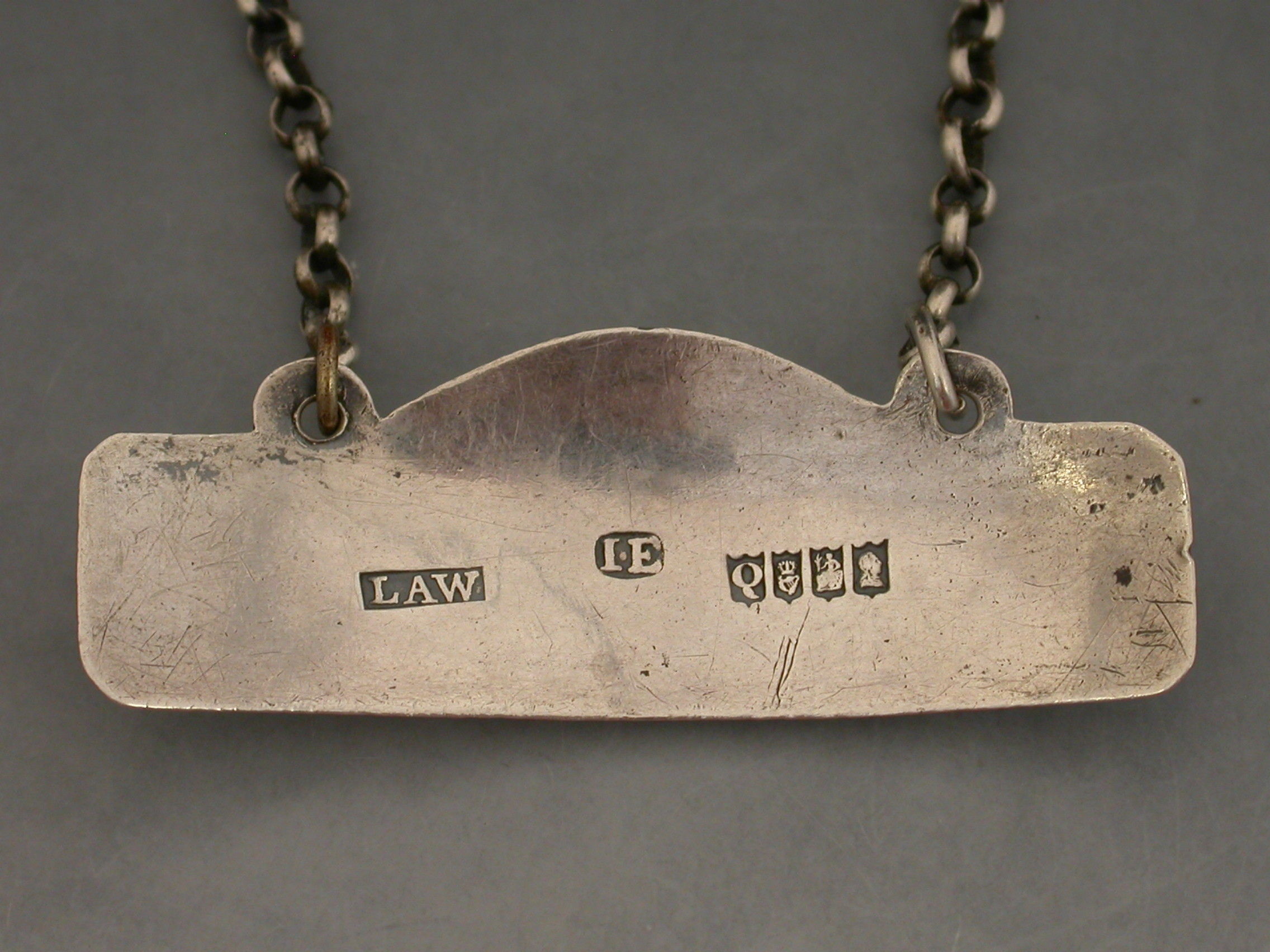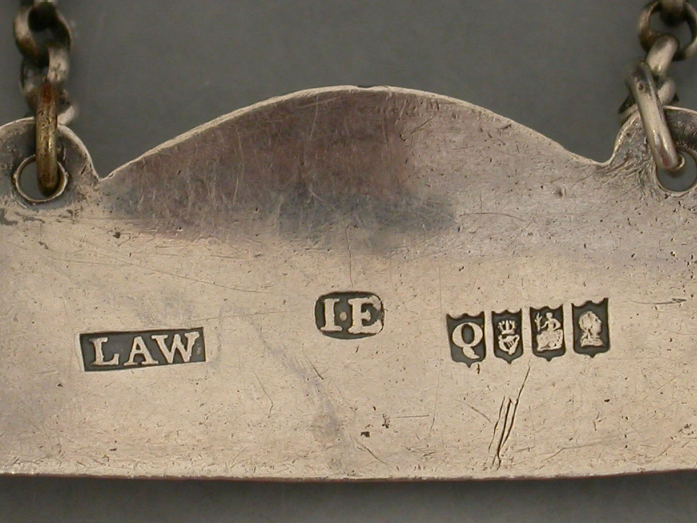 A good George III Irish silver Wine Label of typical narrow rectangular form with small cut-corners and domed surmount between raised eyelets, bright cut and wriggle work decoration, incised for Sherry.
