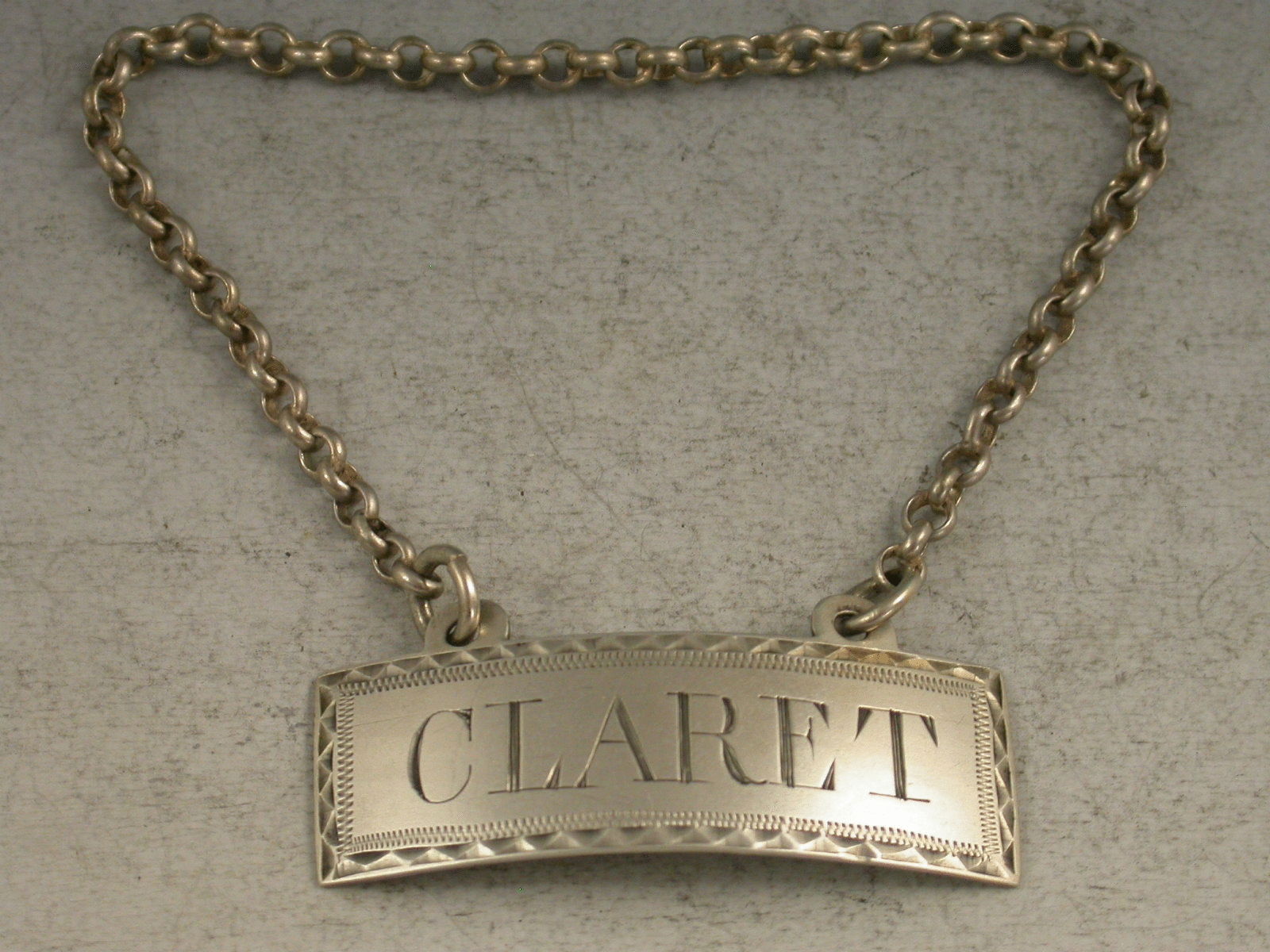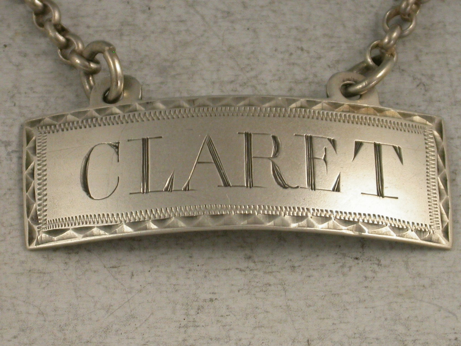 A good George III Irish silver Wine Label of curved rectangular form with raised eyelets and bright cut feather edge border, incised for Claret.