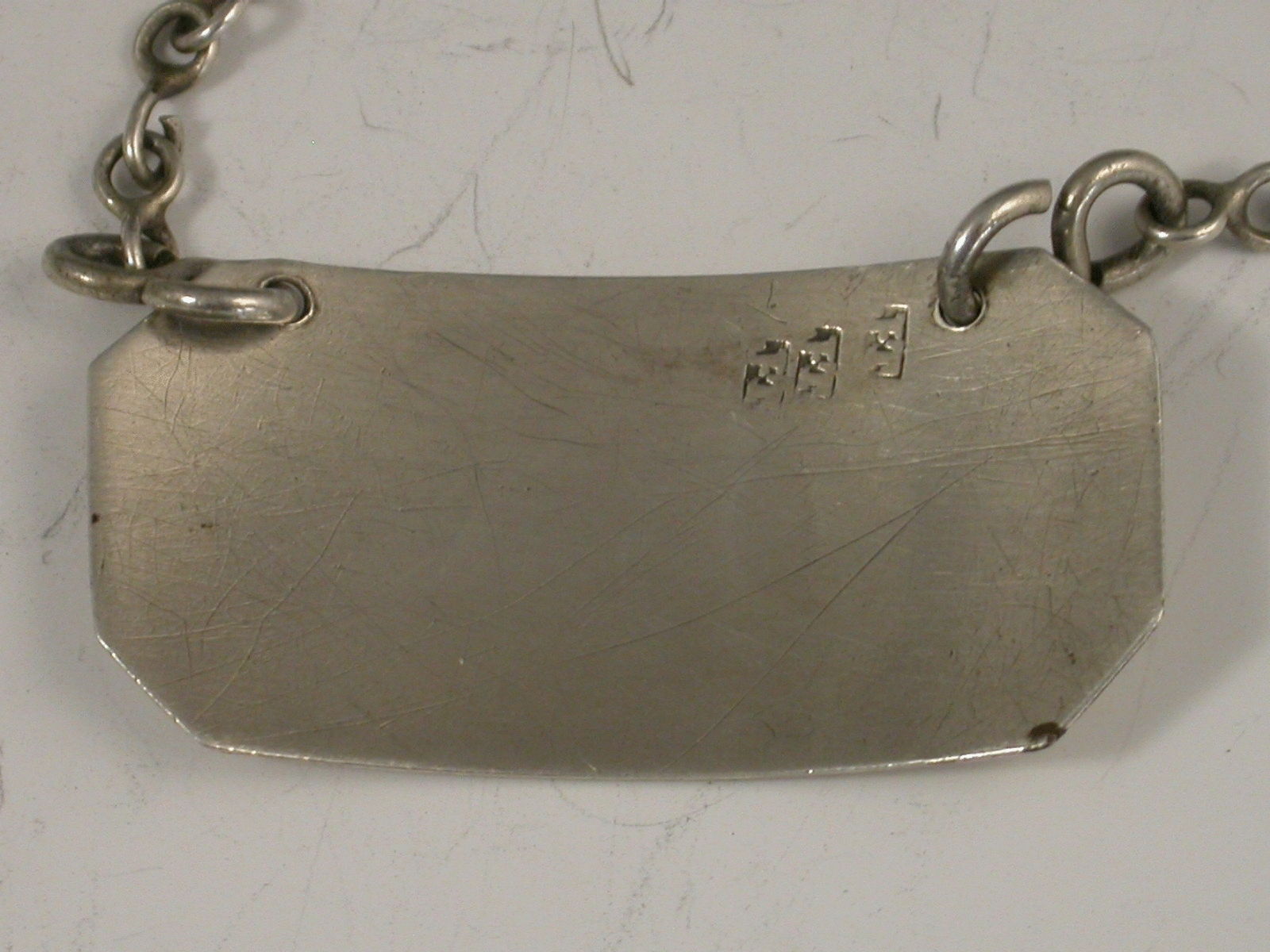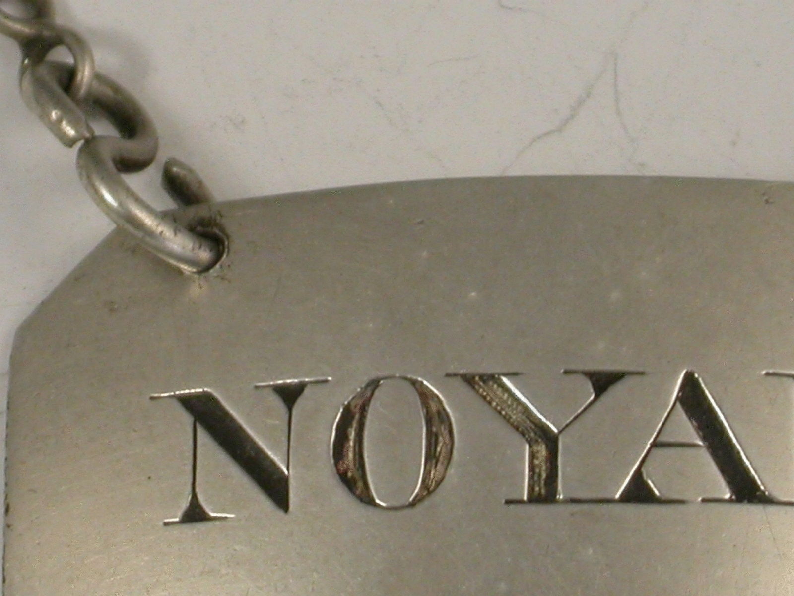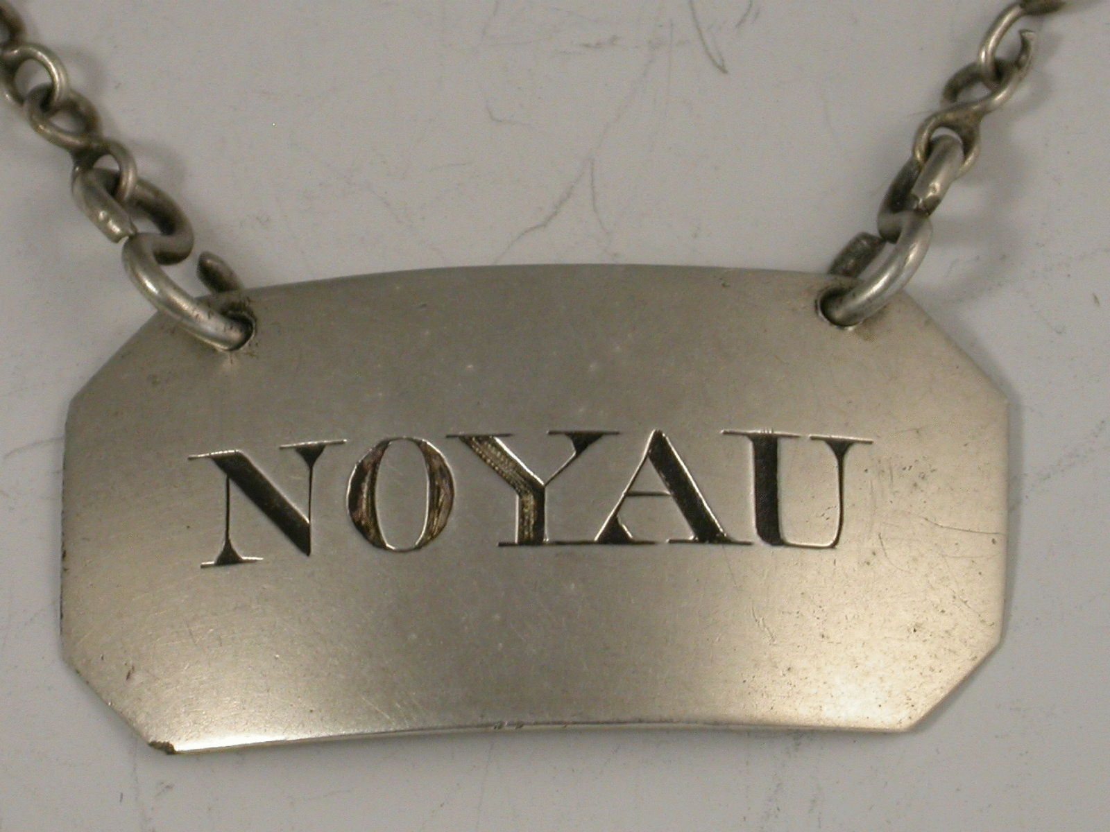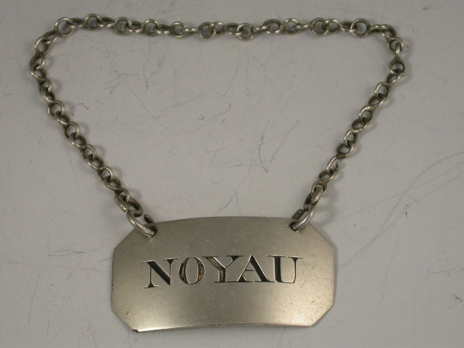 A rare George III Irish silver Wine Label of plain cut cornered rectangular form, incised for Noyau, a liqueur made from brandy flavoured with nut kernels.