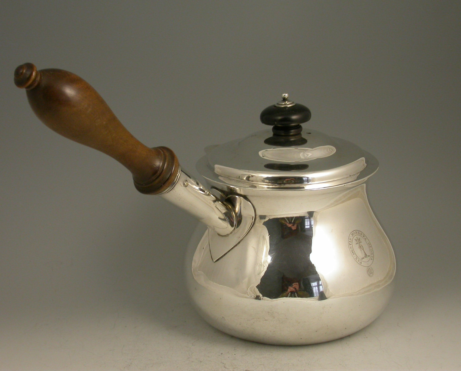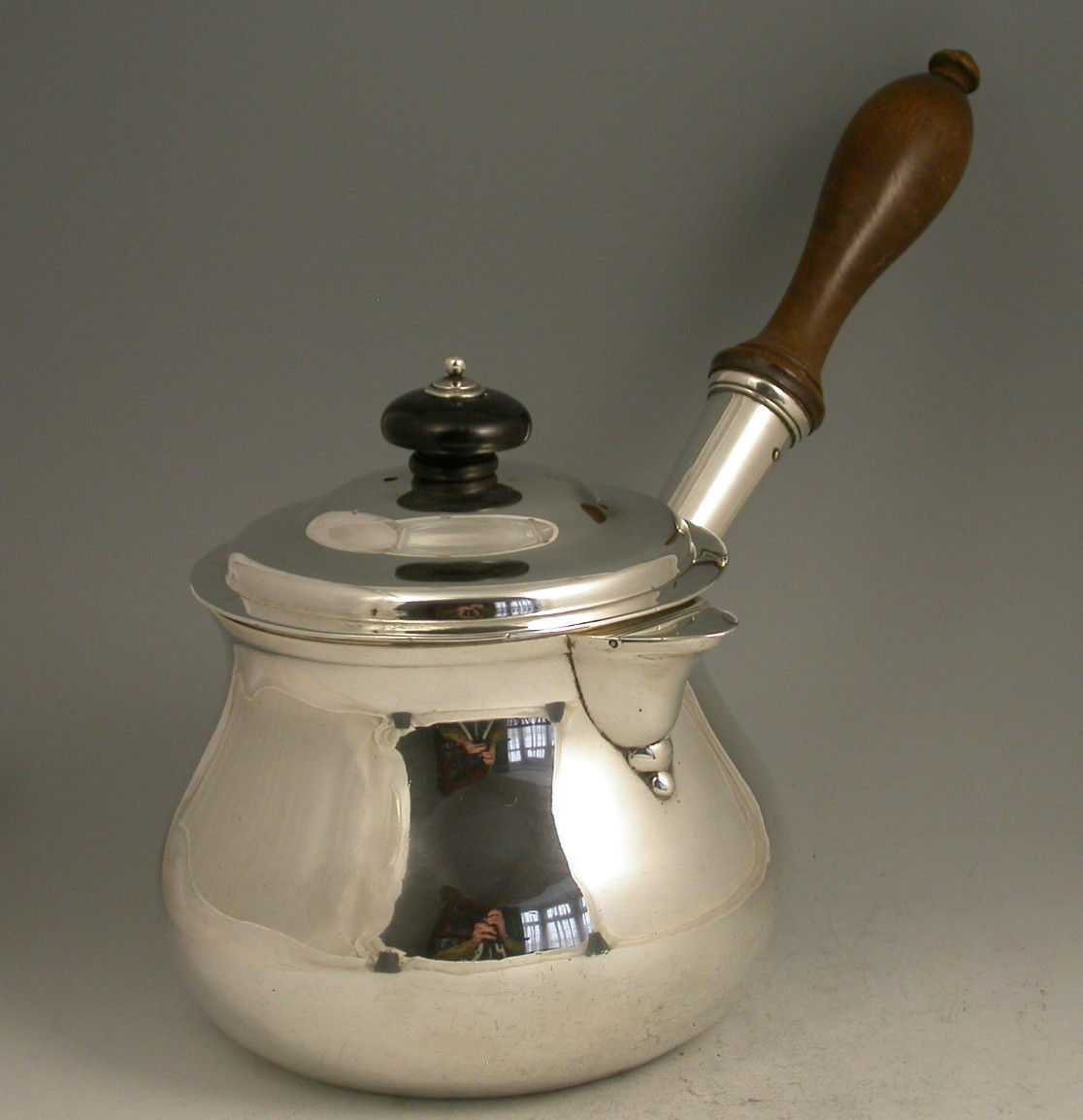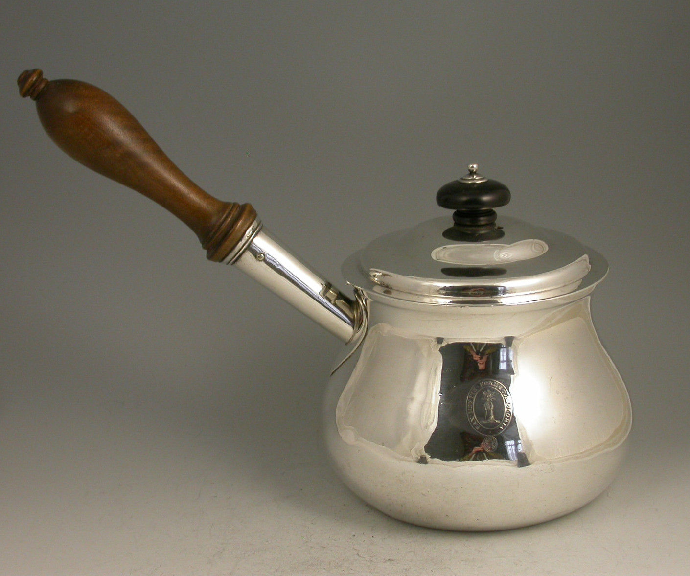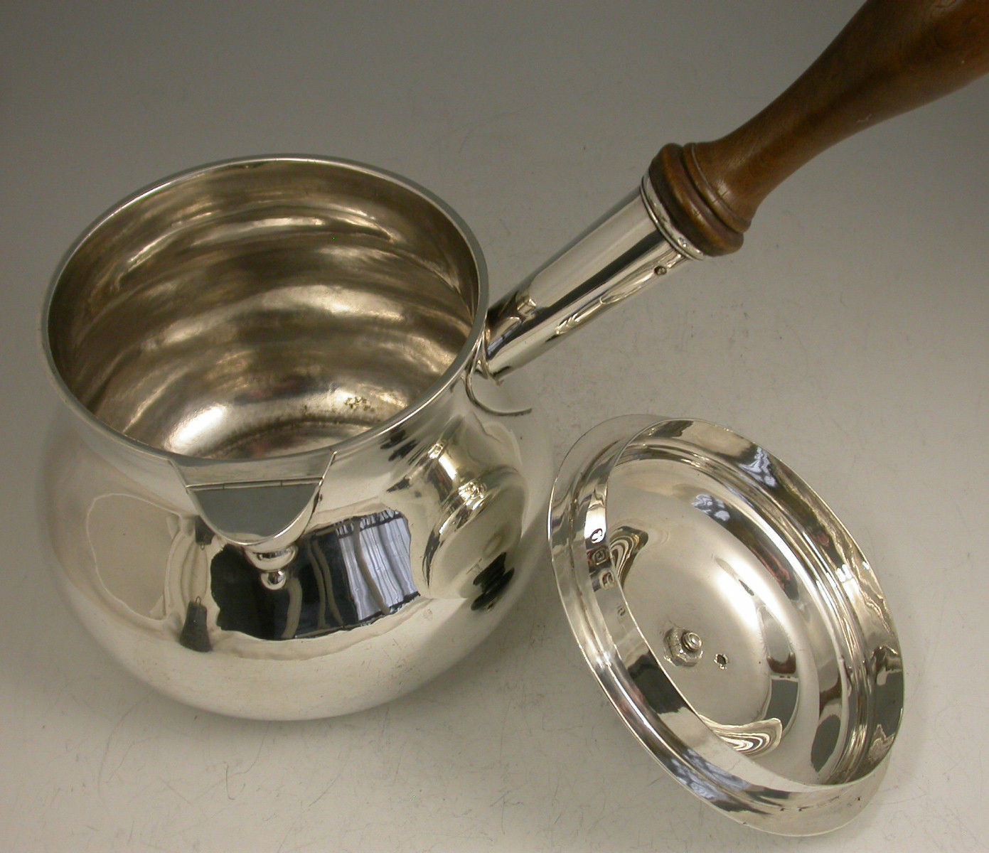 A good George III silver Brandy Saucepan of a large size and plain baluster shape, with attached baluster shaped turned wooden handle, the bowl complete with domed lift off lid with turned wooden knop and hinged covered spout, the body engraved with the crest, badge and motto of a Scottish Baronet.