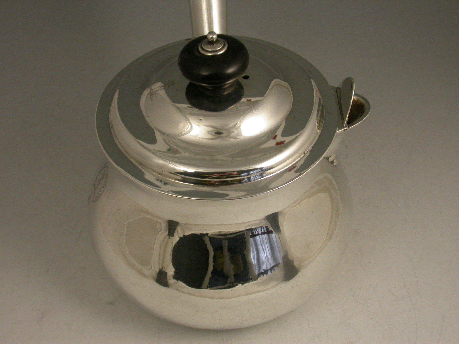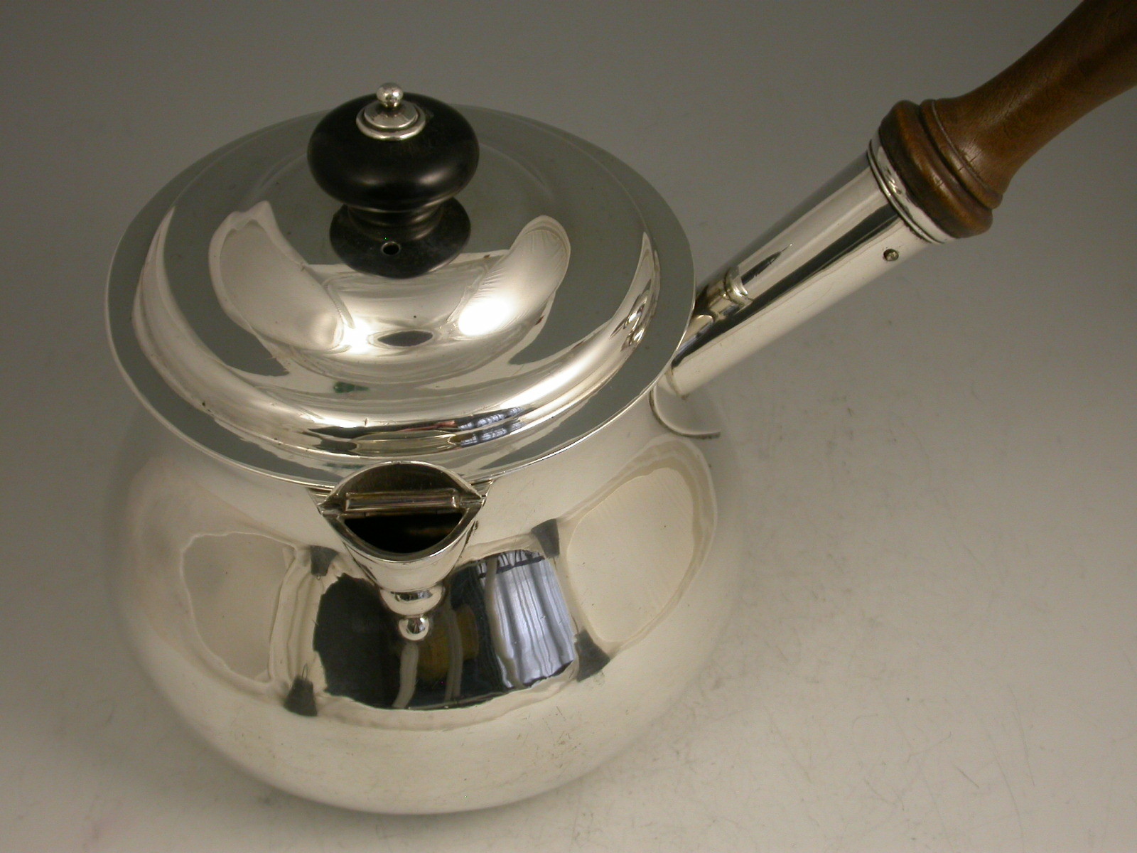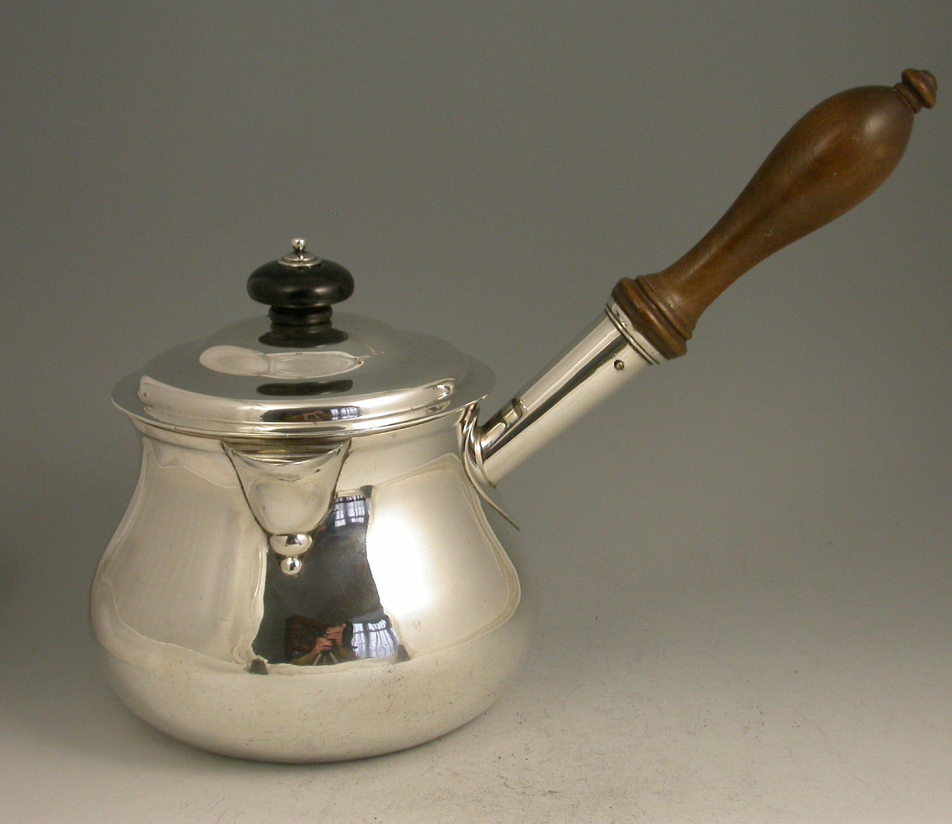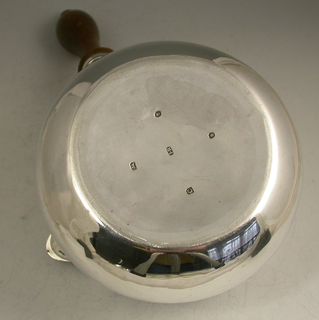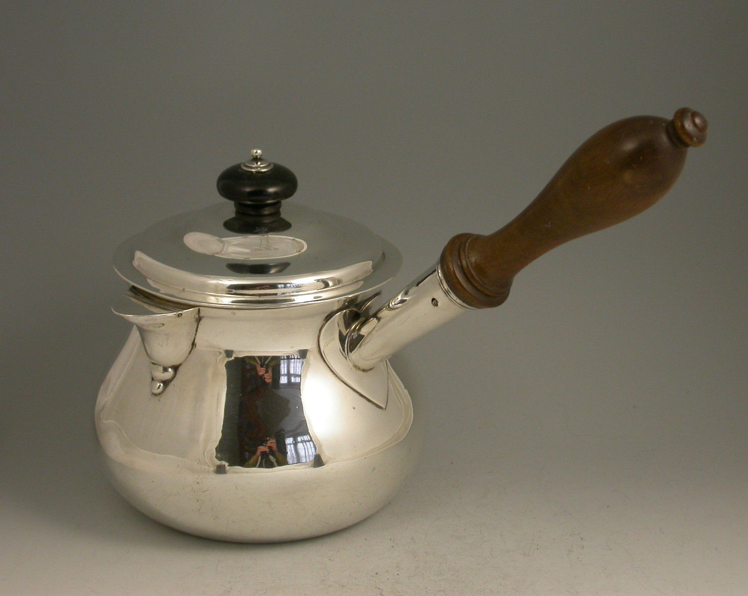 A good George III silver Brandy Saucepan of a large size and plain baluster shape, with attached baluster shaped turned wooden handle, the bowl complete with domed lift off lid with turned wooden knop and hinged covered spout, the body engraved with the crest, badge and motto of a Scottish Baronet.