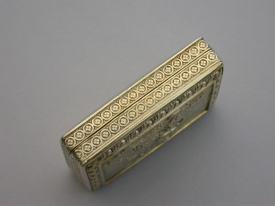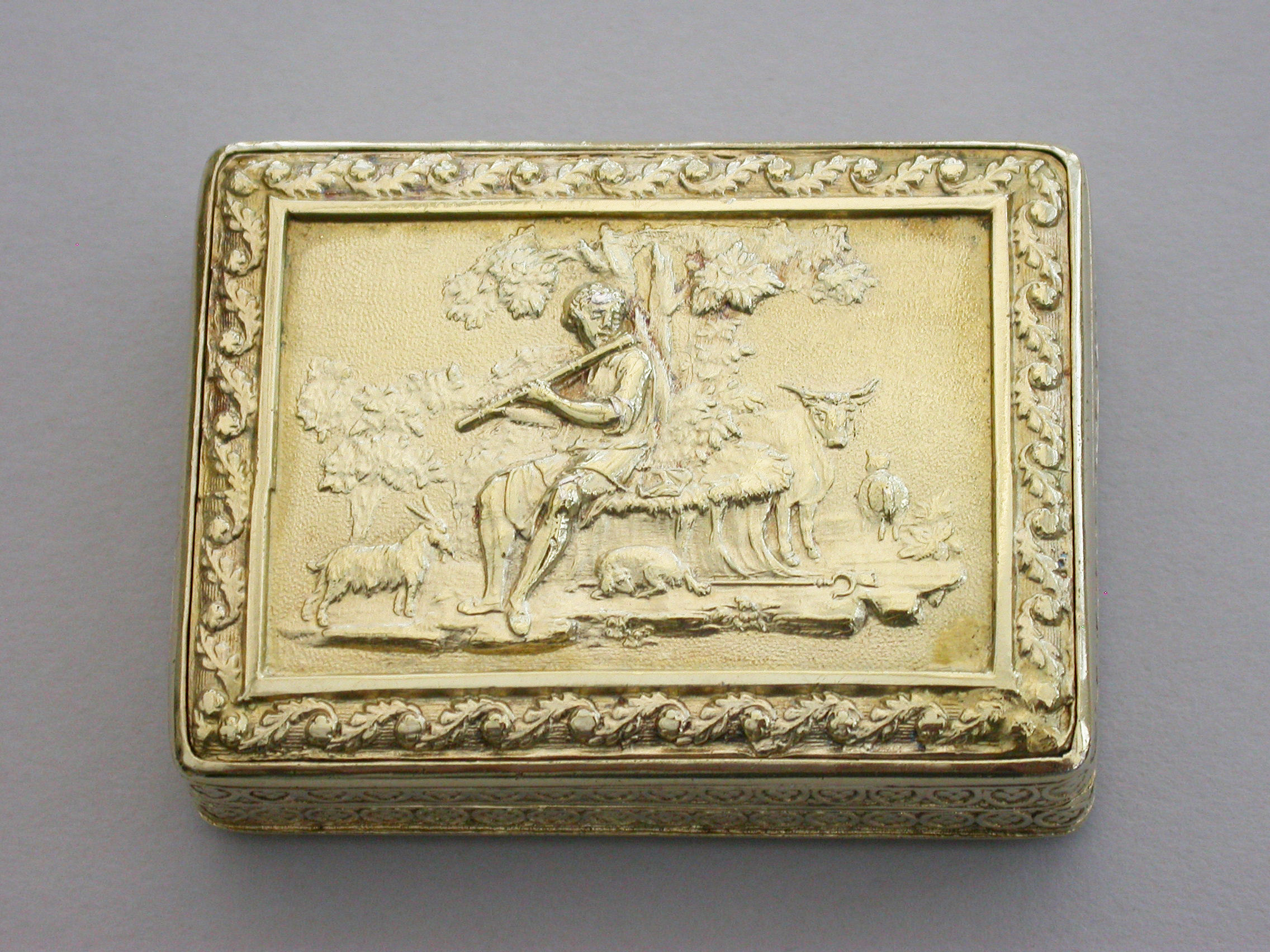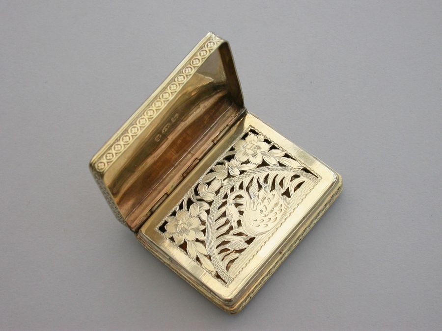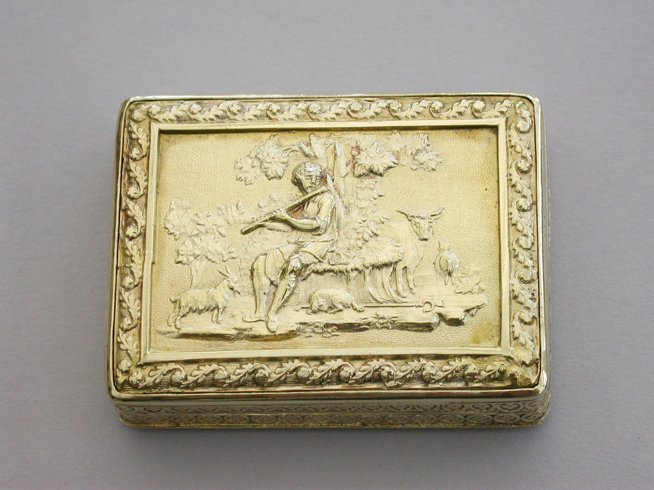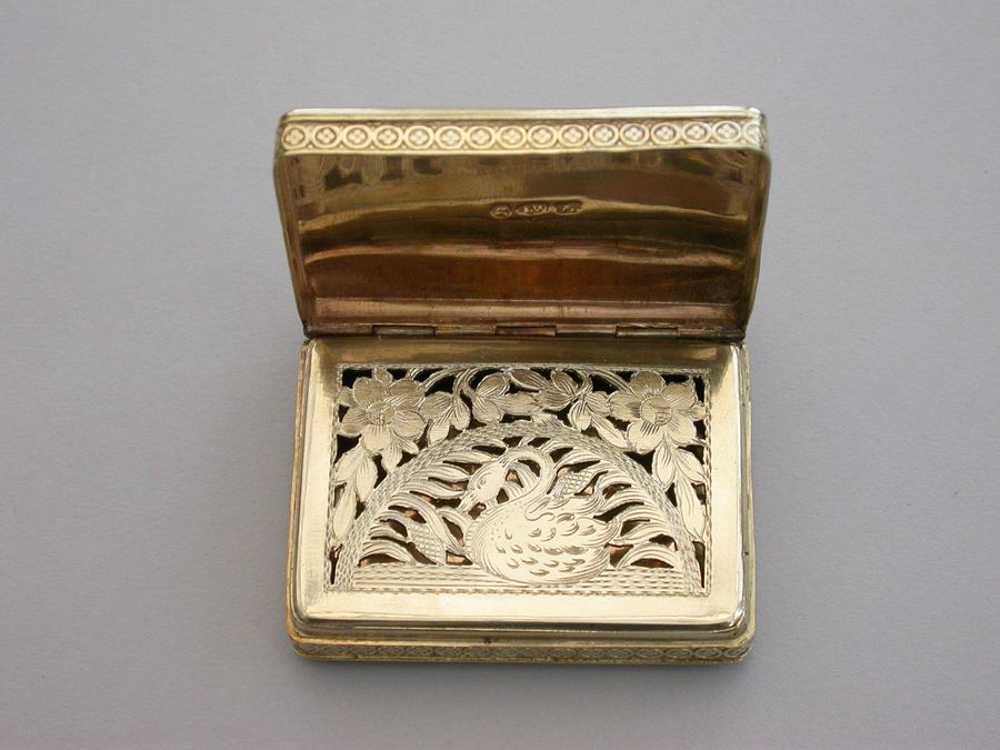 An exceptional George III silver gilt Vinaigrette of very large size and rectangular form with raised foliate borders, the plain base with engraved foliate border, the lid with a raised chased scene on a matt background depicting a Shepherd Boy playing a flute surrounded by farm animals. The interior with superbly pierced grille depicting a swan swimming beneath an arch with flowers above.