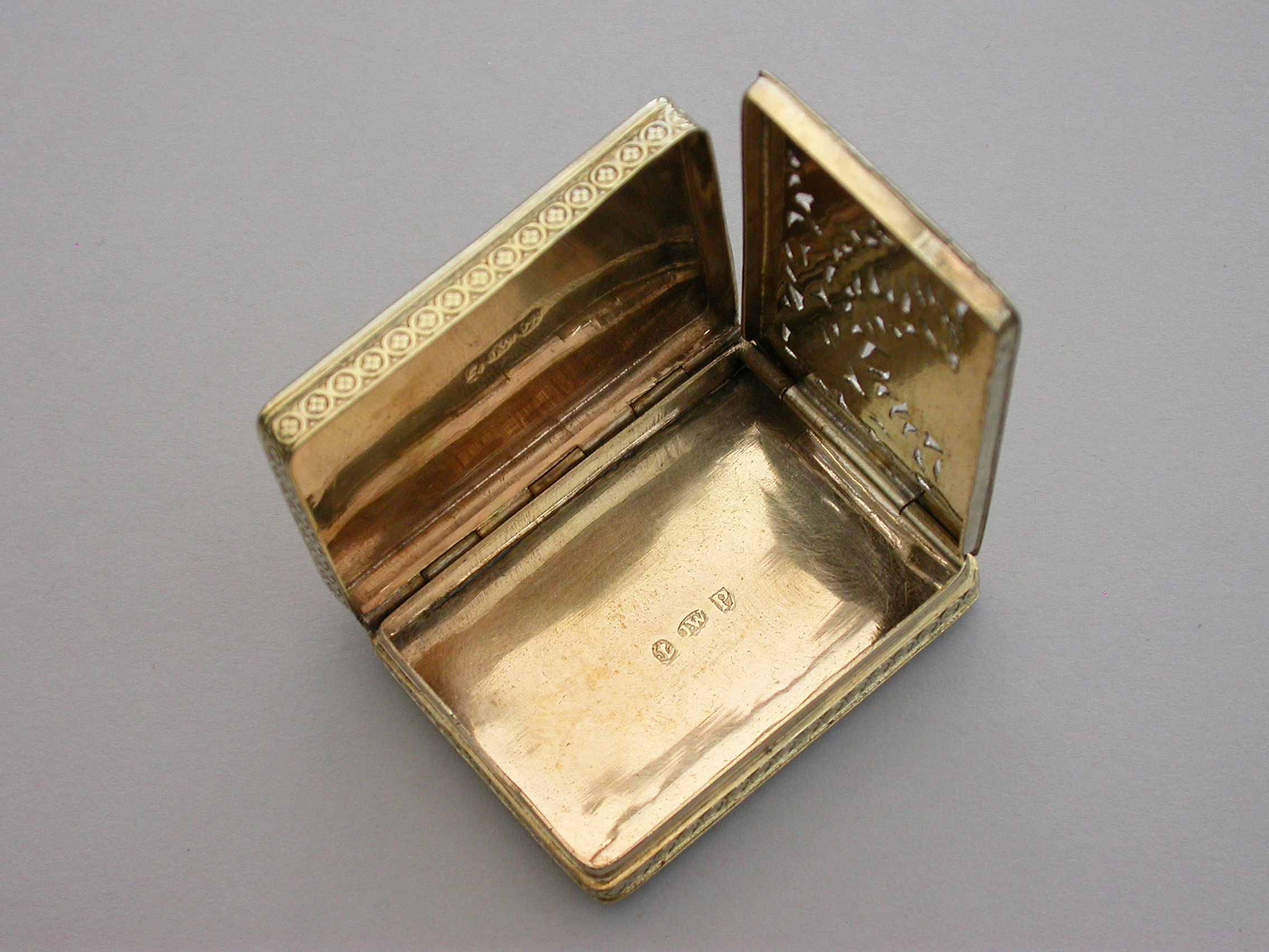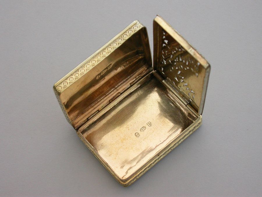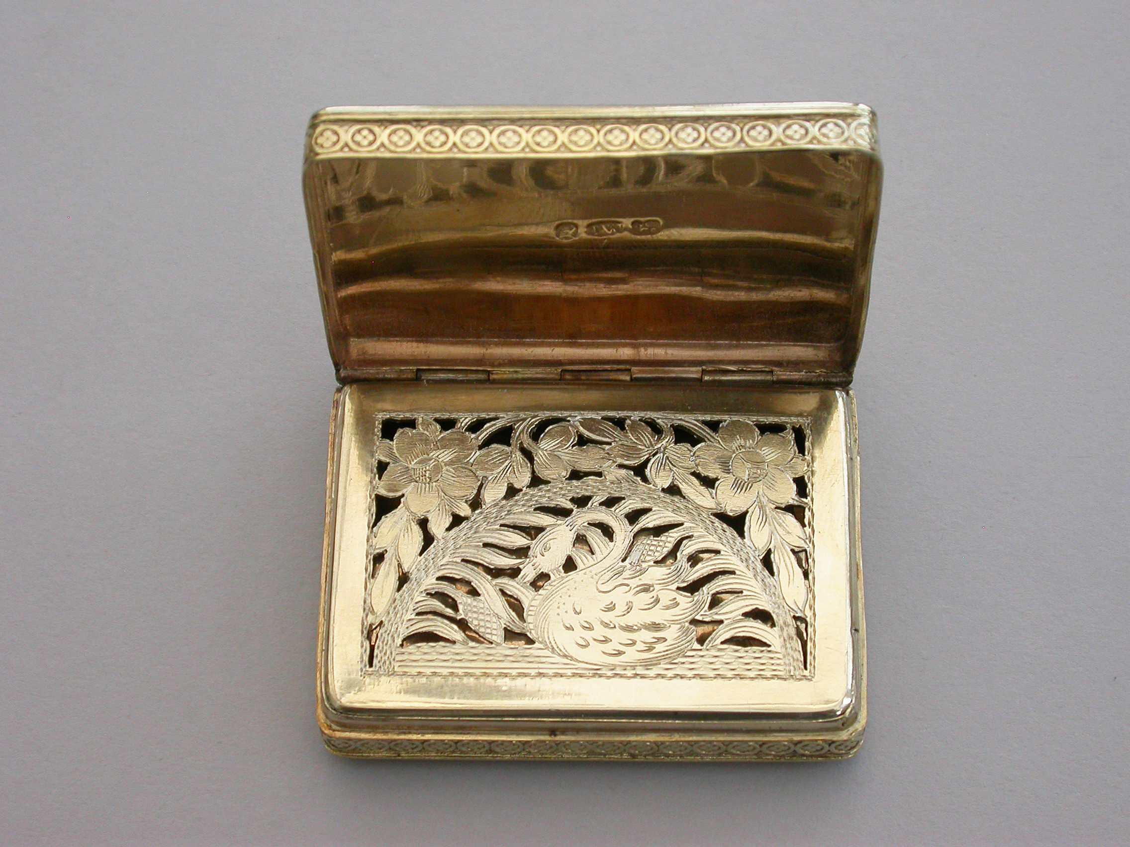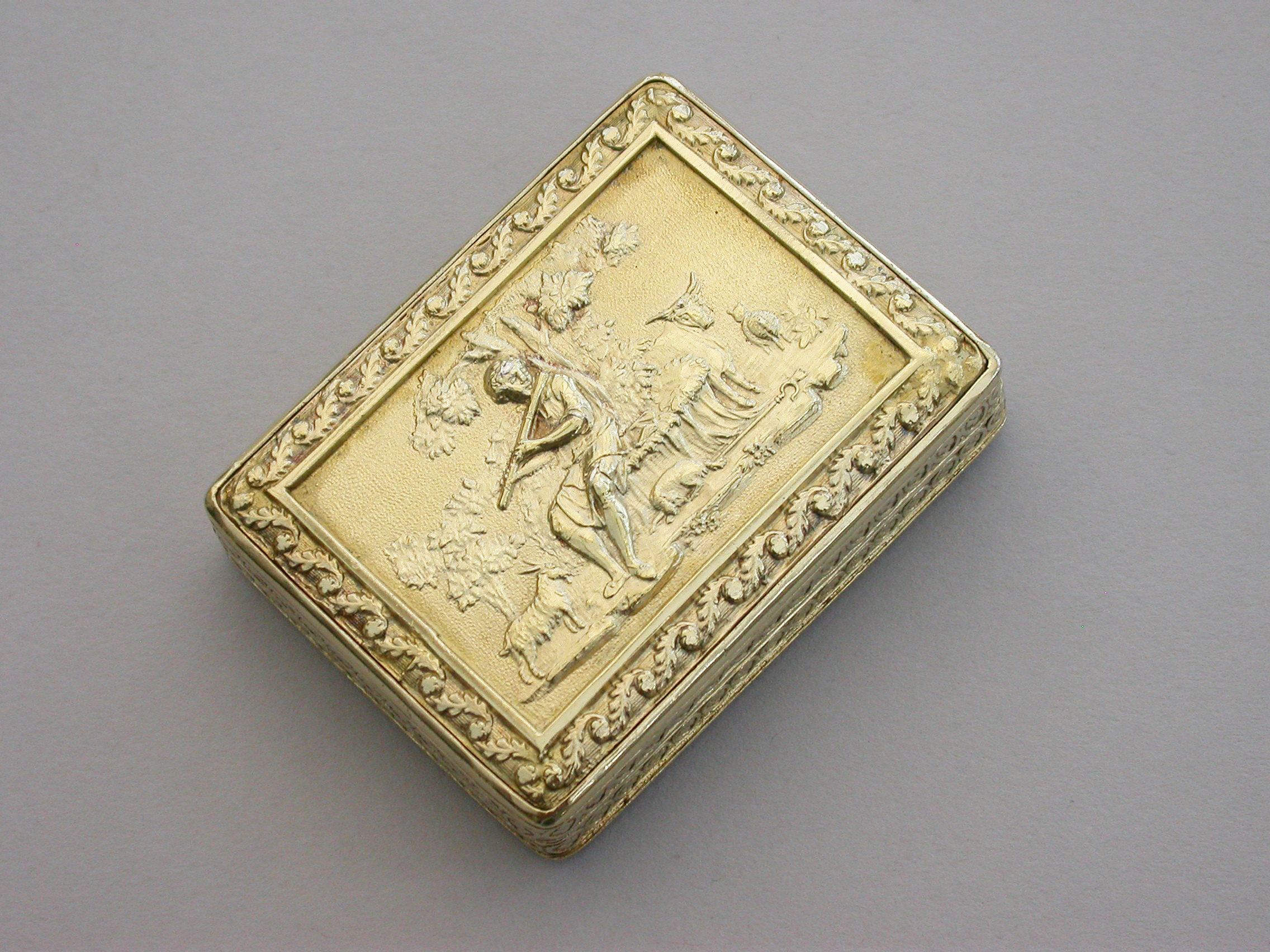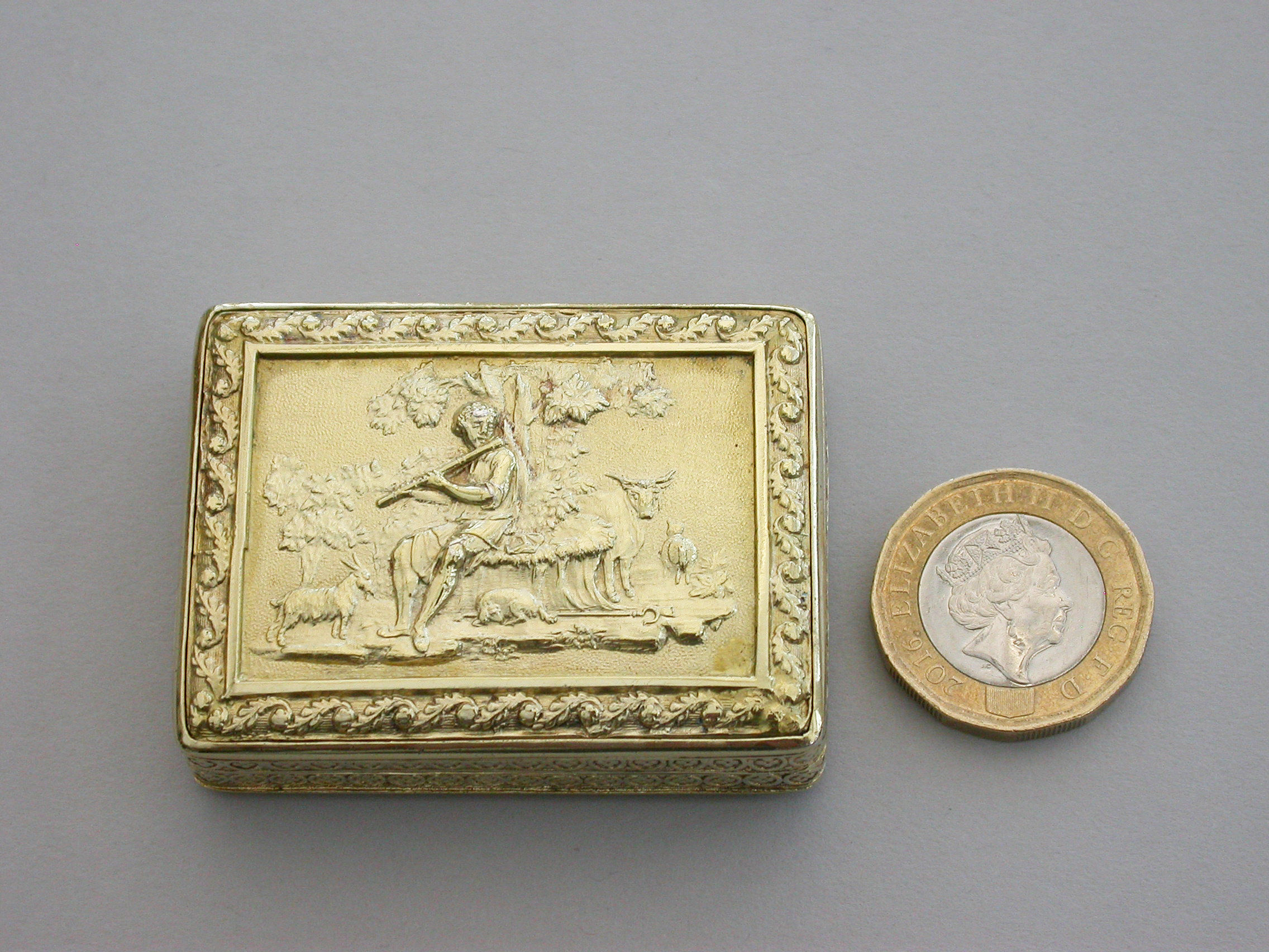 An exceptional George III silver gilt Vinaigrette of very large size and rectangular form with raised foliate borders, the plain base with engraved foliate border, the lid with a raised chased scene on a matt background depicting a Shepherd Boy playing a flute surrounded by farm animals. The interior with superbly pierced grille depicting a swan swimming beneath an arch with flowers above.