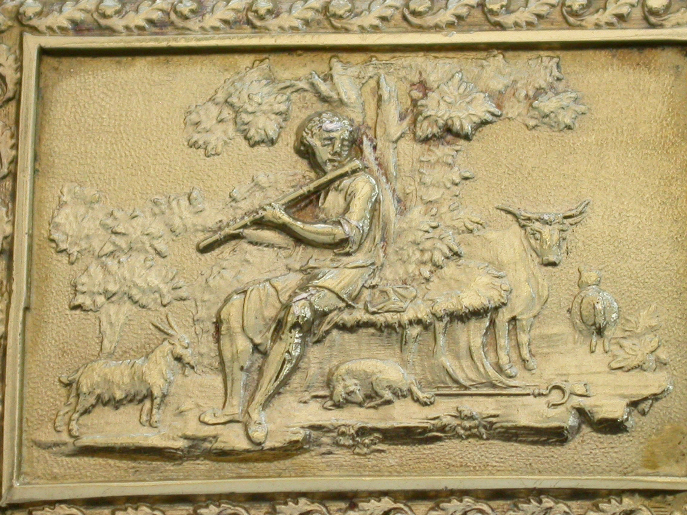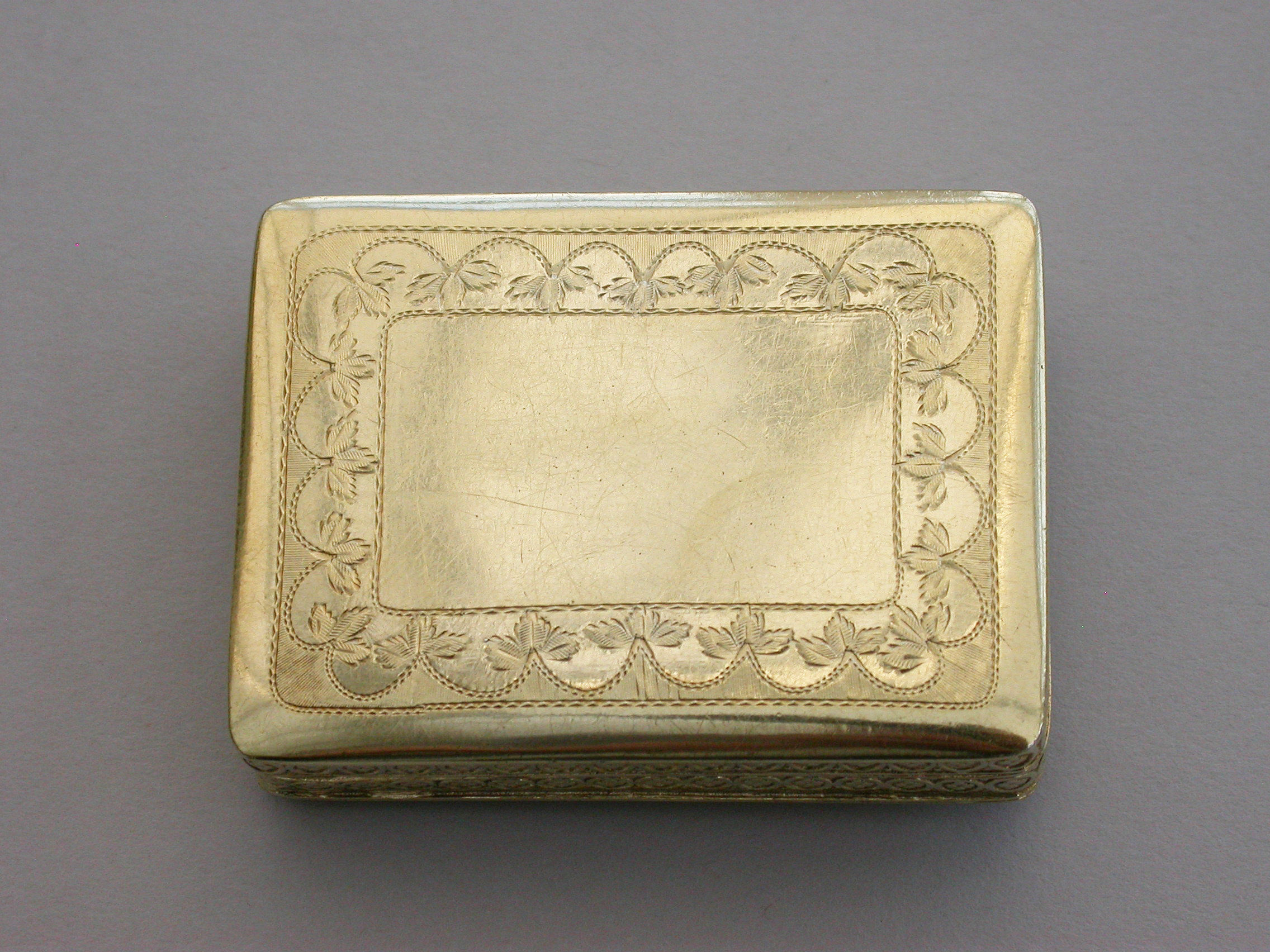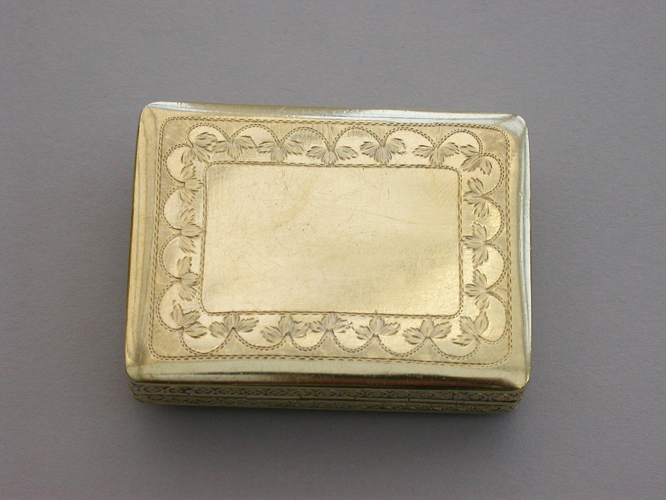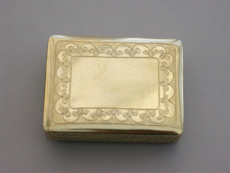 An exceptional George III silver gilt Vinaigrette of very large size and rectangular form with raised foliate borders, the plain base with engraved foliate border, the lid with a raised chased scene on a matt background depicting a Shepherd Boy playing a flute surrounded by farm animals. The interior with superbly pierced grille depicting a swan swimming beneath an arch with flowers above.