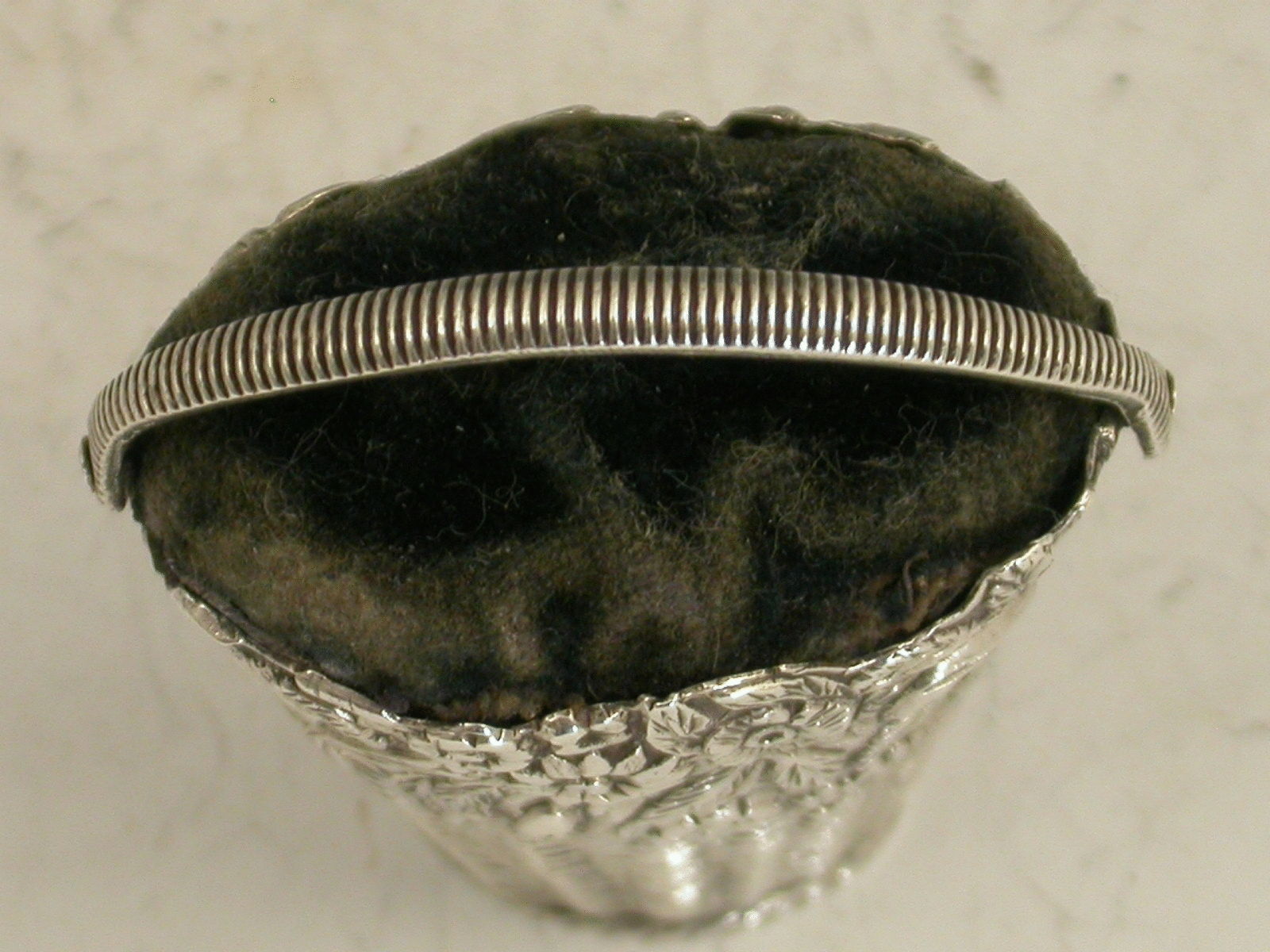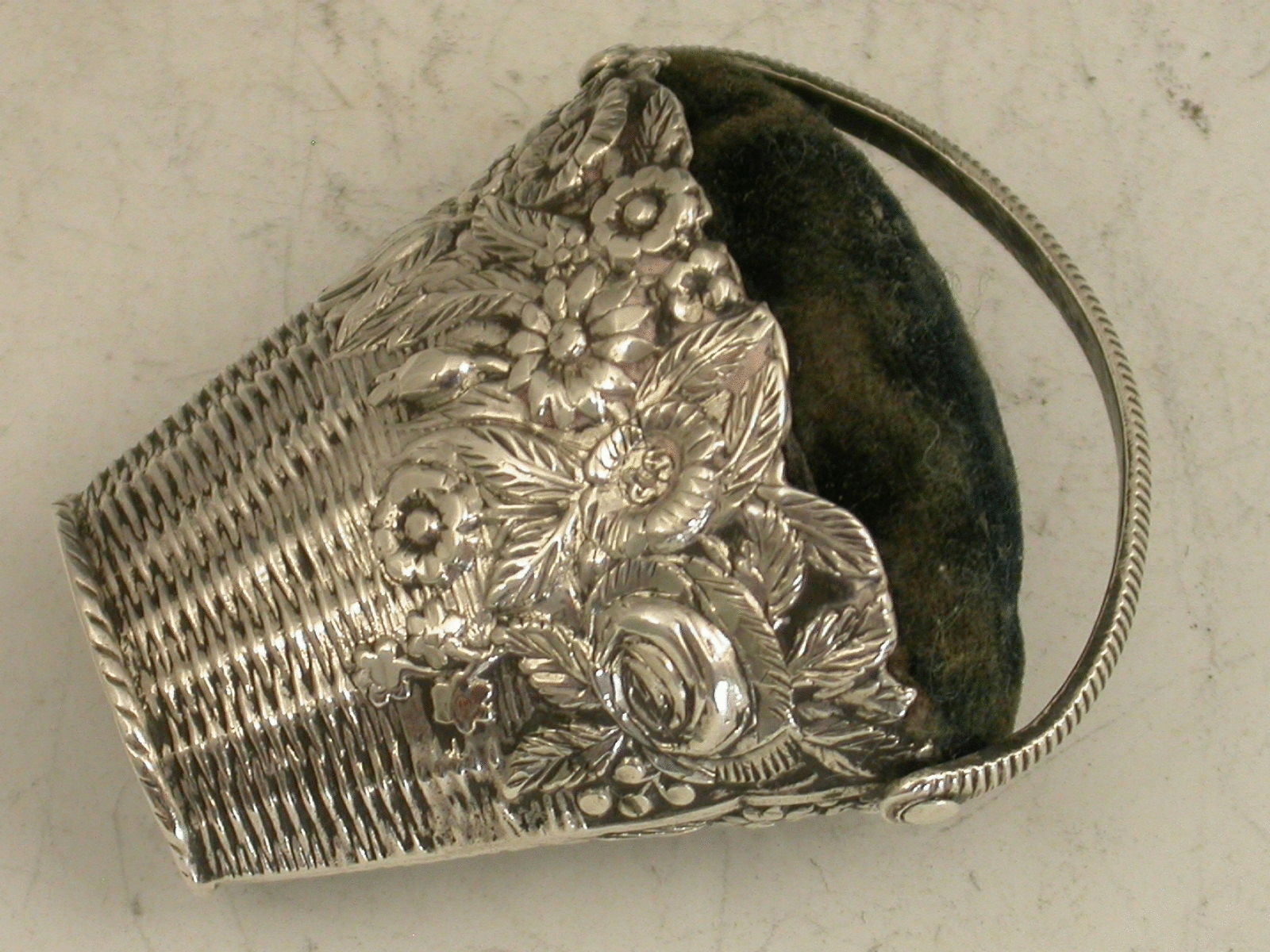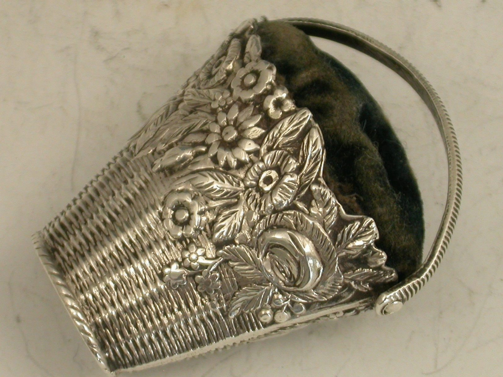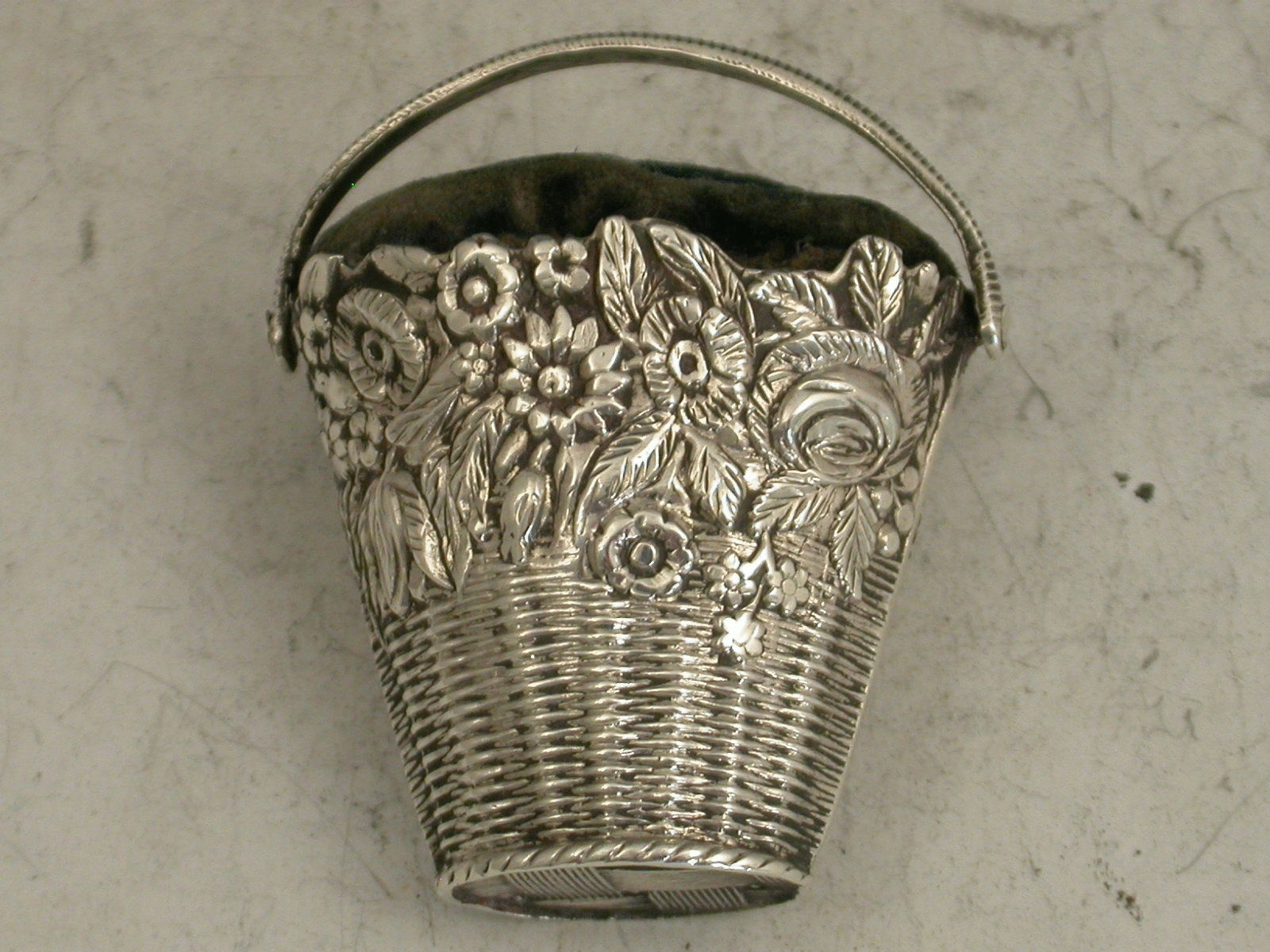 A rare George III novelty silver Pin Cushion made in the form of a wicker basket full of flowers, with swing handle.