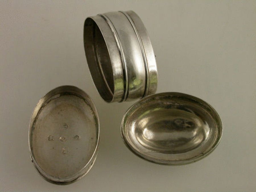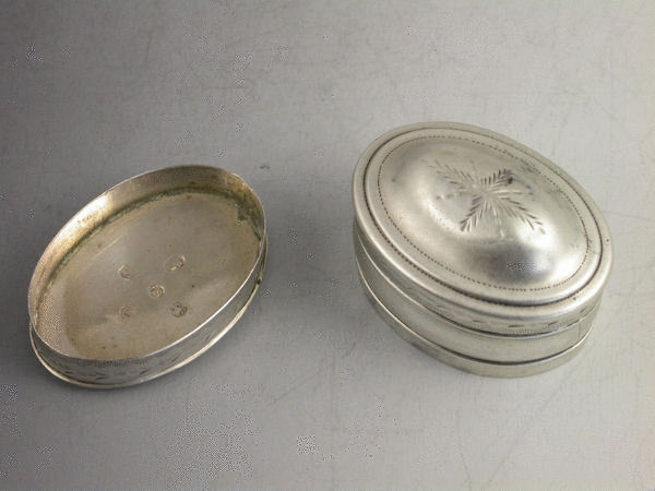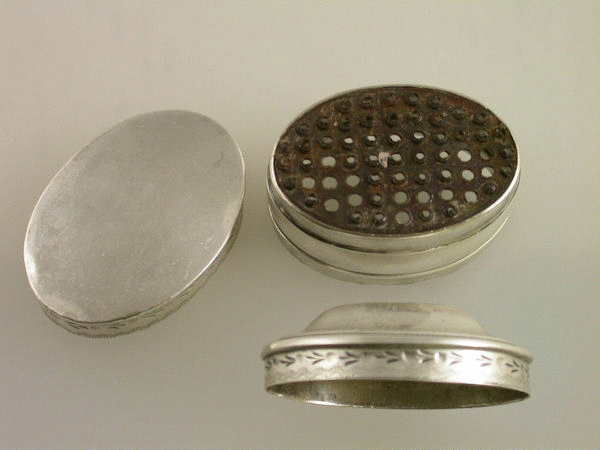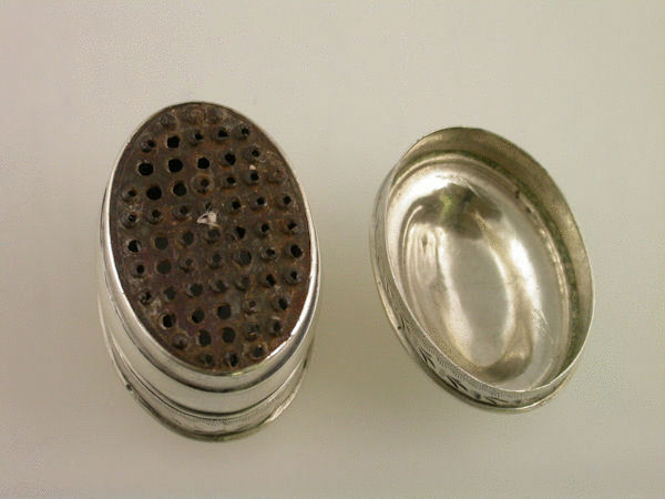 A good 18th century George III silver Nutmeg Grater of compressed oval form with domed lift off cover and flat base, engraved with bands of bright-cut and prick dot decoration and a fern pattern to the lid. Original steel grater.