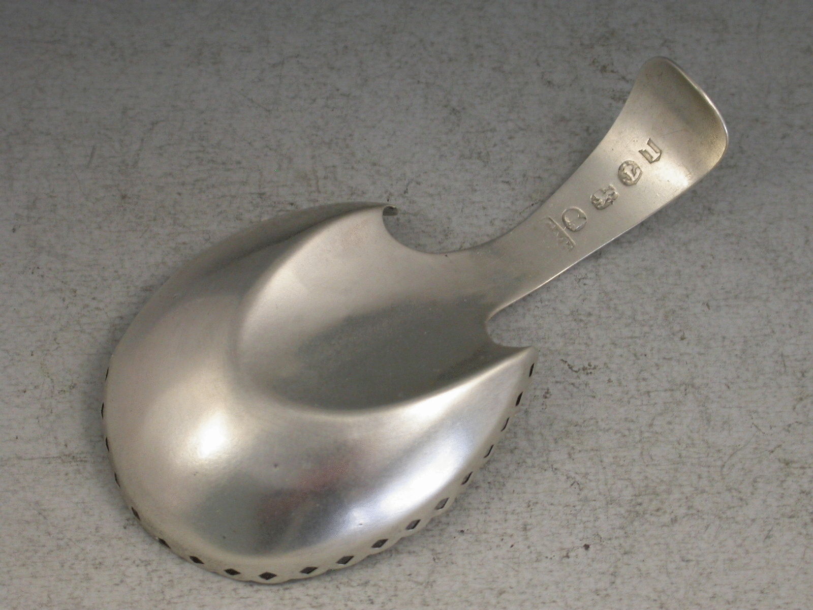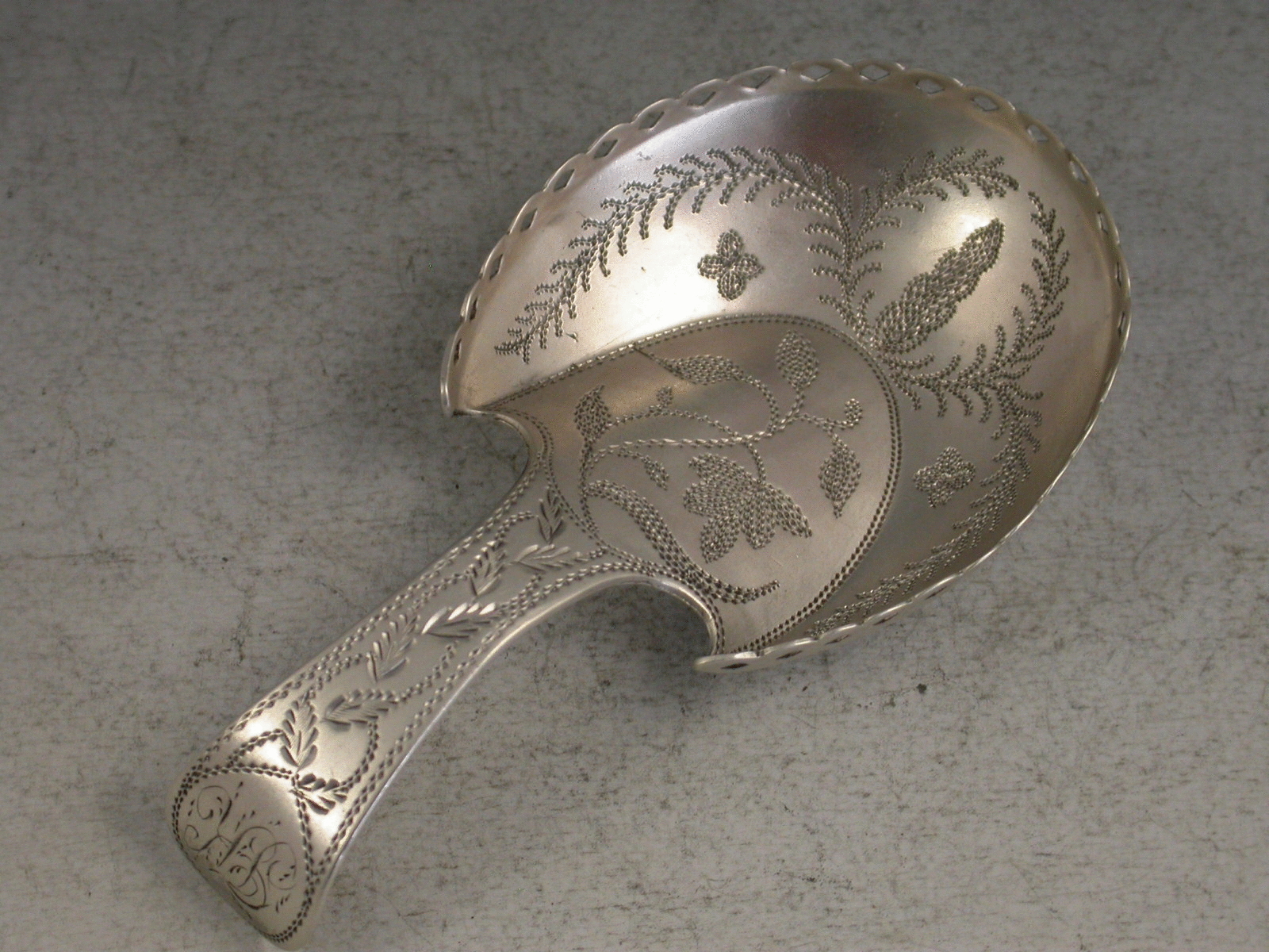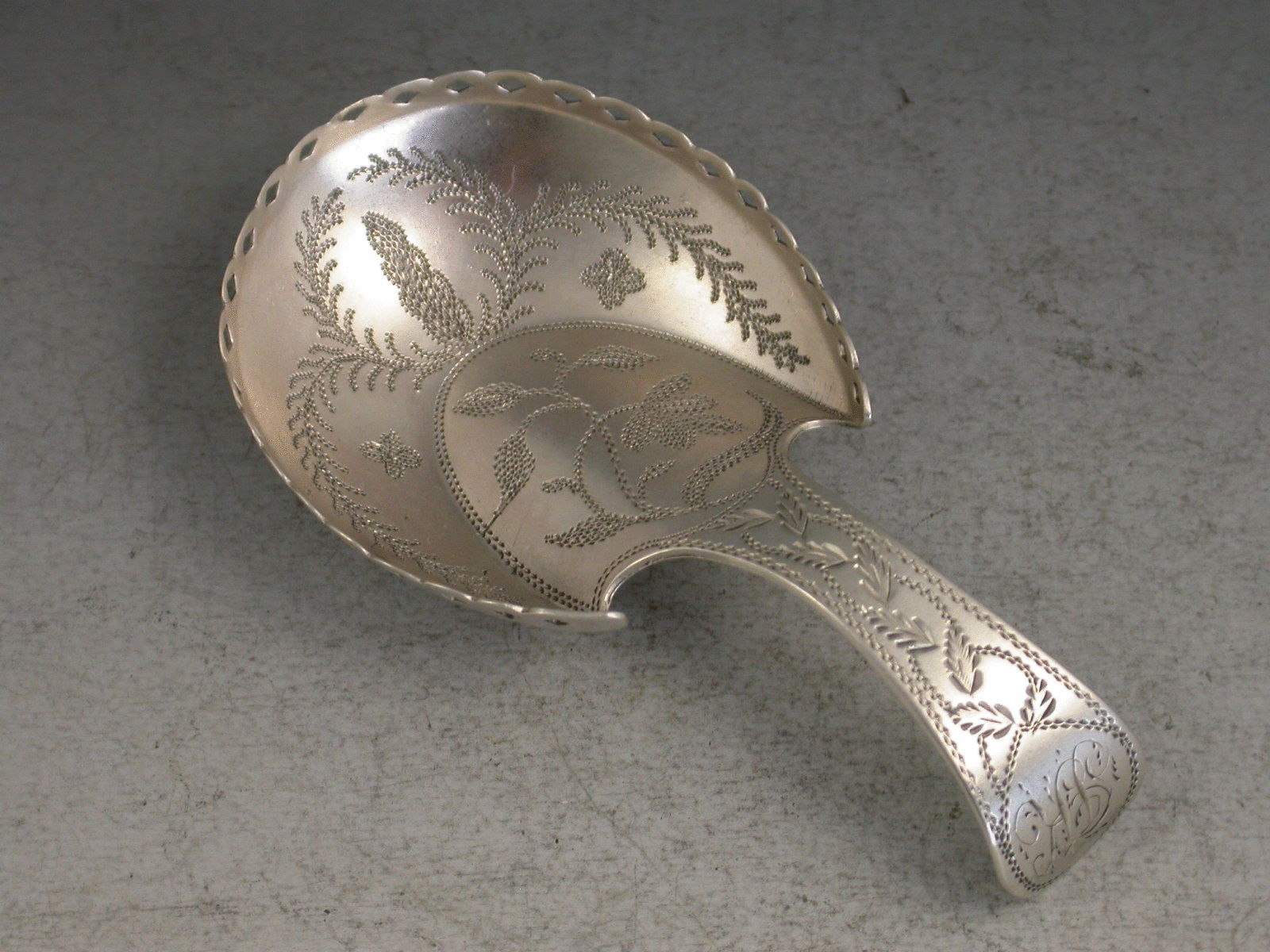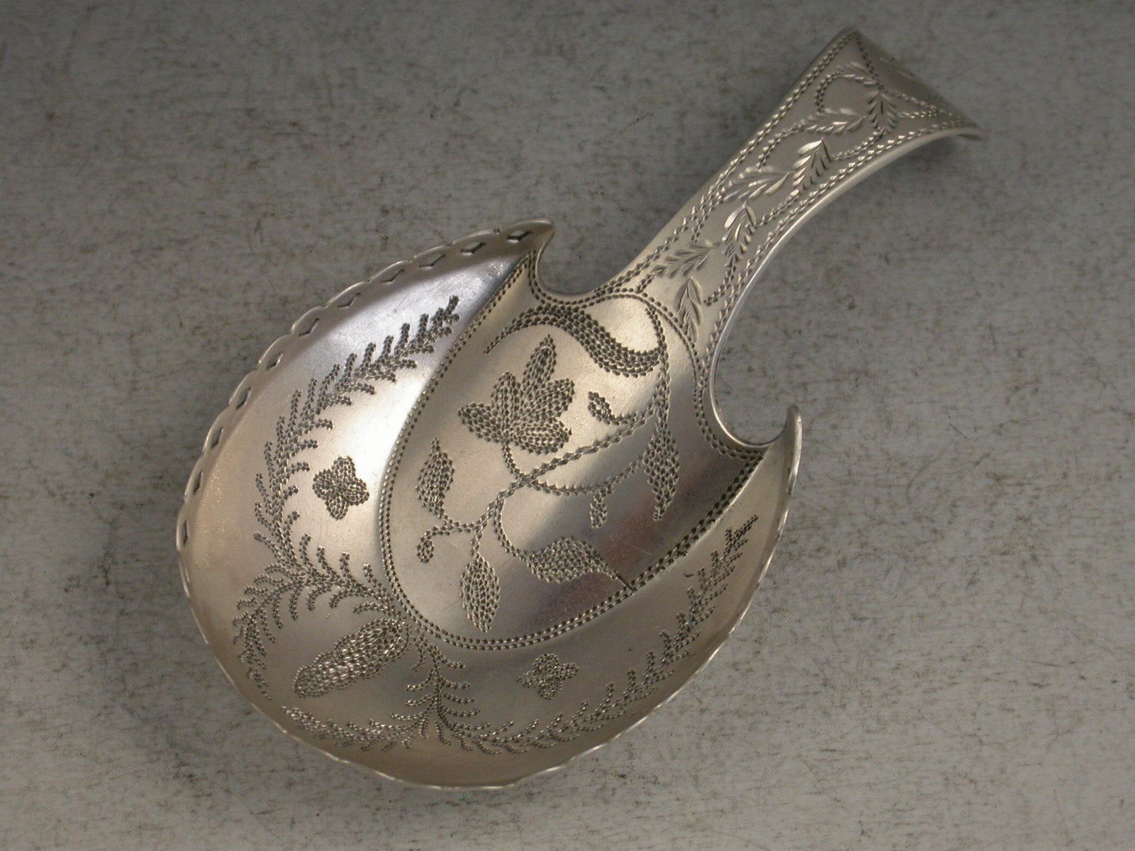 A fine George III silver Caddy Spoon of ‘pastern hoof’ design with pierced gallery rim, the handle and bowl bright cut and prick dot engraved with ferns and foliage.