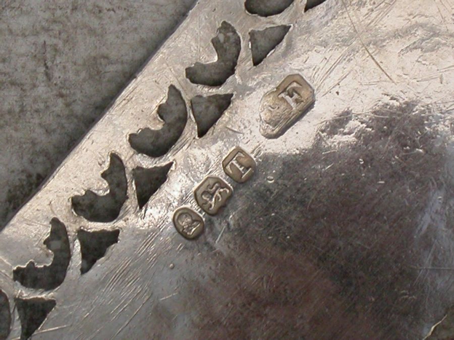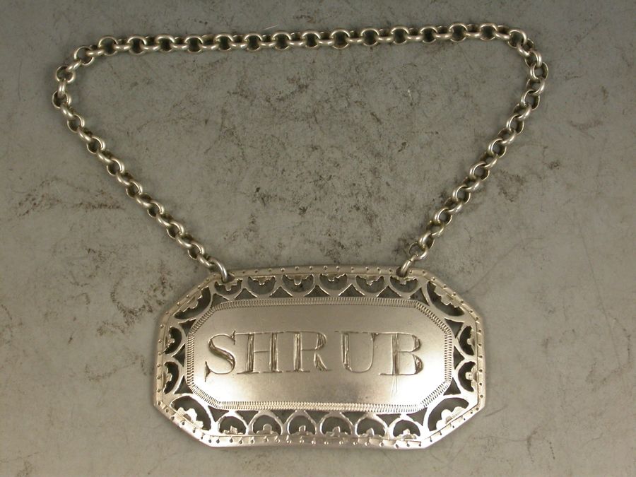 A fine George III silver Wine Label of rectangular form with cut-corners, the border finely pierced with hoops and trefoils, the name plate incised for Shrub.