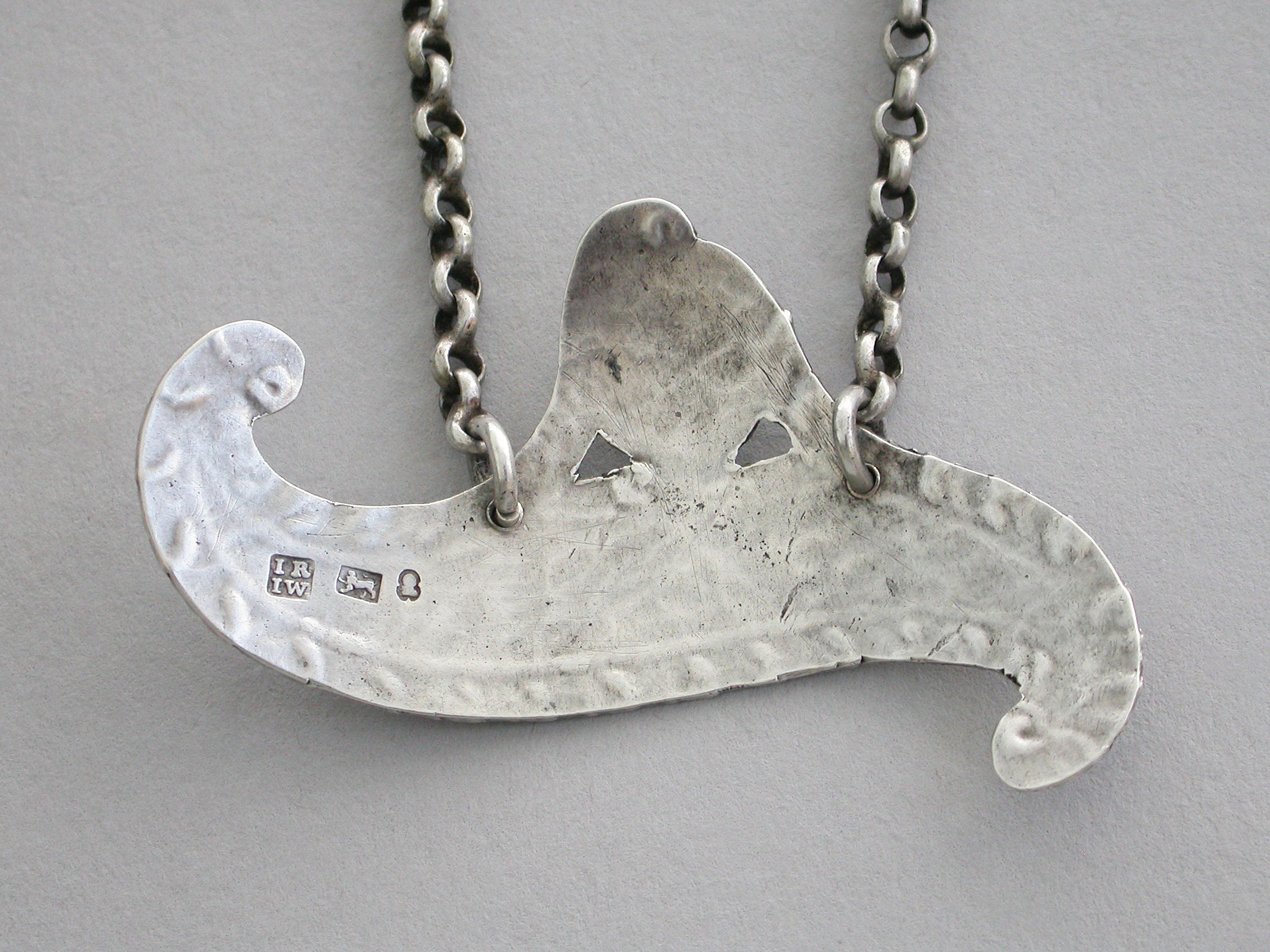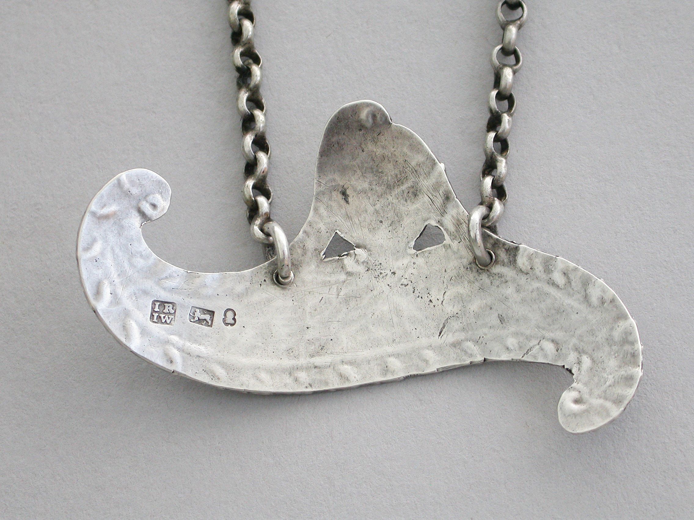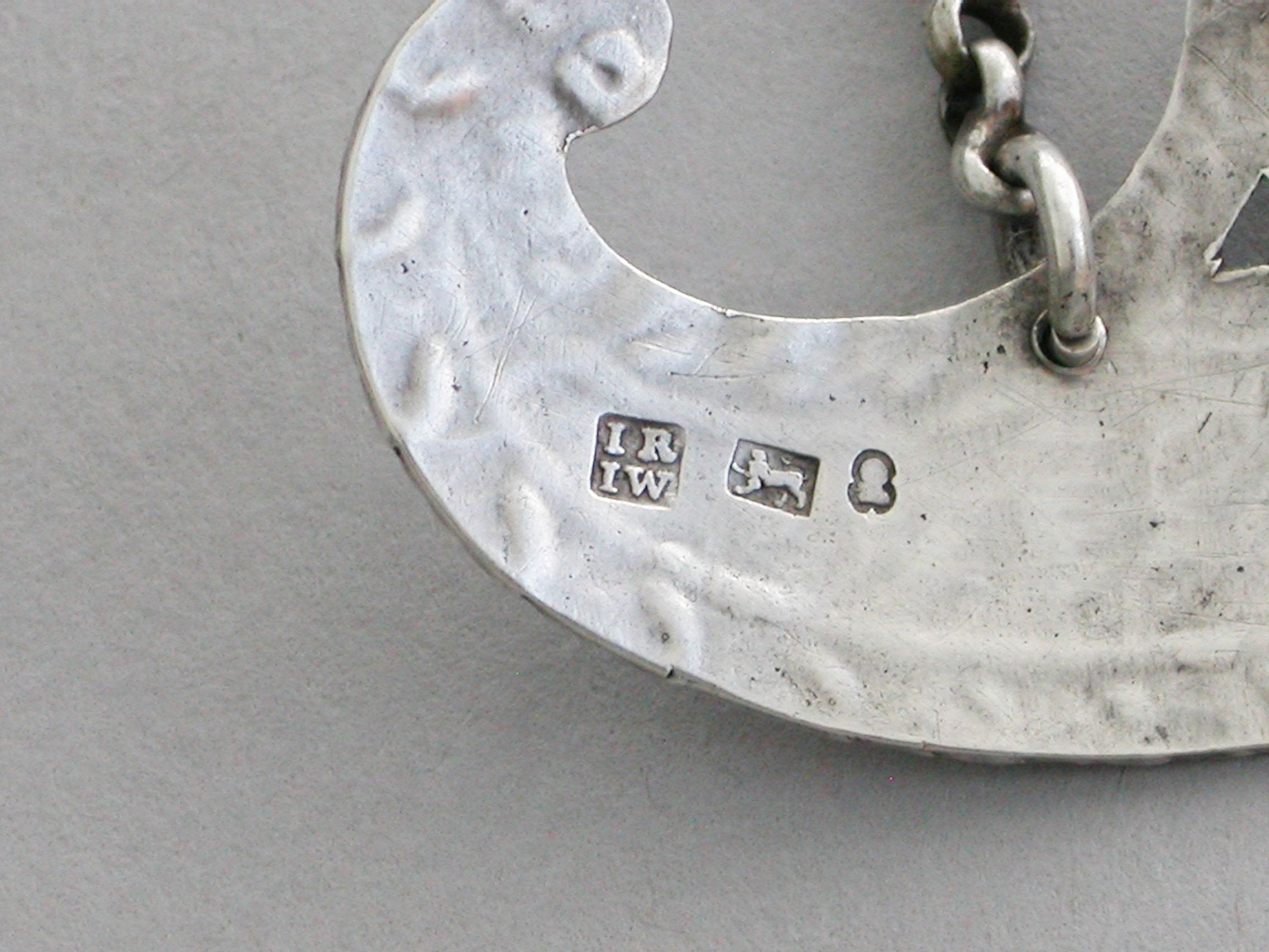 A rare George III Provincial silver Wine Label of scroll shape with feather edge border, a shaped cartouche surmount supported by swags and engraved with an Armorial crest of a Lion Passant Gardant (that of several families).