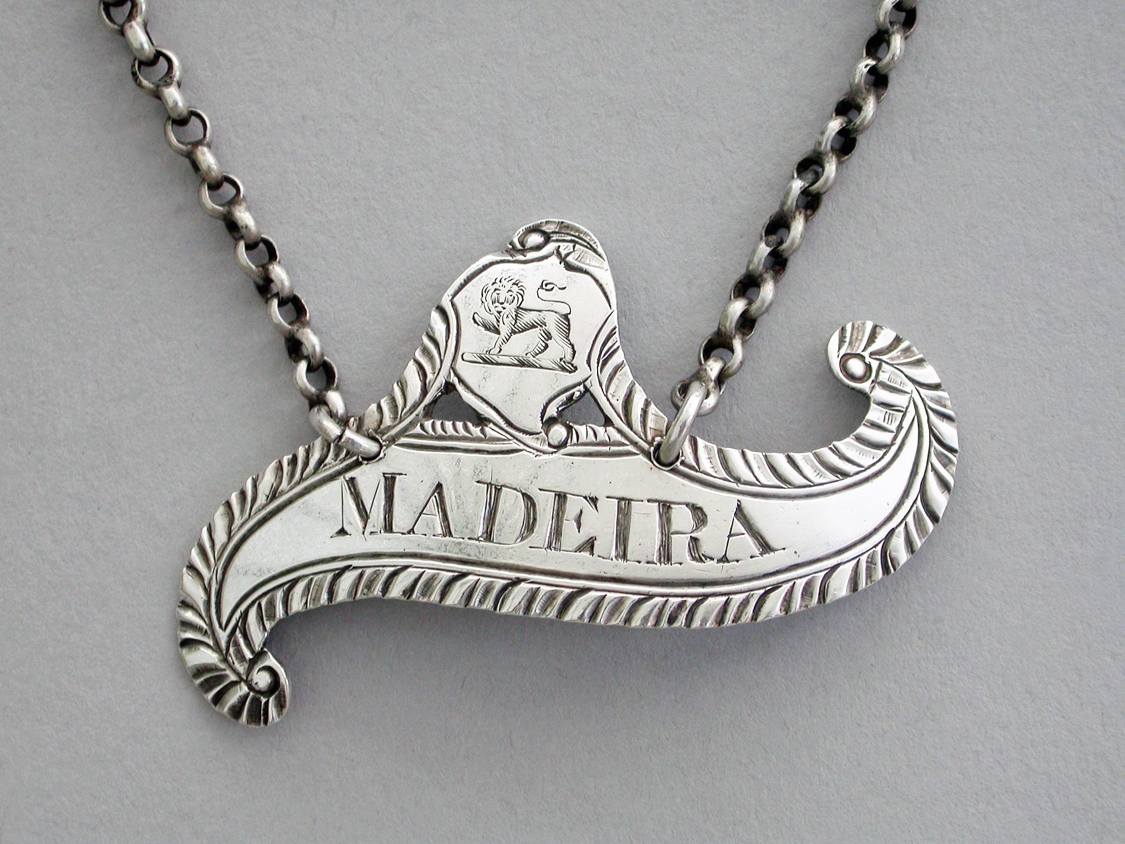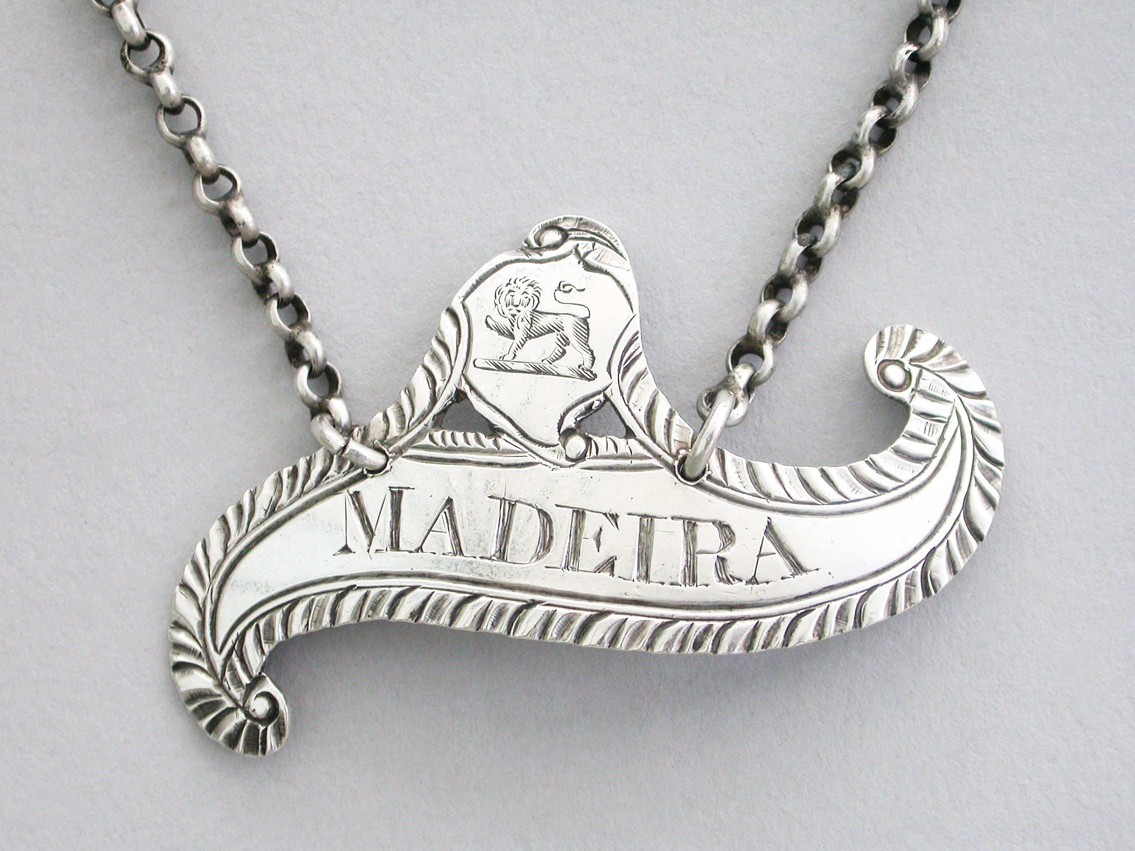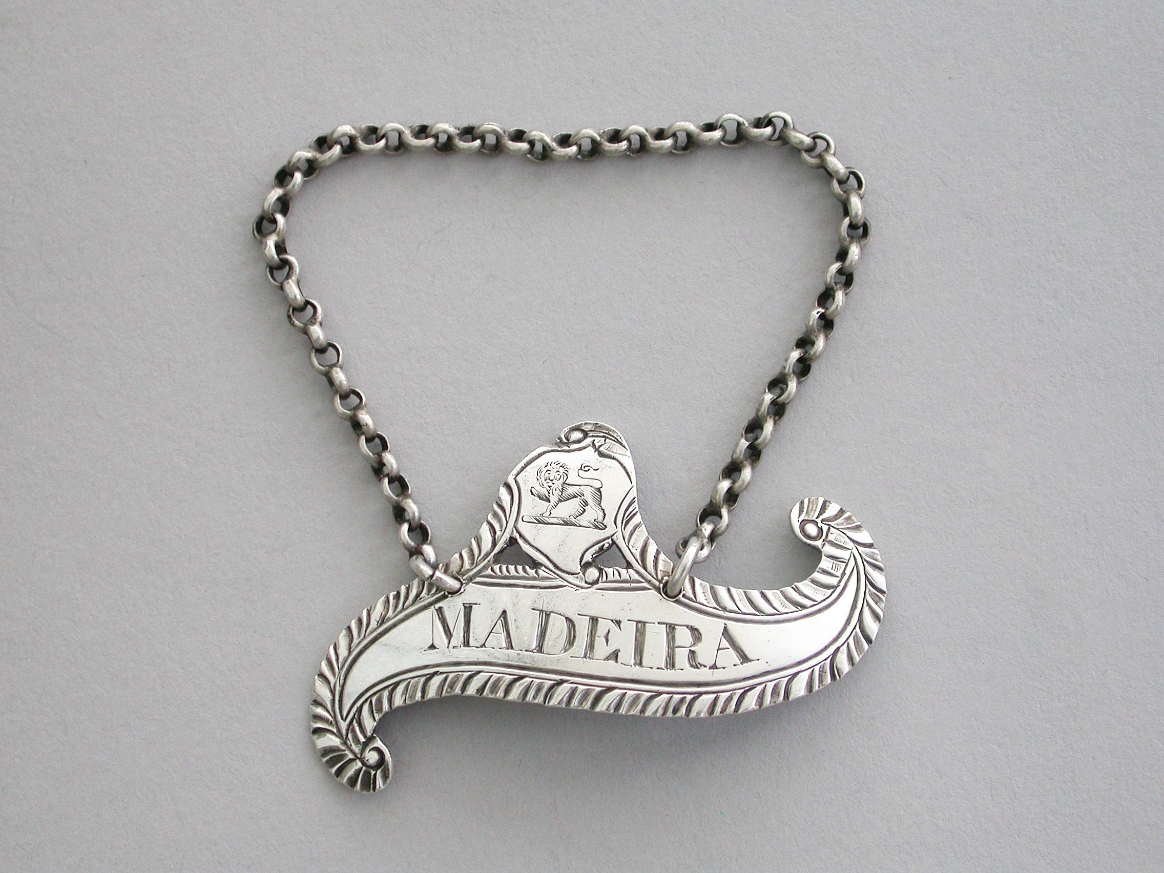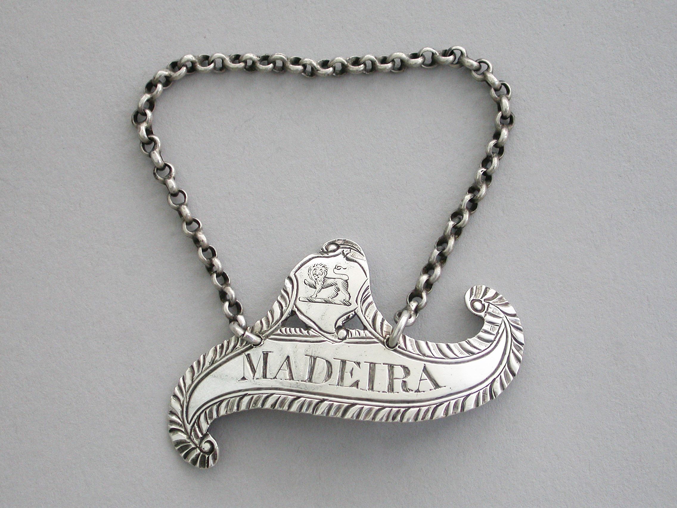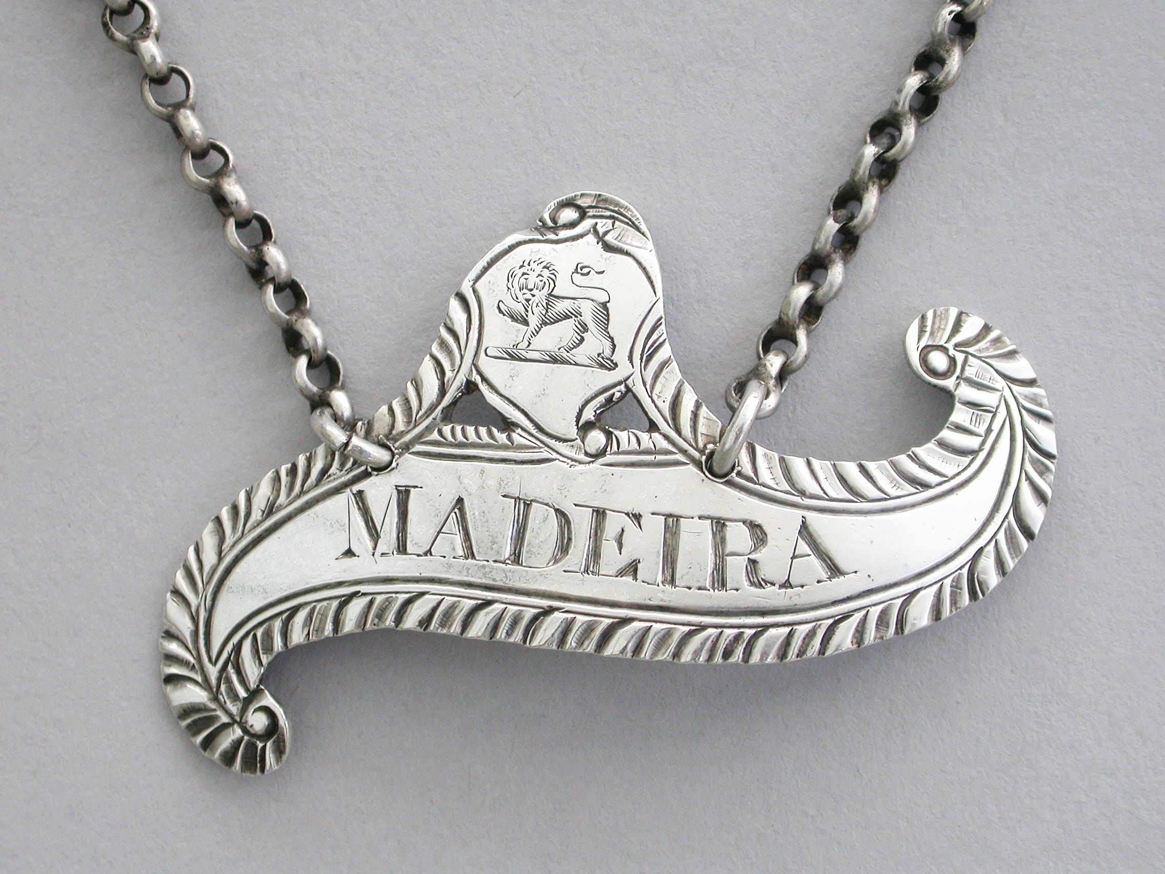 George III Provincial Crested Silver Scroll Shaped Wine Label 'Madeira'