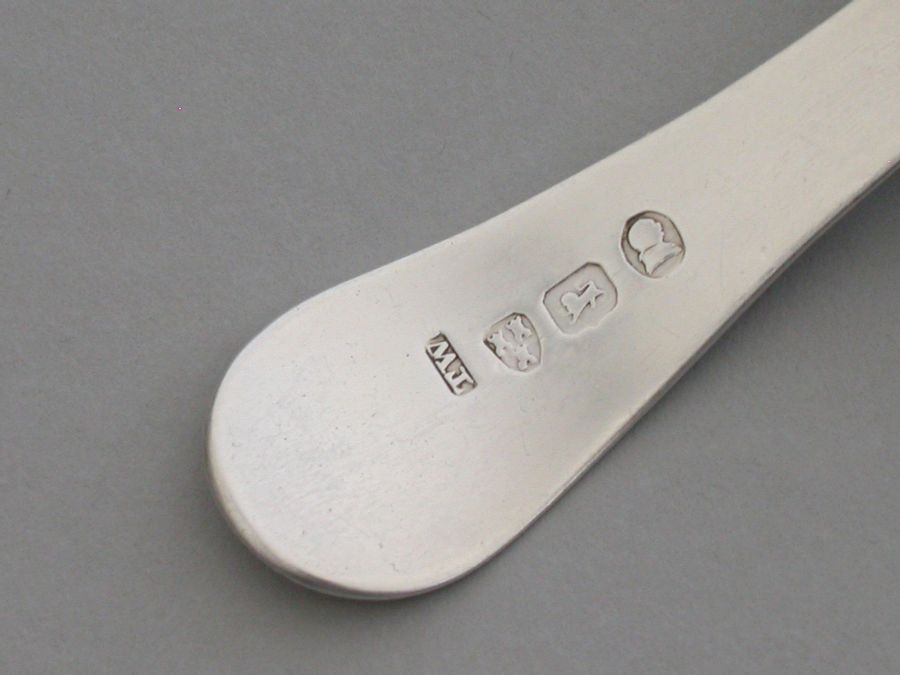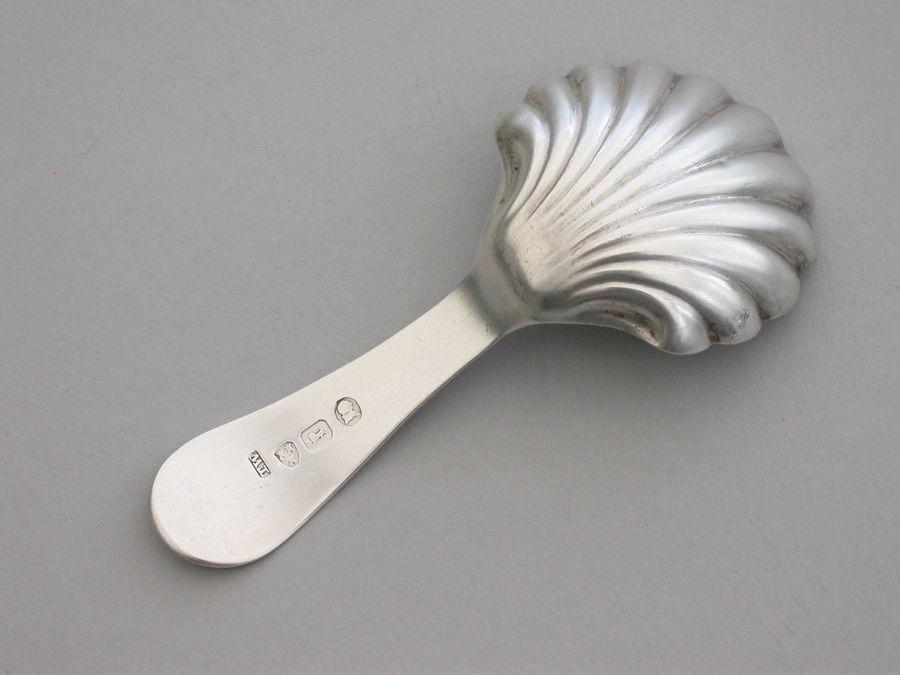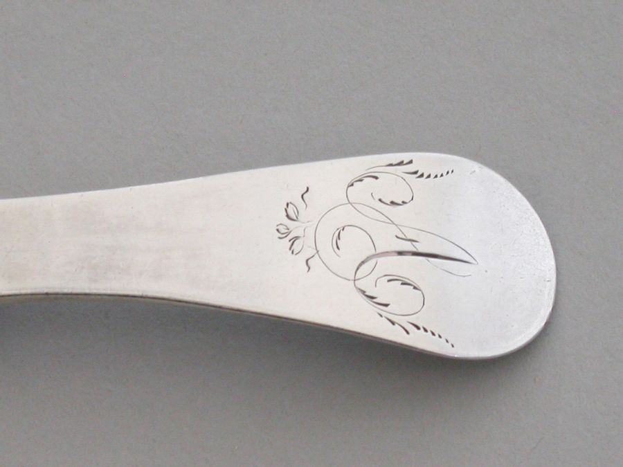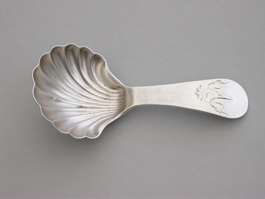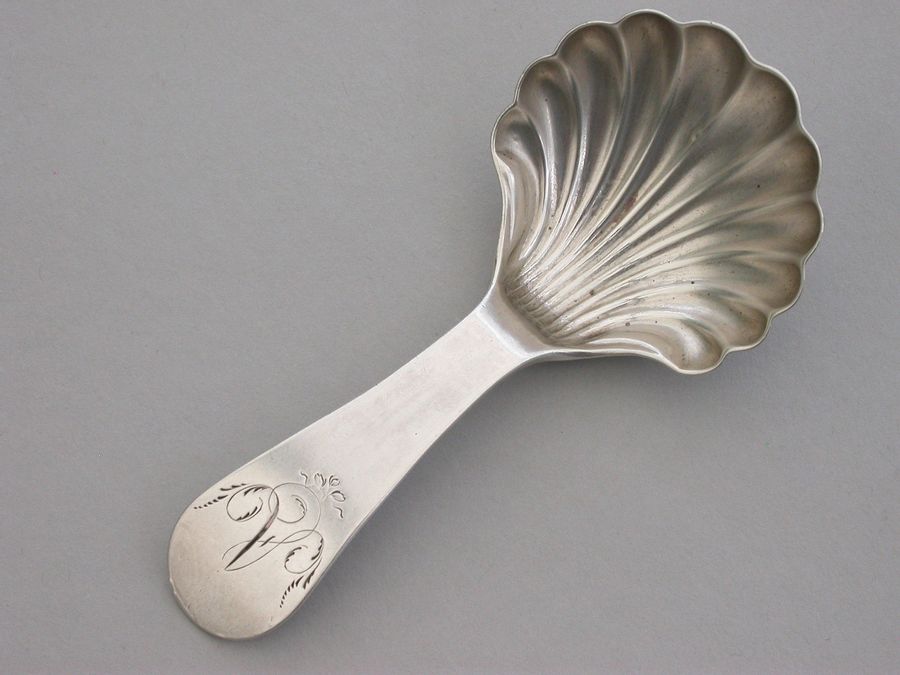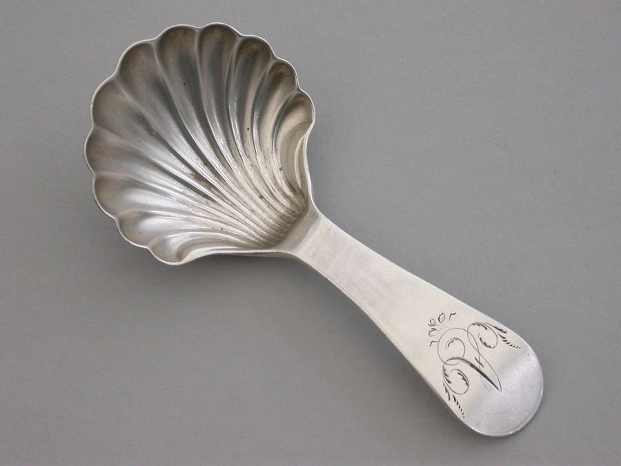 A rare George III Provincial silver Caddy Spoon with shell bowl, the wide Old English handle engraved with contemporary script initials.