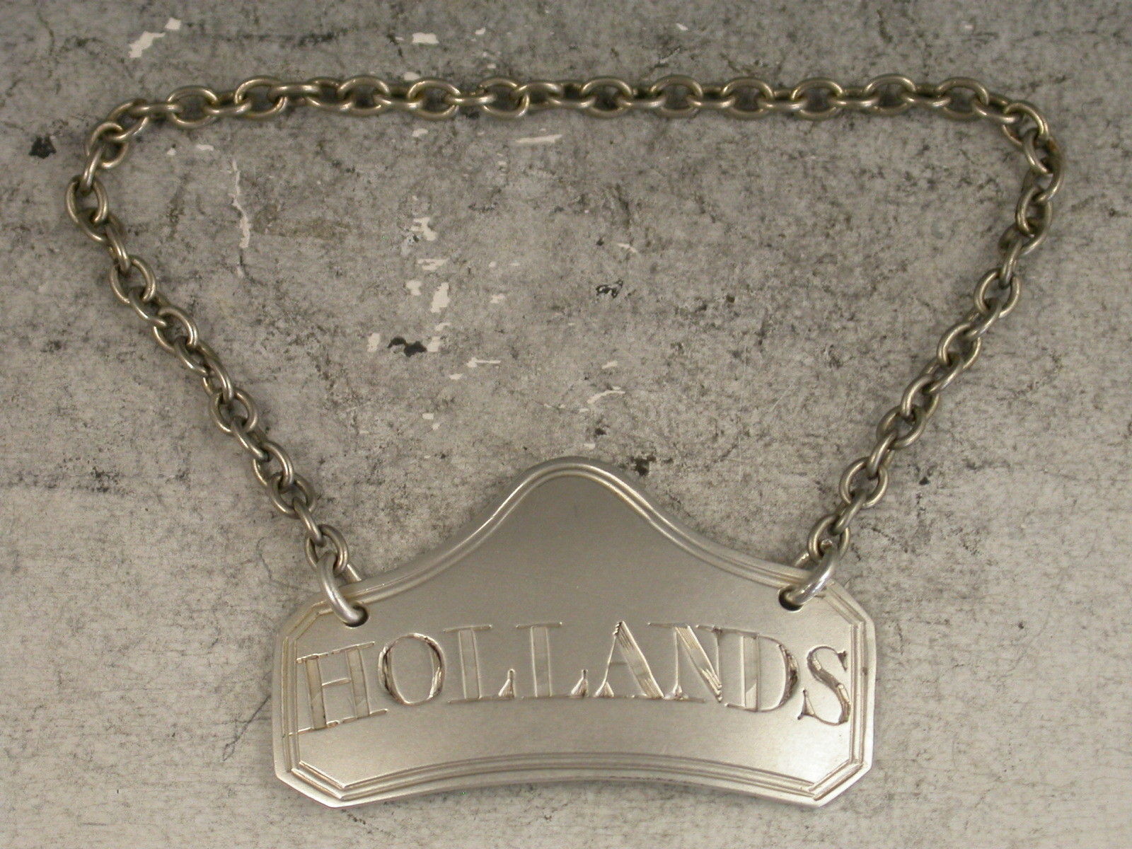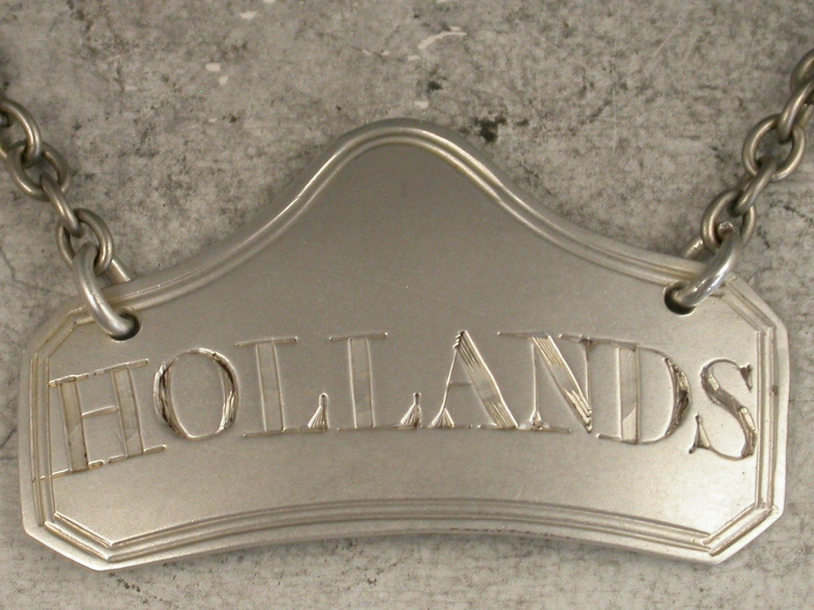 A rare George III 18th century Provincial silver Wine Label of cut-cornered rectangular form with reeded border and domed surmount, incised for Hollands.