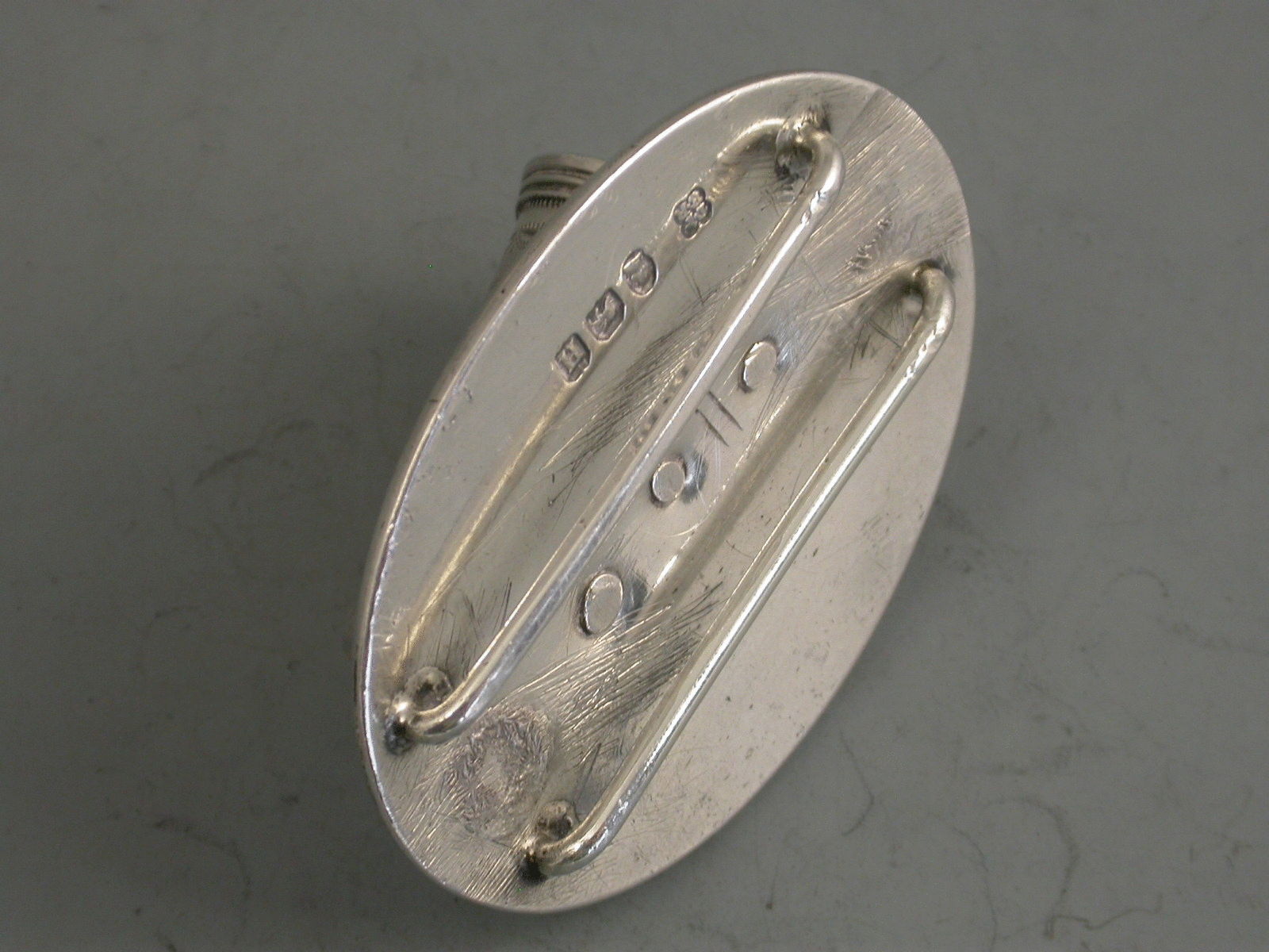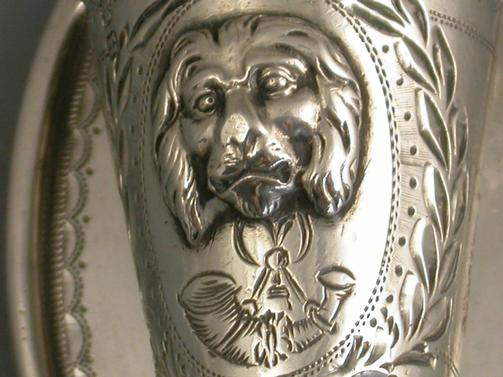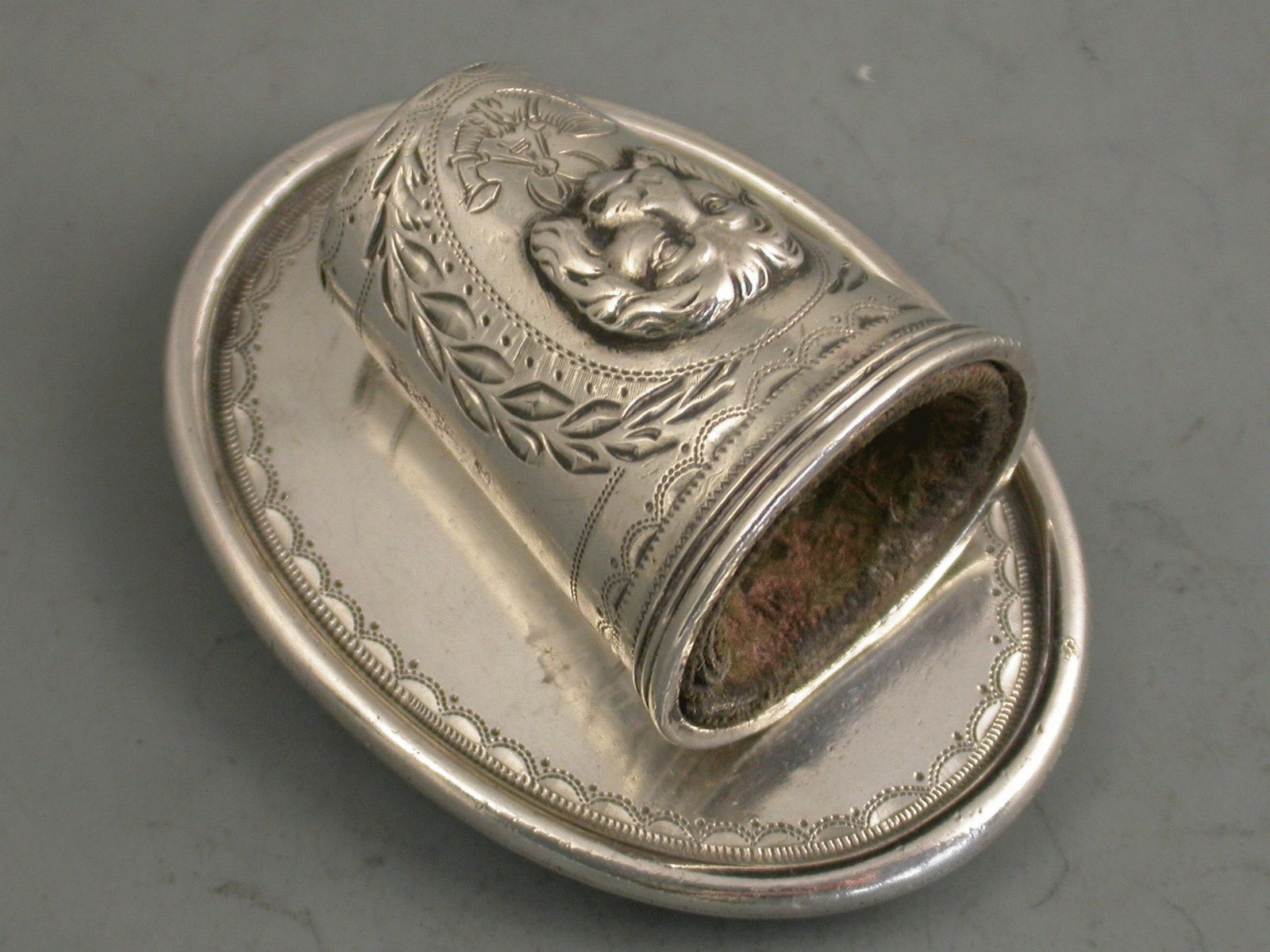 A rare George III Regimental silver Standard Bearer's Staff Holder in the form of a tapering thimble shaped cup on an oval back plate with belt loops, the holder with applied lion mask and engraved with the emblem of the Light Infantry.