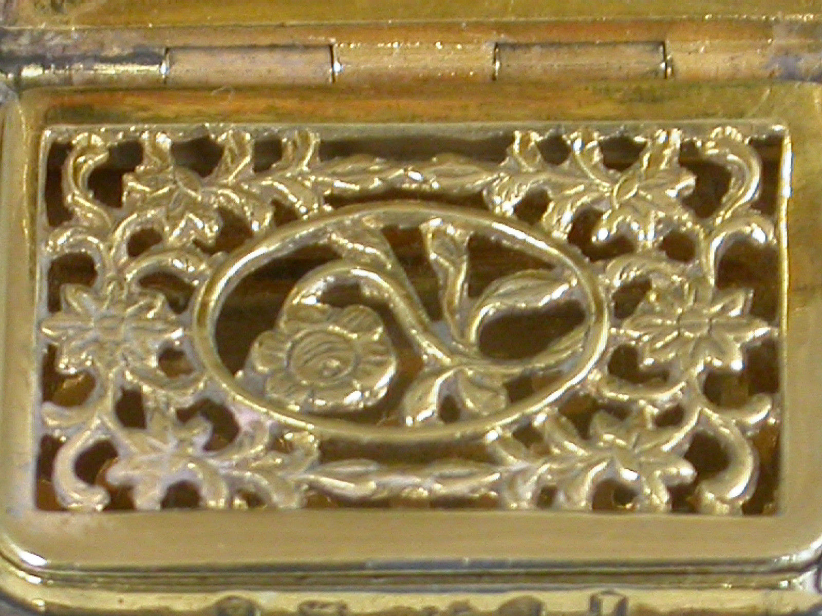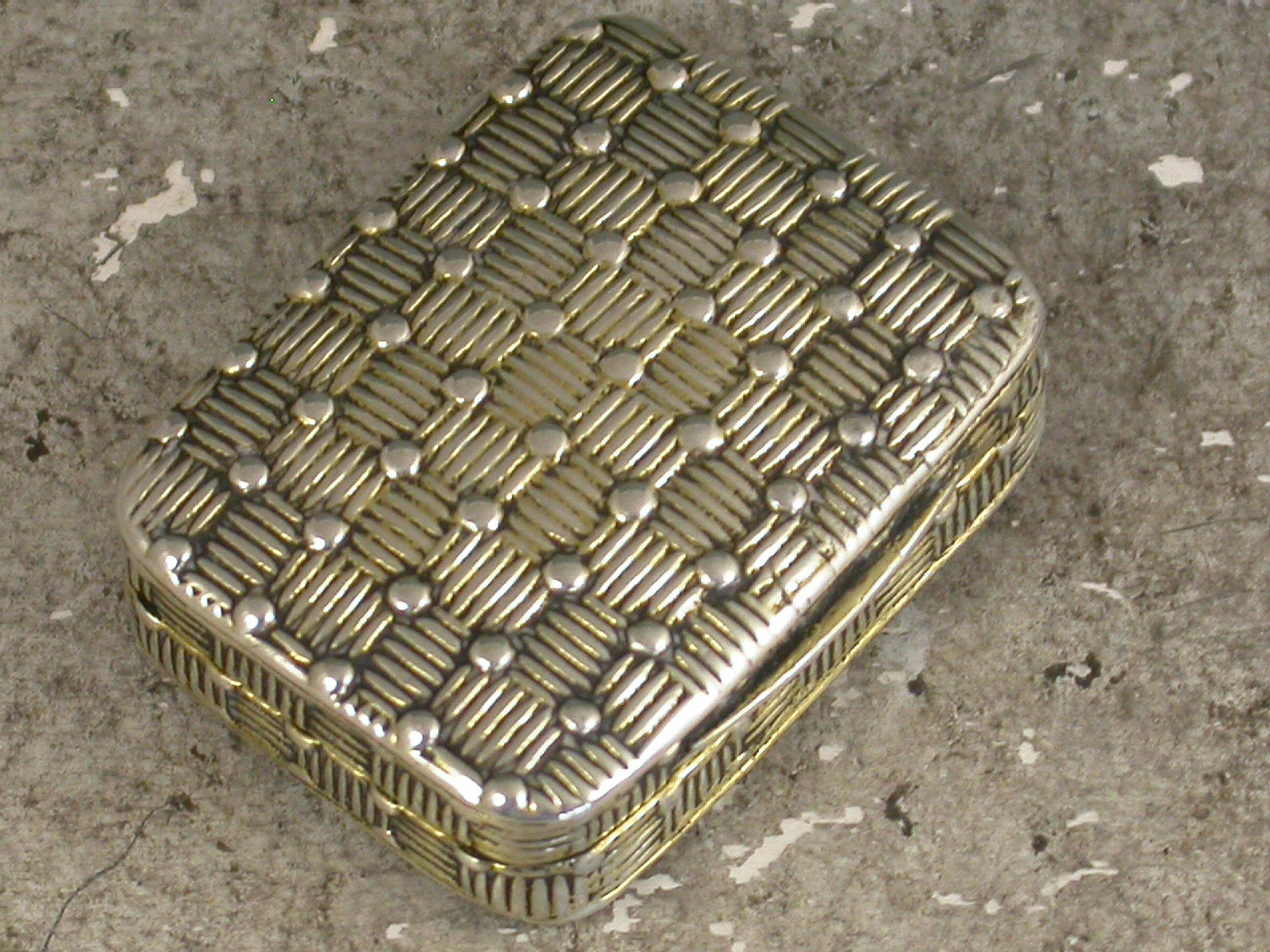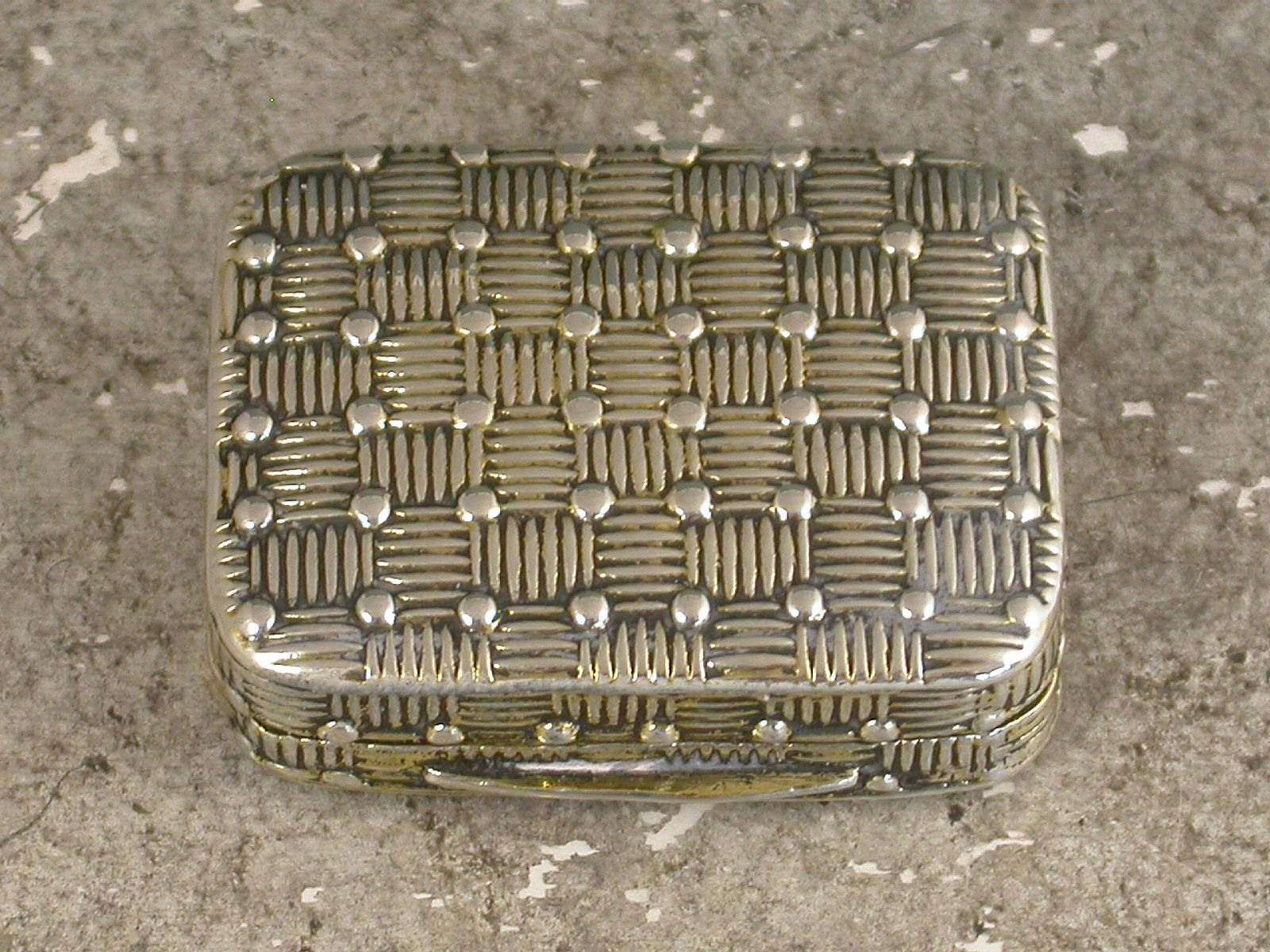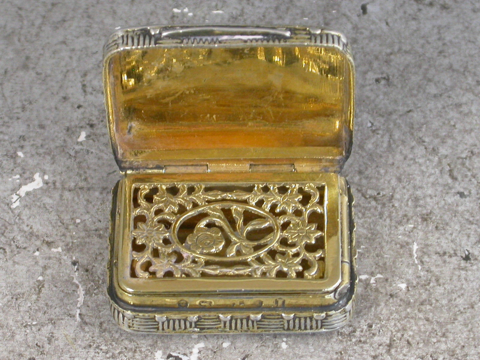 A rare George III silver Vinaigrette of rounded rectangular form with basketweave or studded cushion decoration to the exterior, the silver gilt interior with finely pierced grille decorated with flower heads and centered by a single English rose in an oval frame.