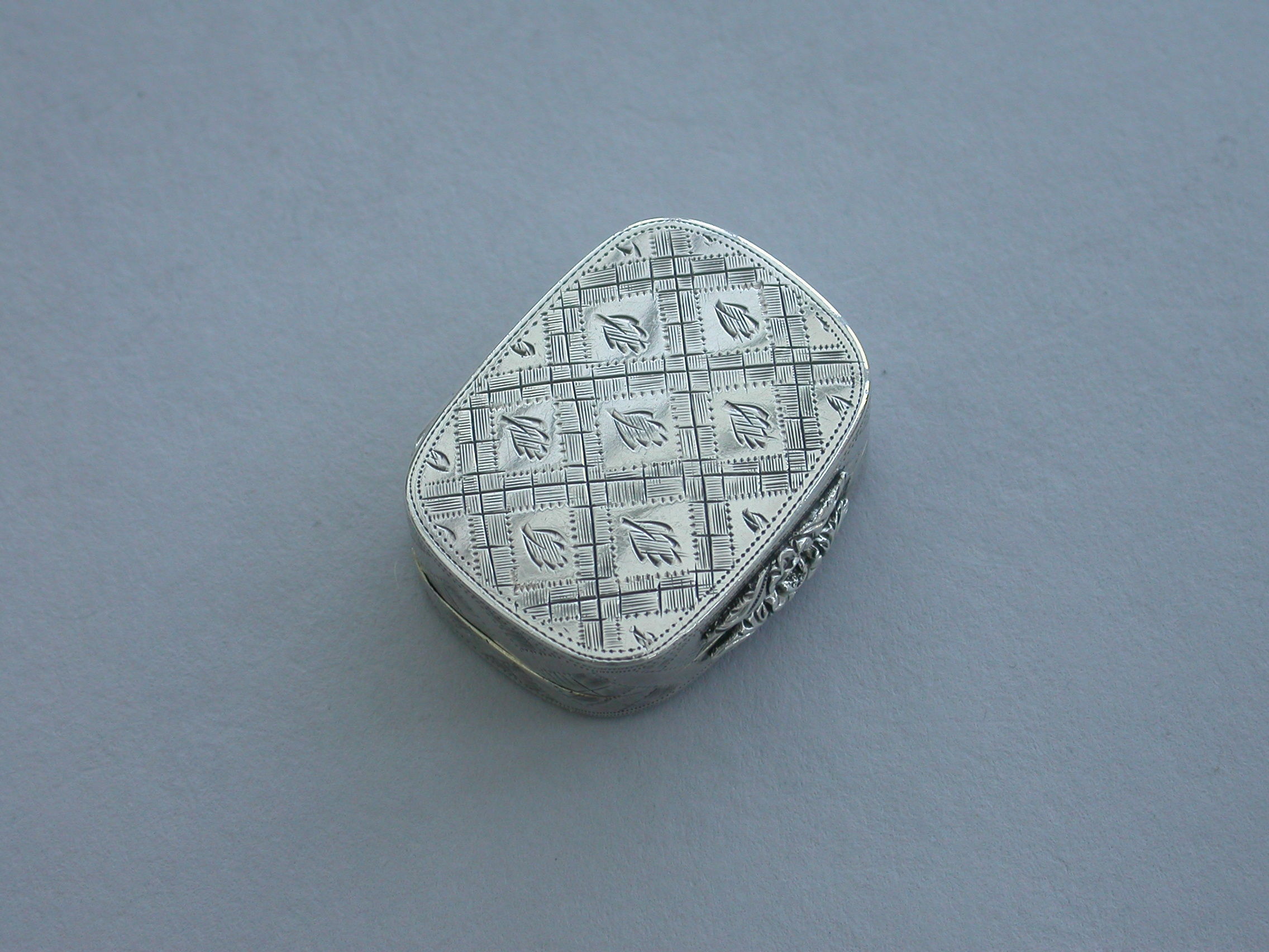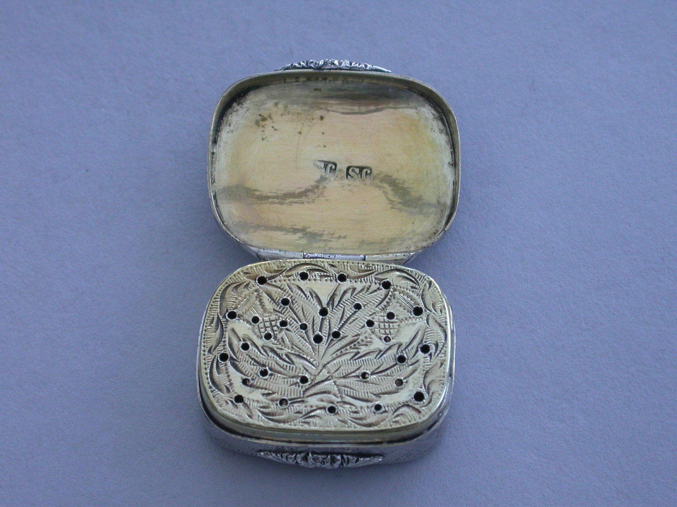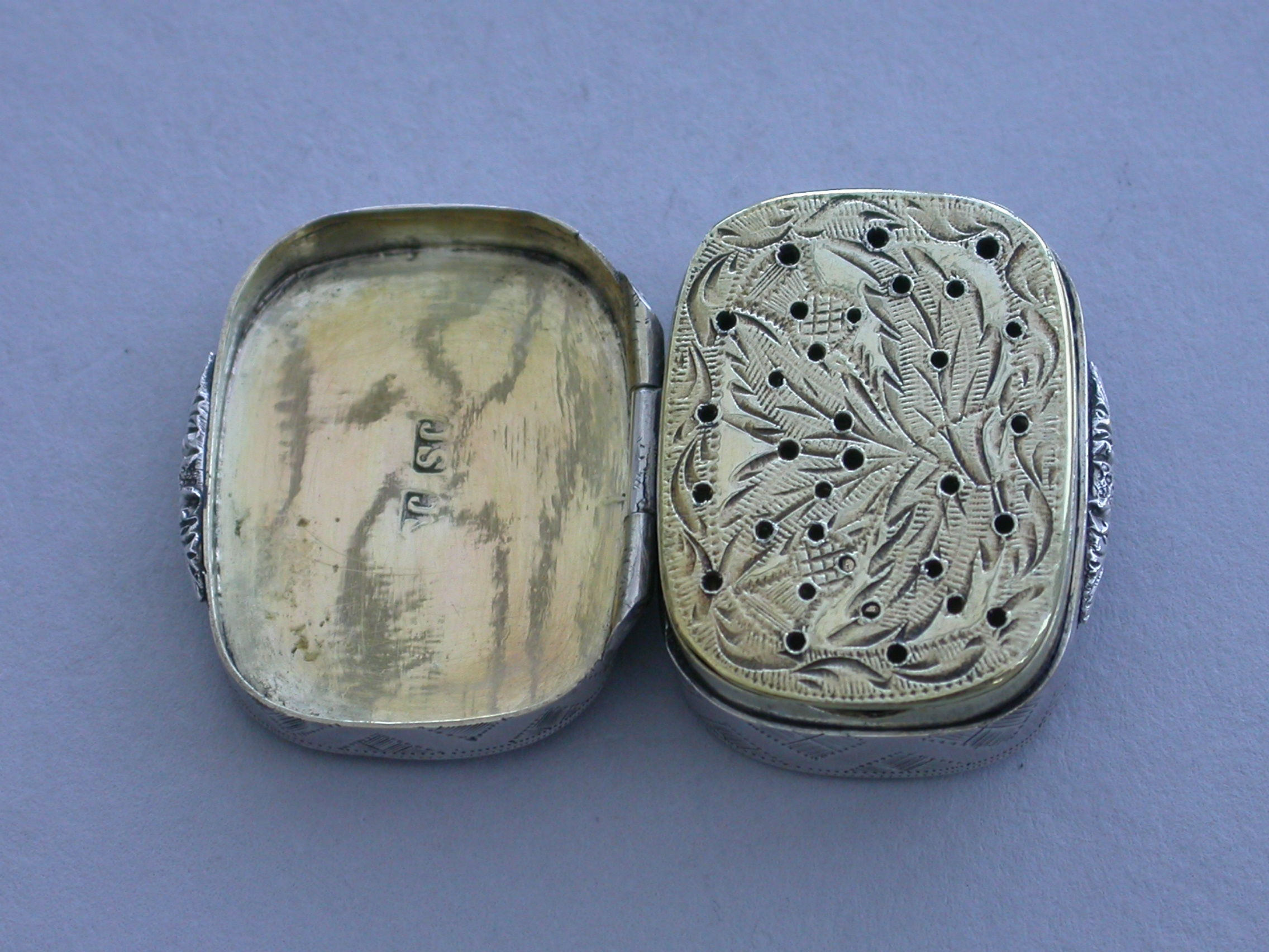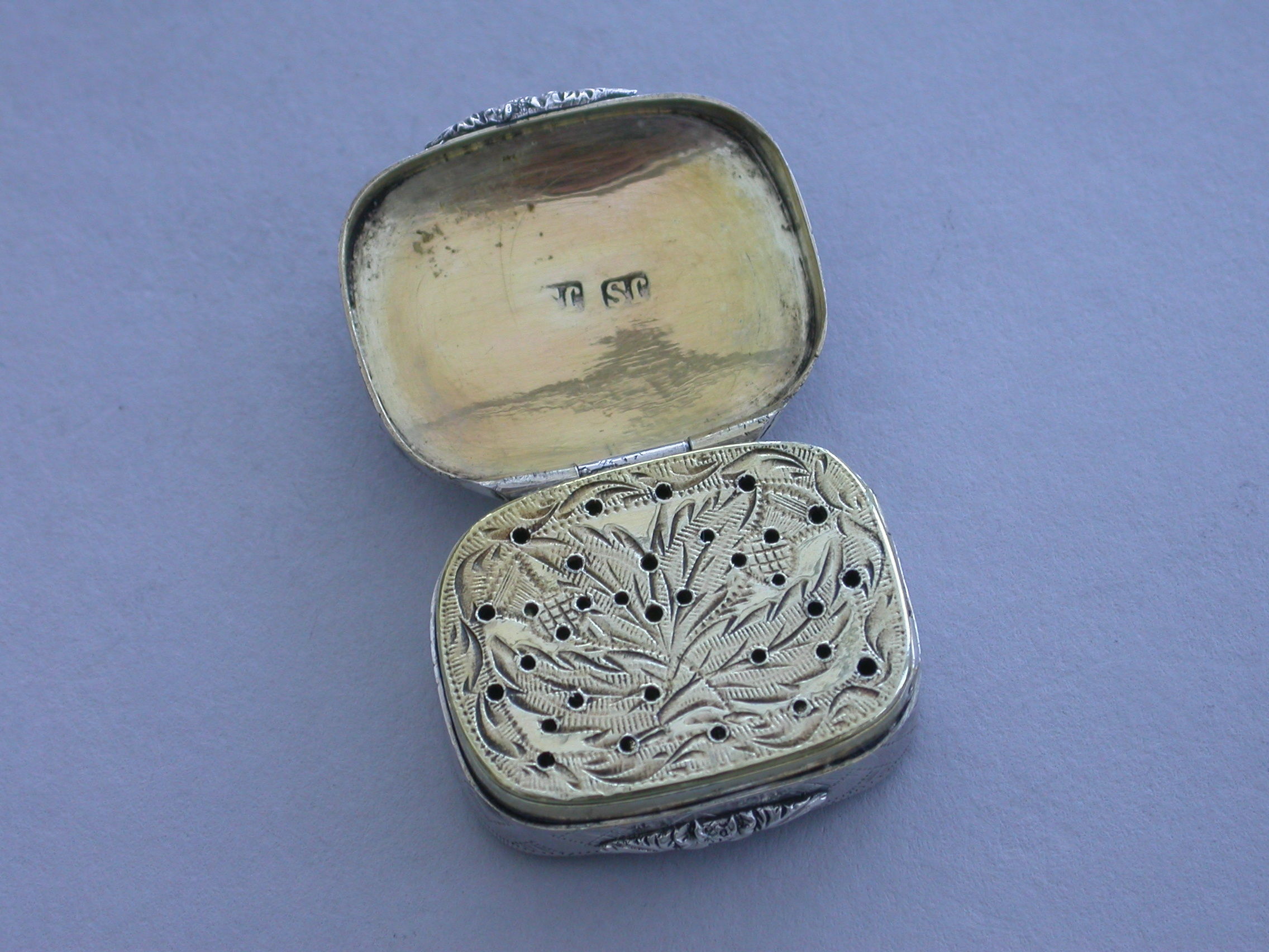 An extremely rare George III Scottish Provincial silver Vinaigrette of small rounded rectangular form, with all-over tartan diaper work engraving enclosing a leaf, a plain rectangular vacant cartouche to the lid, cast ornate thumb-pieces to lid and base and a stand-away hinge. The silver gilt grille with thistle engraving and pierced holes.