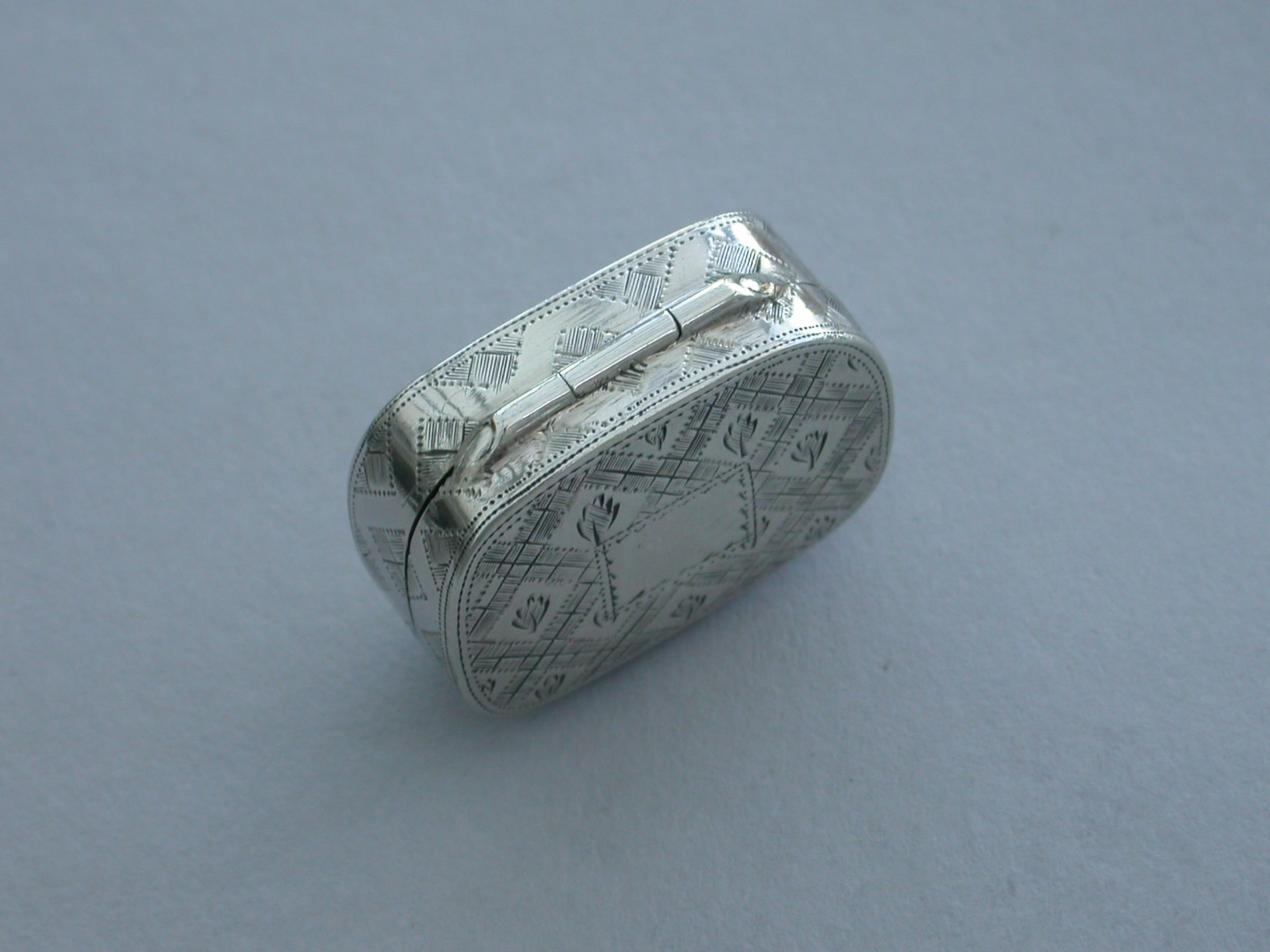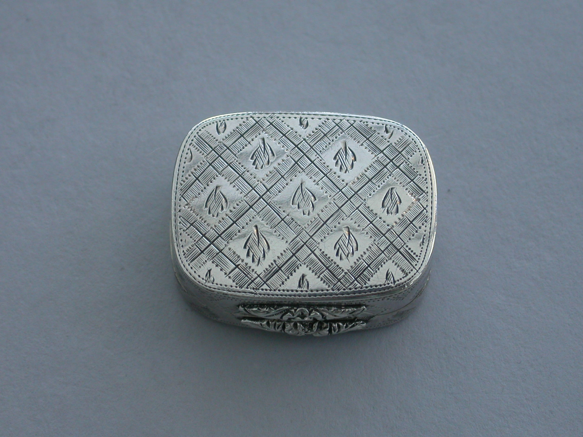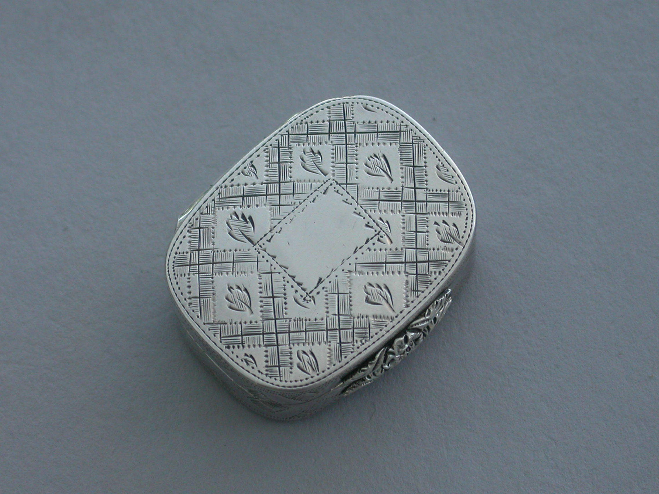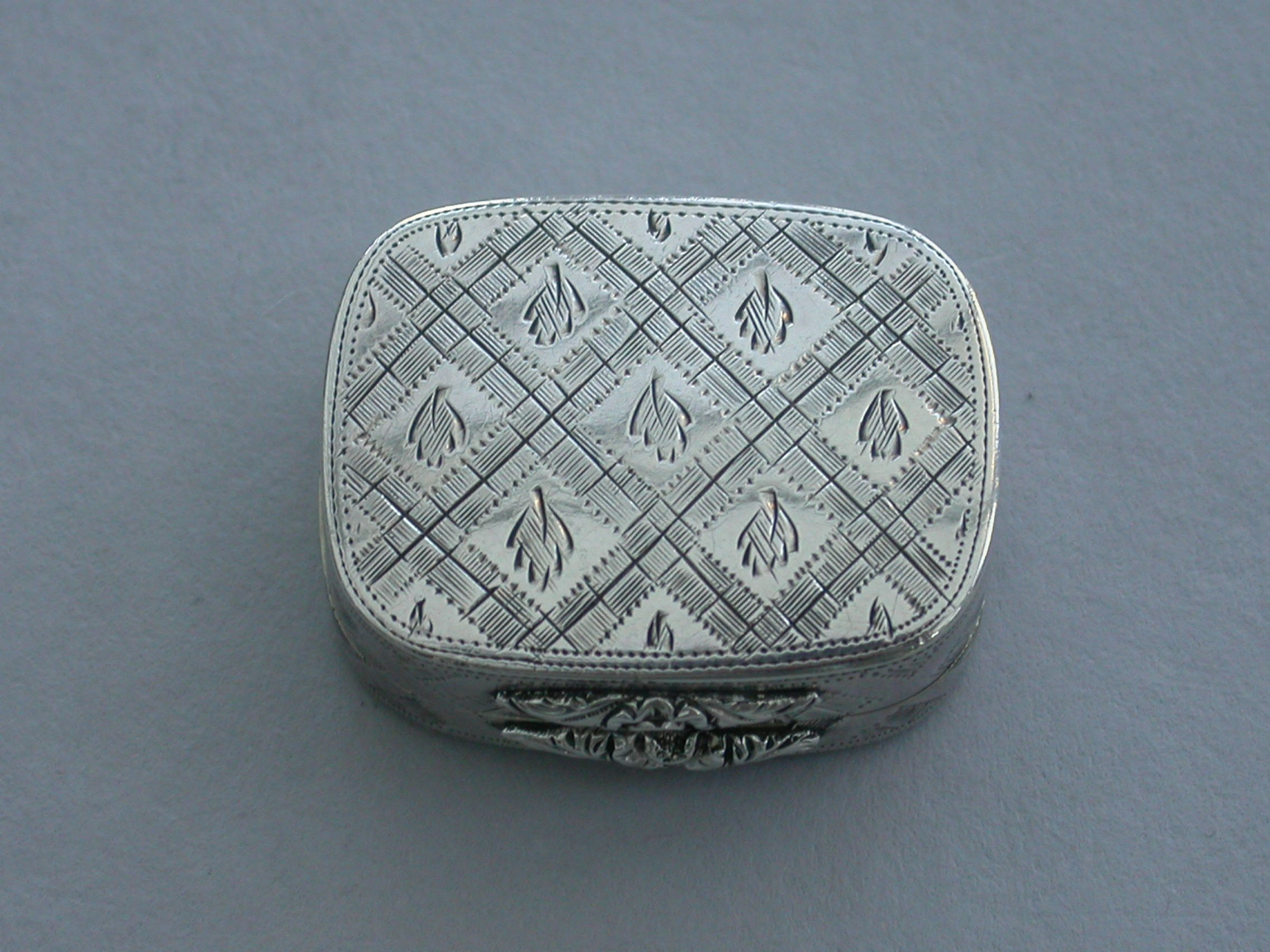 An extremely rare George III Scottish Provincial silver Vinaigrette of small rounded rectangular form, with all-over tartan diaper work engraving enclosing a leaf, a plain rectangular vacant cartouche to the lid, cast ornate thumb-pieces to lid and base and a stand-away hinge. The silver gilt grille with thistle engraving and pierced holes.