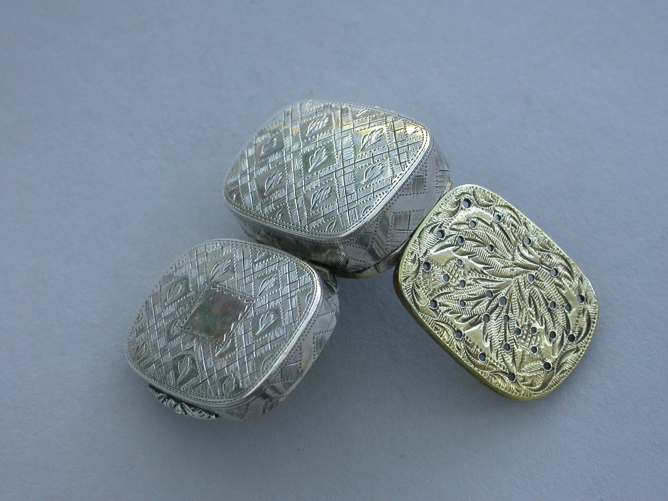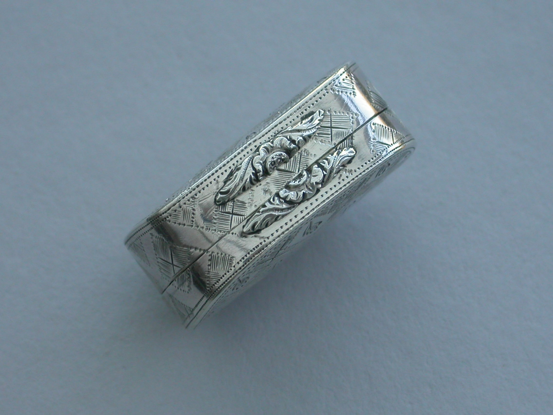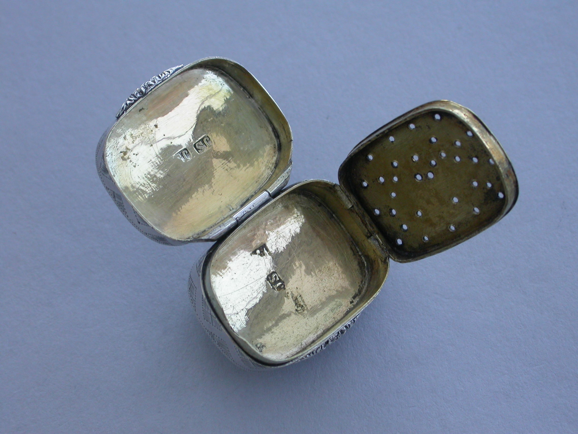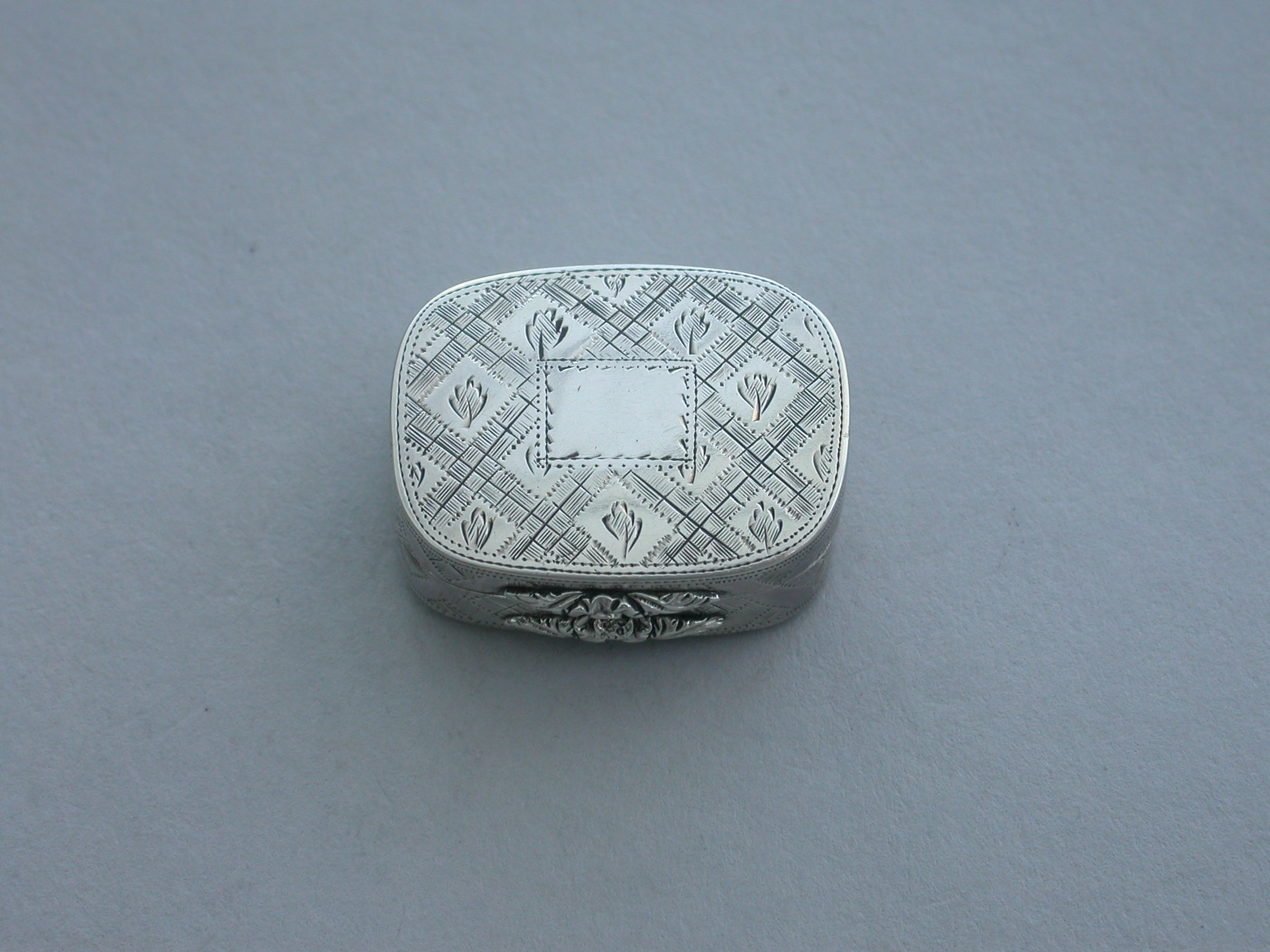 An extremely rare George III Scottish Provincial silver Vinaigrette of small rounded rectangular form, with all-over tartan diaper work engraving enclosing a leaf, a plain rectangular vacant cartouche to the lid, cast ornate thumb-pieces to lid and base and a stand-away hinge. The silver gilt grille with thistle engraving and pierced holes.