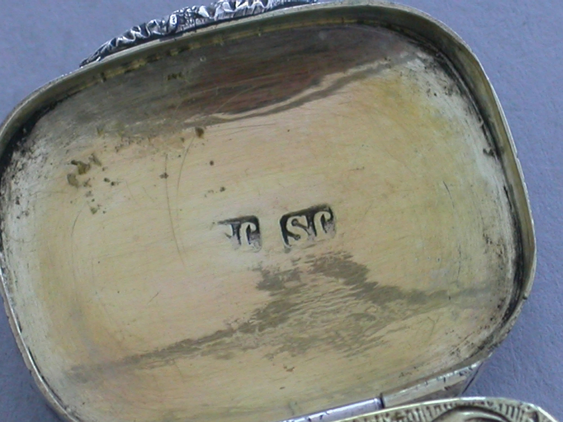 Marked to the interior lid with makers mark - 'JS' struck twice, and to the interior base with makers mark 'JS' and two other marks. Possibly for James Smith, Aberdeen,c1800.