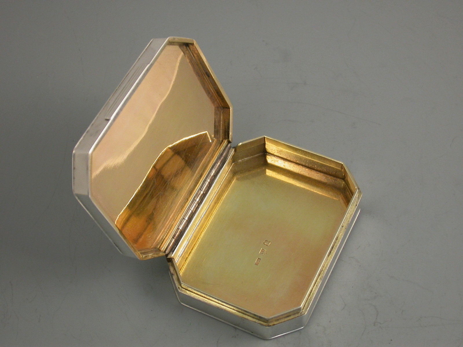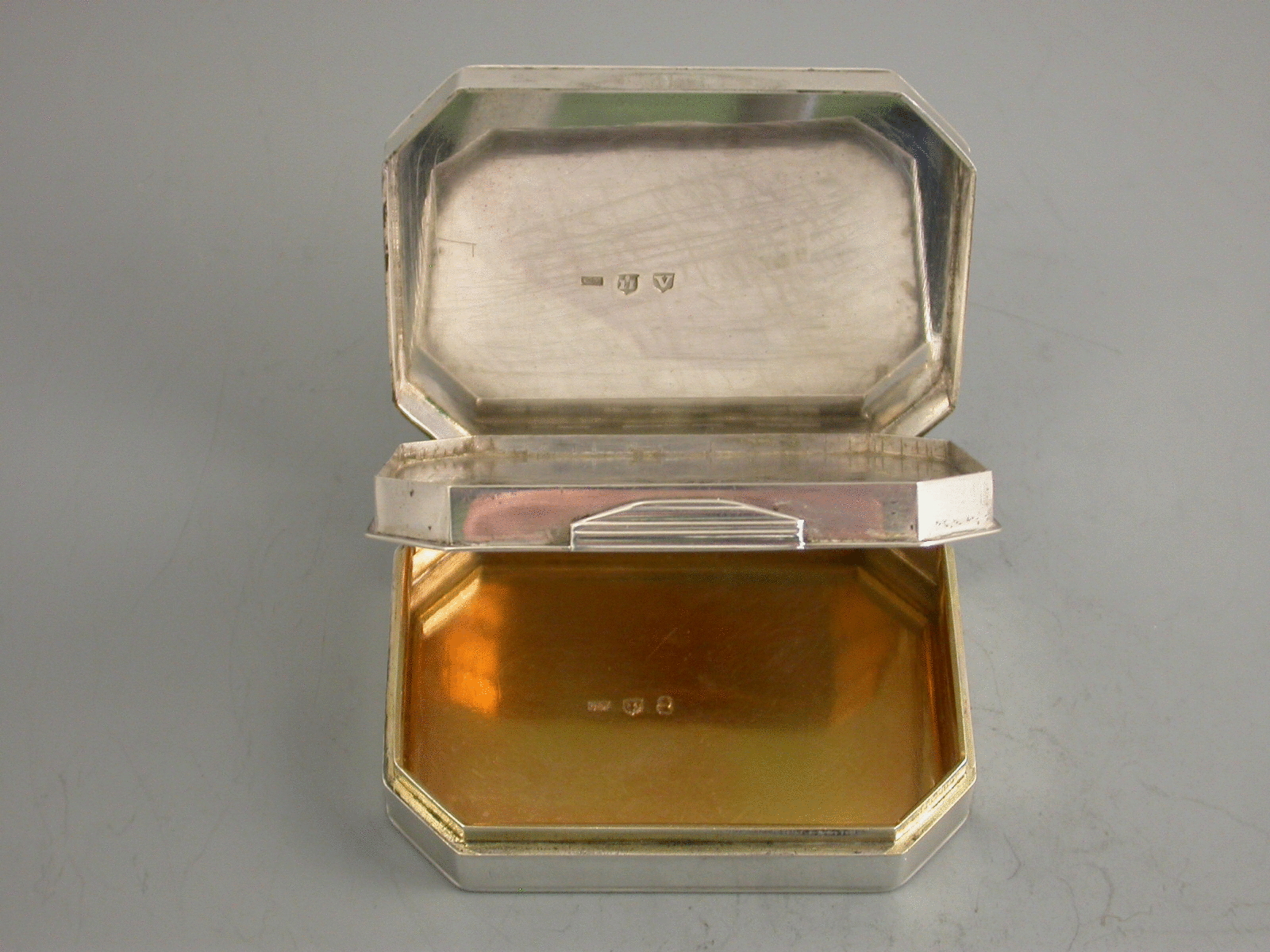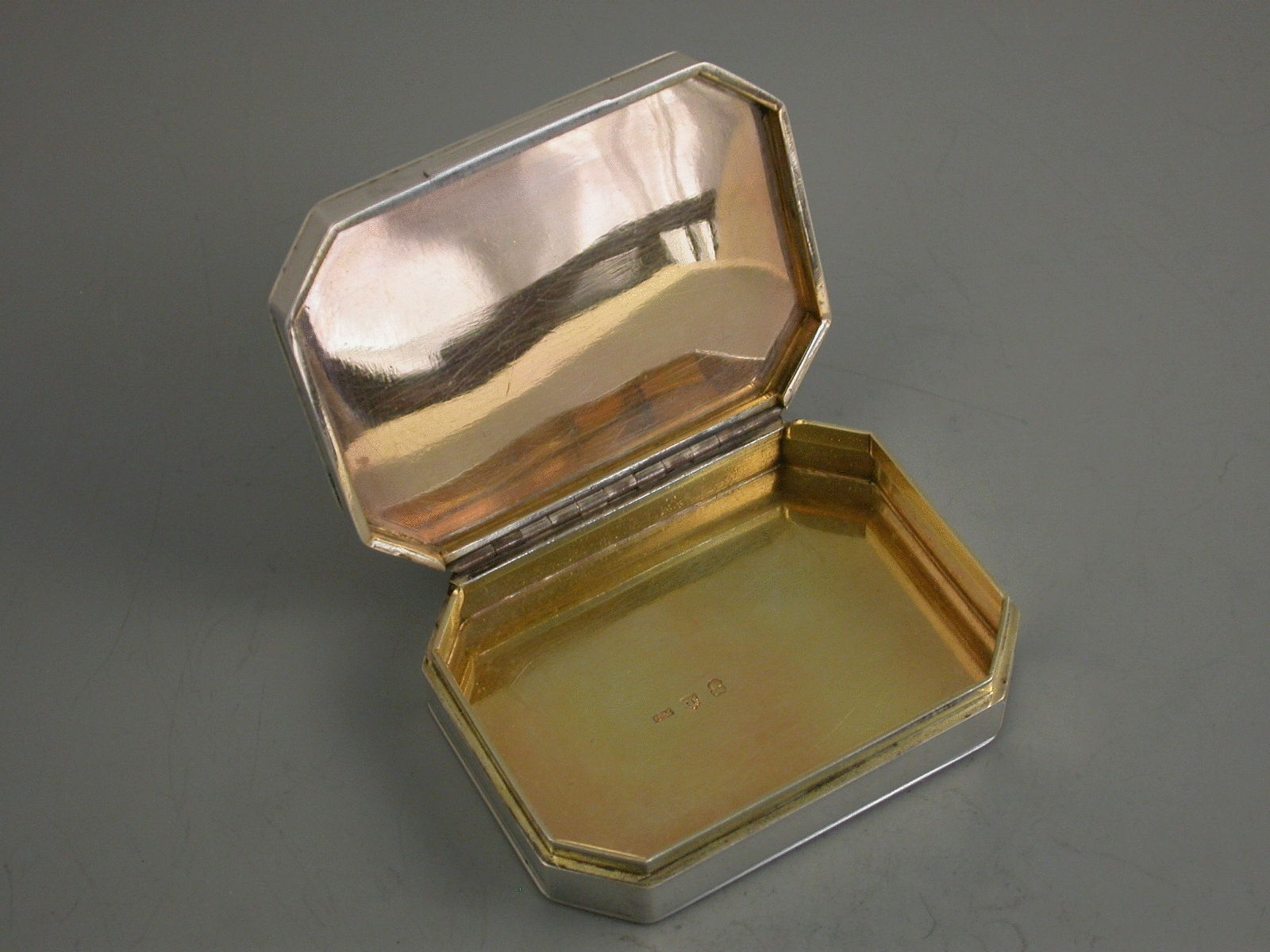 A fine quality George III Scottish silver Snuff Box of perfectly plain rectangular form with canted corners and silver gilt interior, a trick opening second cover to the lid opening to reveal a secret compartment. The only decoration a presentation inscription to the lid: W.Bagenal to J.Gurly.