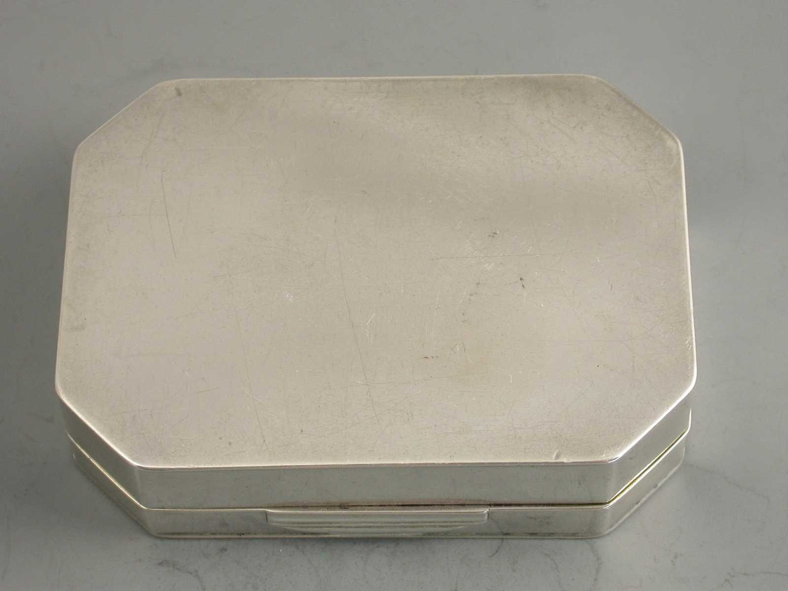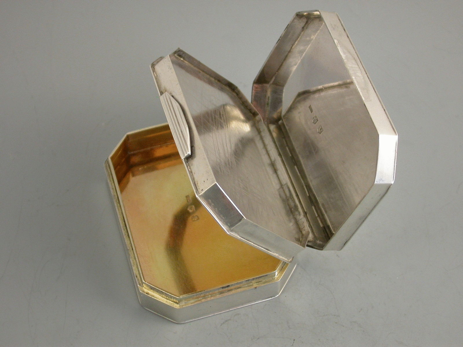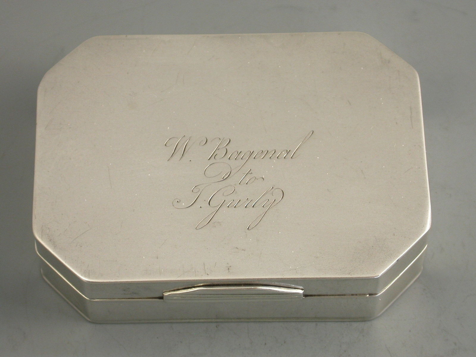 A fine quality George III Scottish silver Snuff Box of perfectly plain rectangular form with canted corners and silver gilt interior, a trick opening second cover to the lid opening to reveal a secret compartment. The only decoration a presentation inscription to the lid: W.Bagenal to J.Gurly.