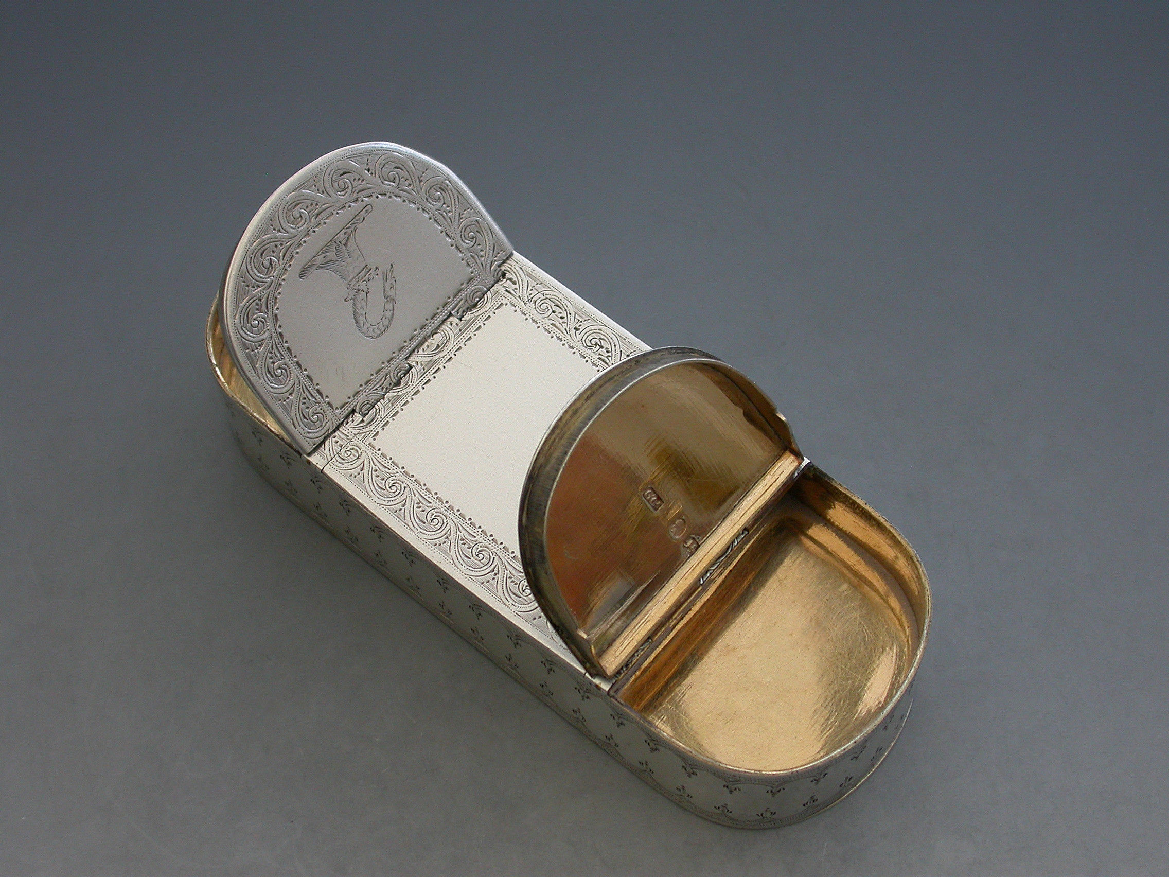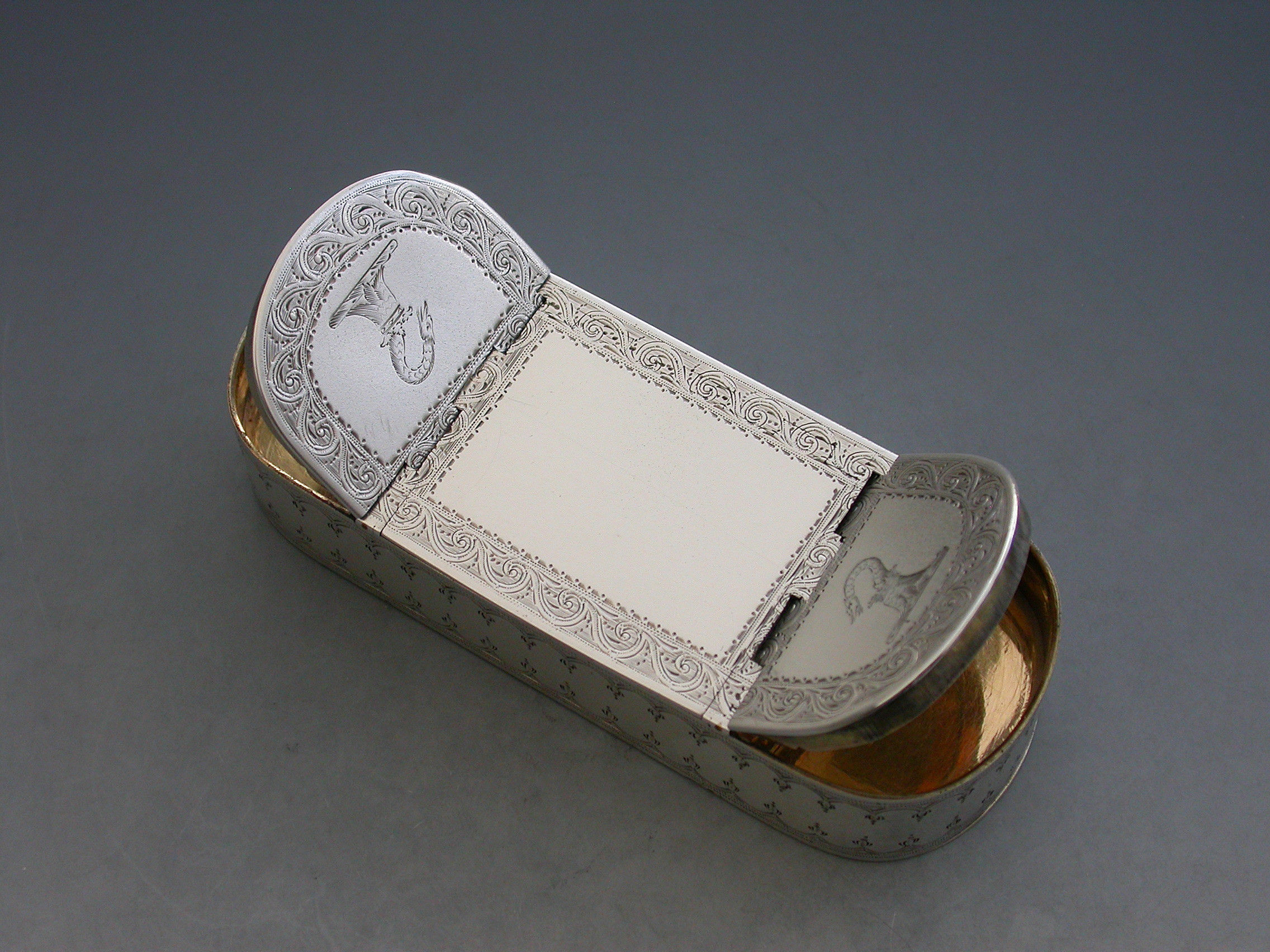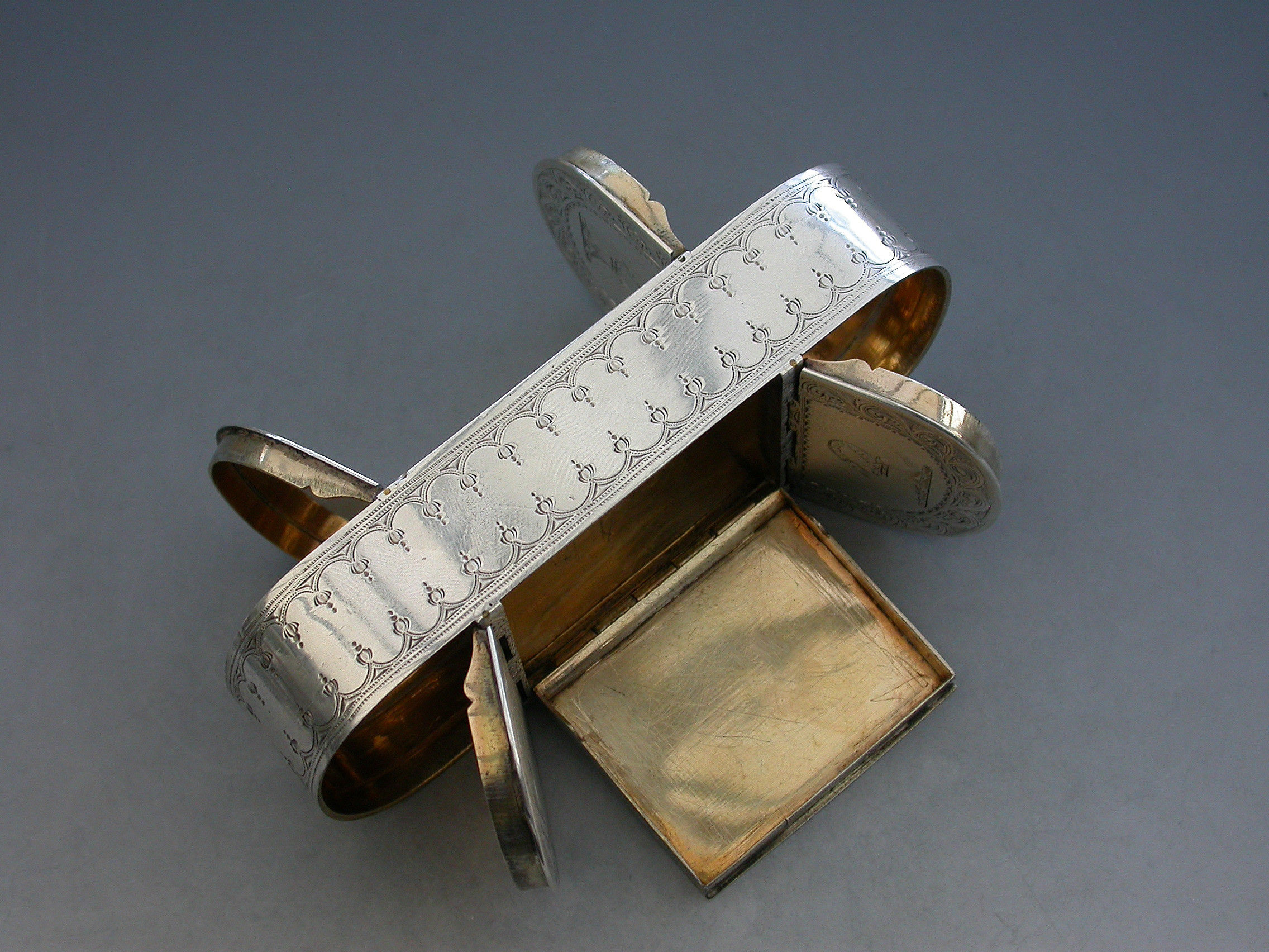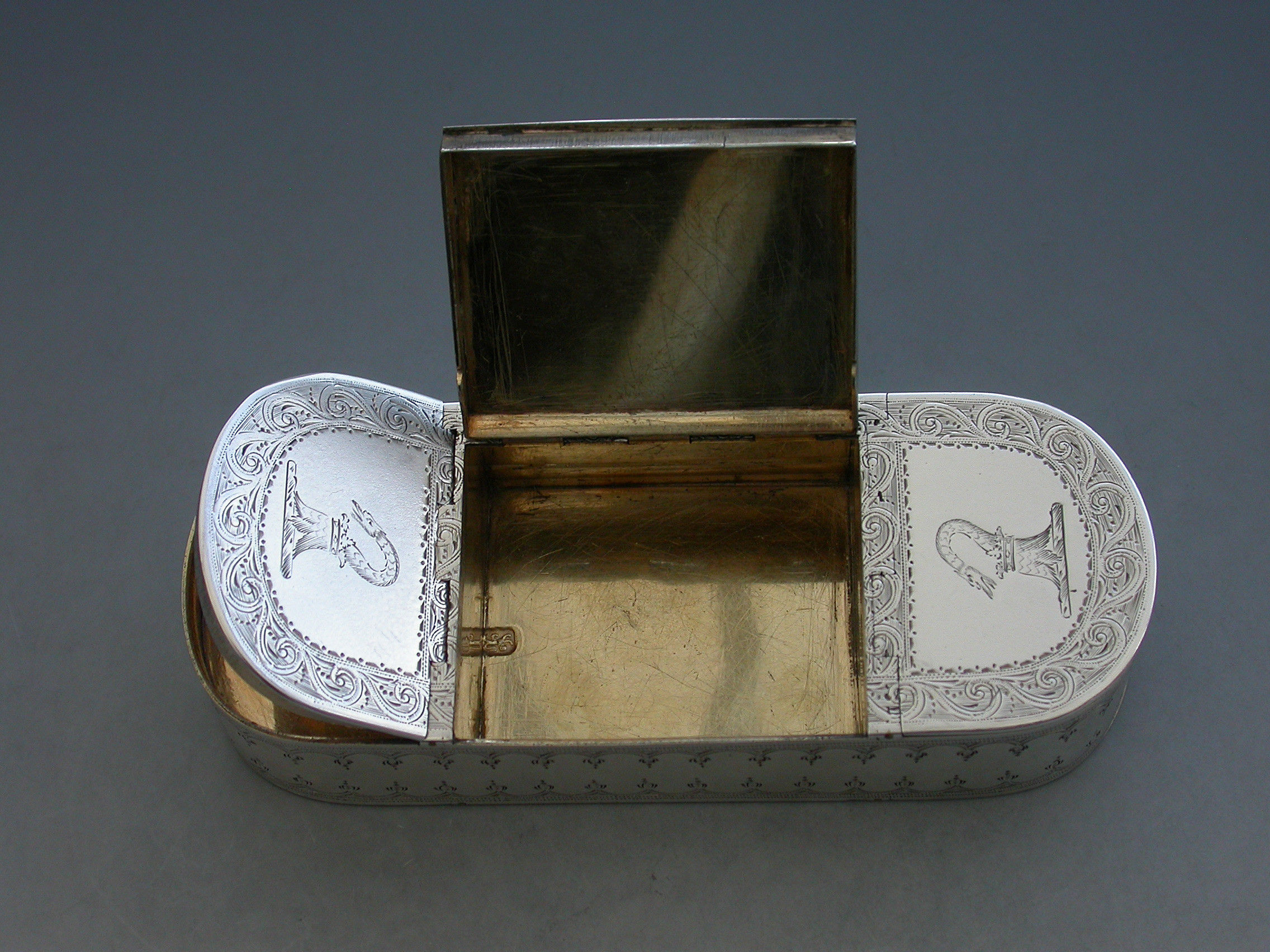 An extremely fine quality George III silver five compartment multi-hinged Snuff Box of rounded rectangular form with bright-cut engraved decoration and borders, the top and bottom engraved with two crests. Five flat concealed hinges with lids opening to reveal the silver gilt interior to five separate compartments.