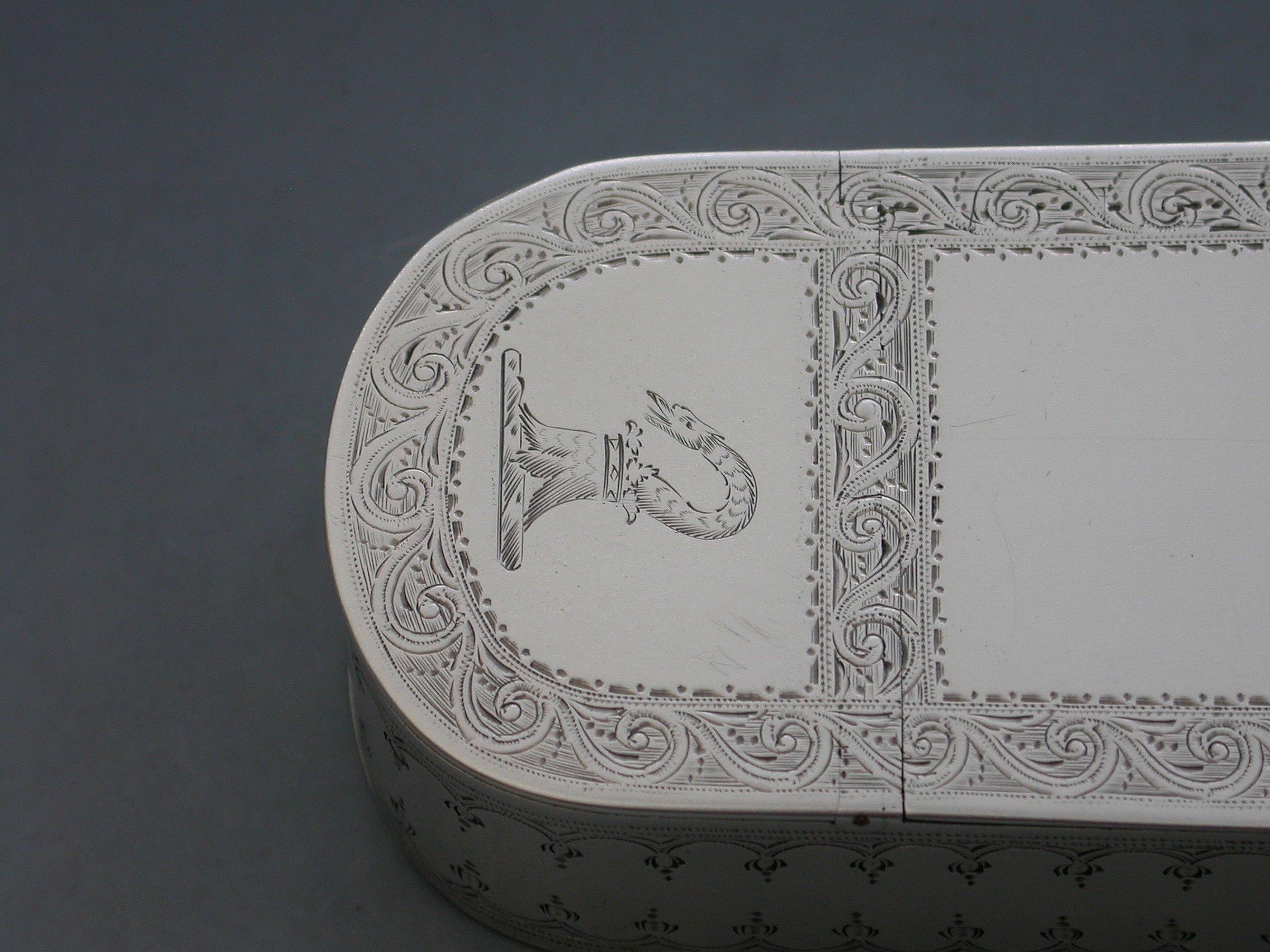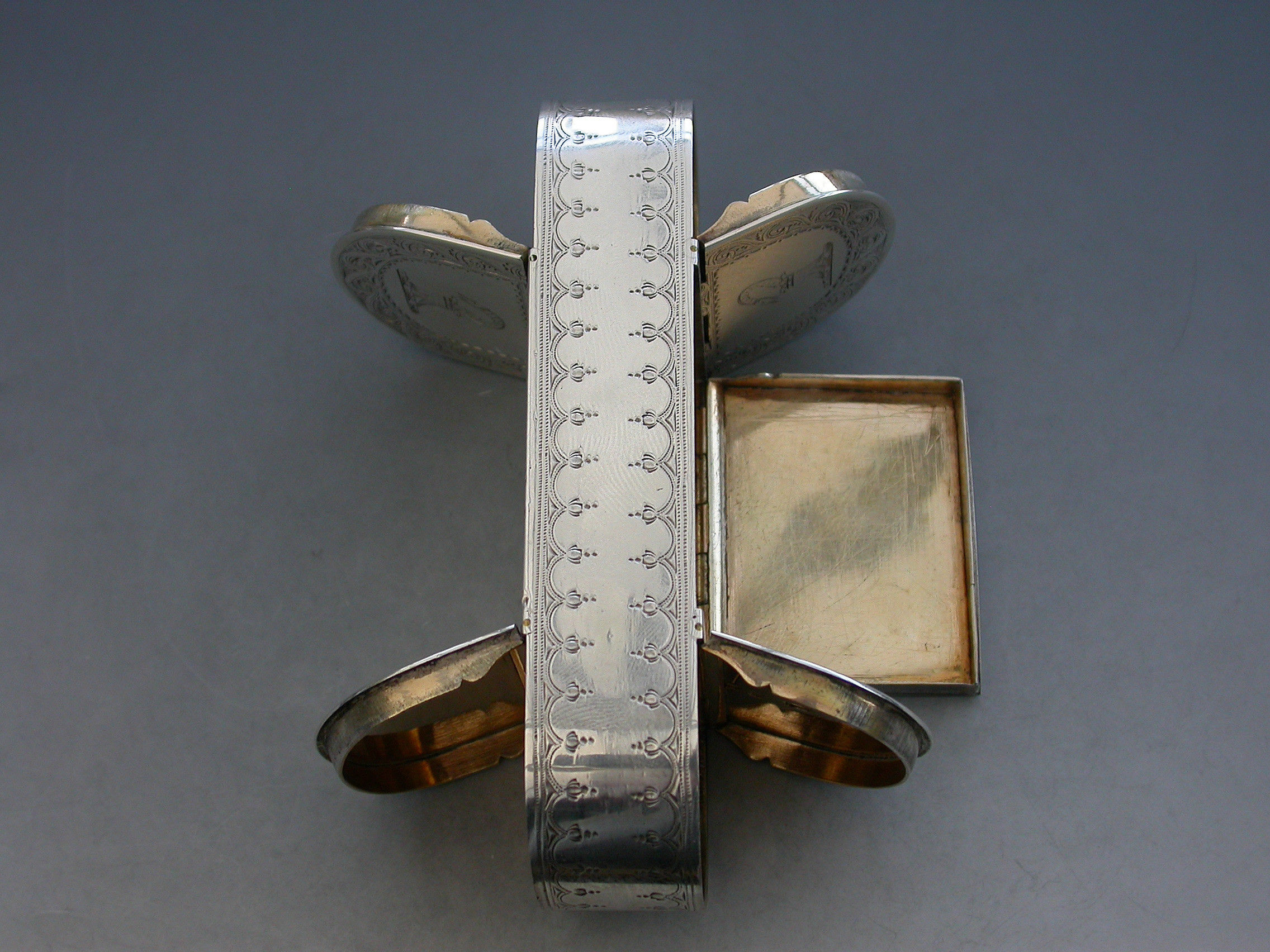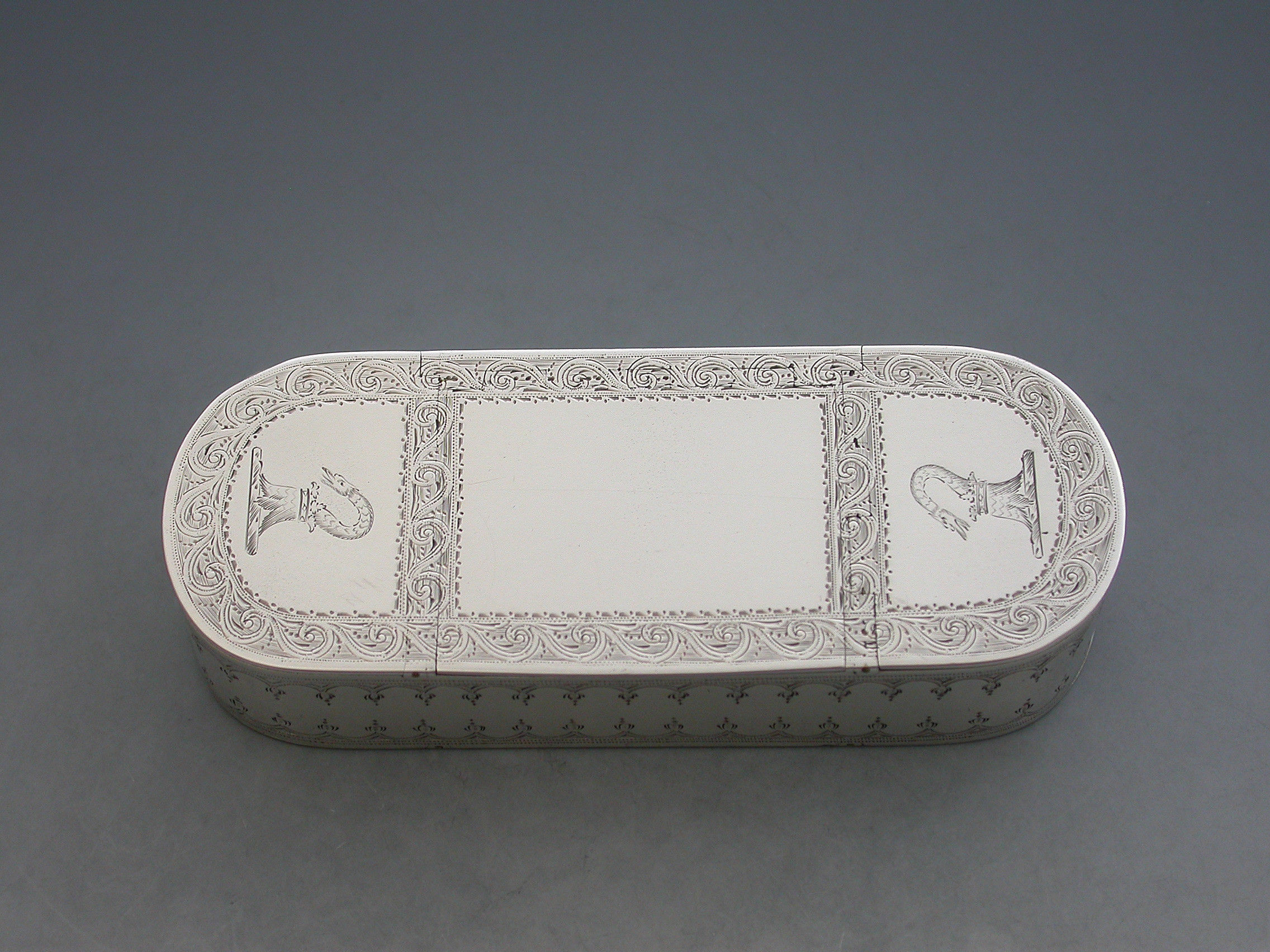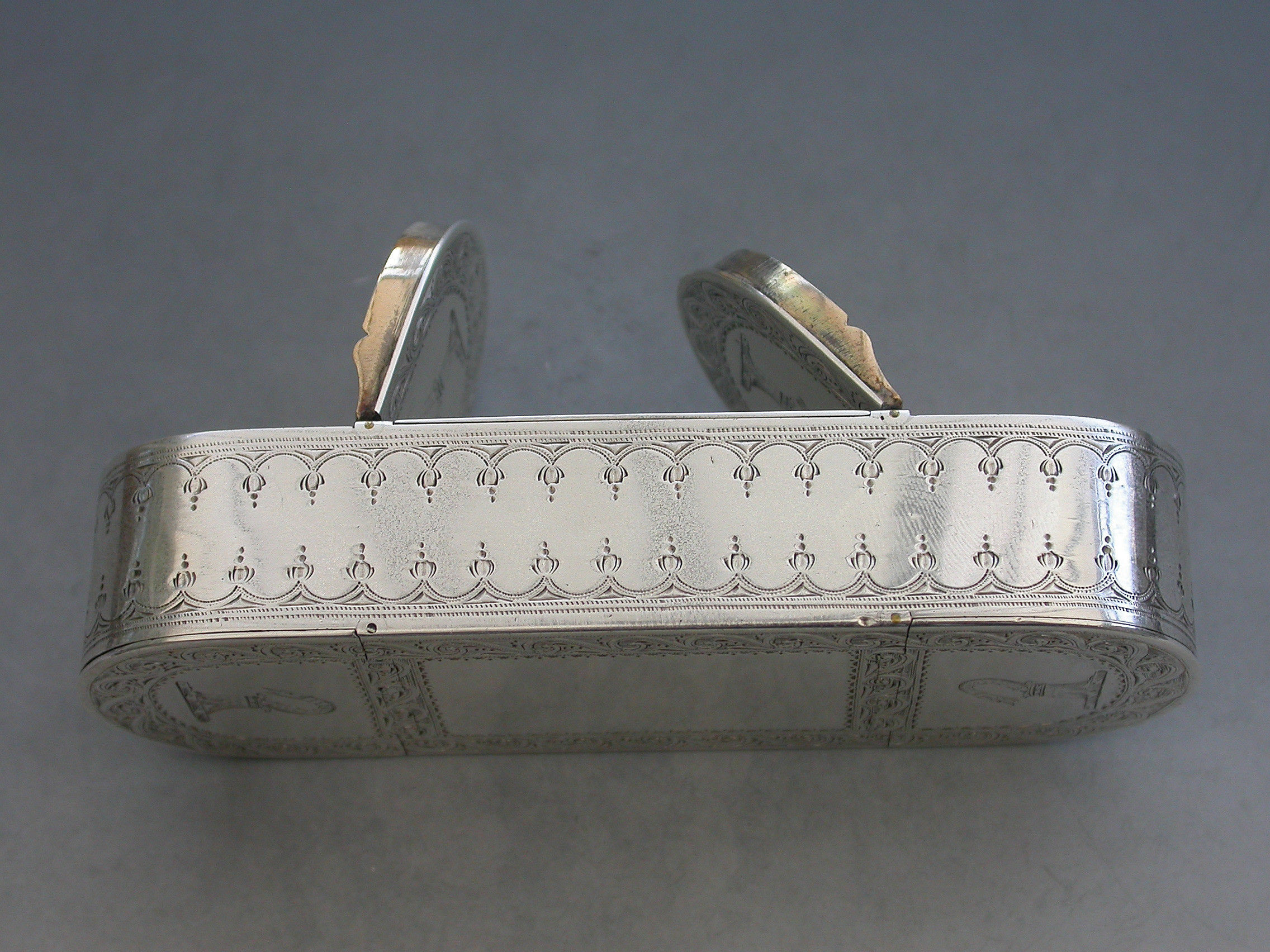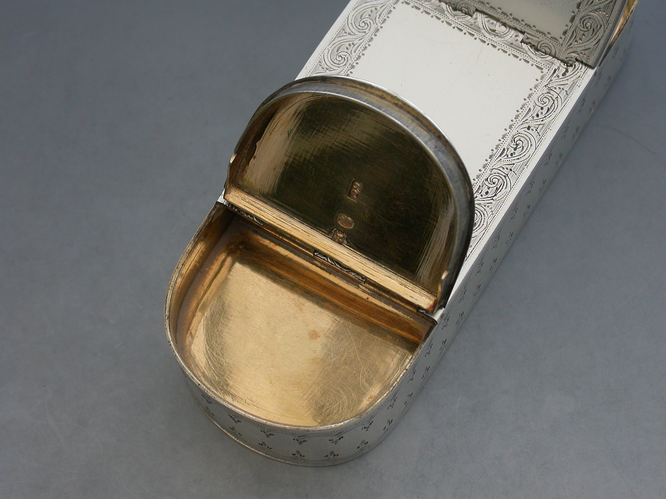 An extremely fine quality George III silver five compartment multi-hinged Snuff Box of rounded rectangular form with bright-cut engraved decoration and borders, the top and bottom engraved with two crests. Five flat concealed hinges with lids opening to reveal the silver gilt interior to five separate compartments.