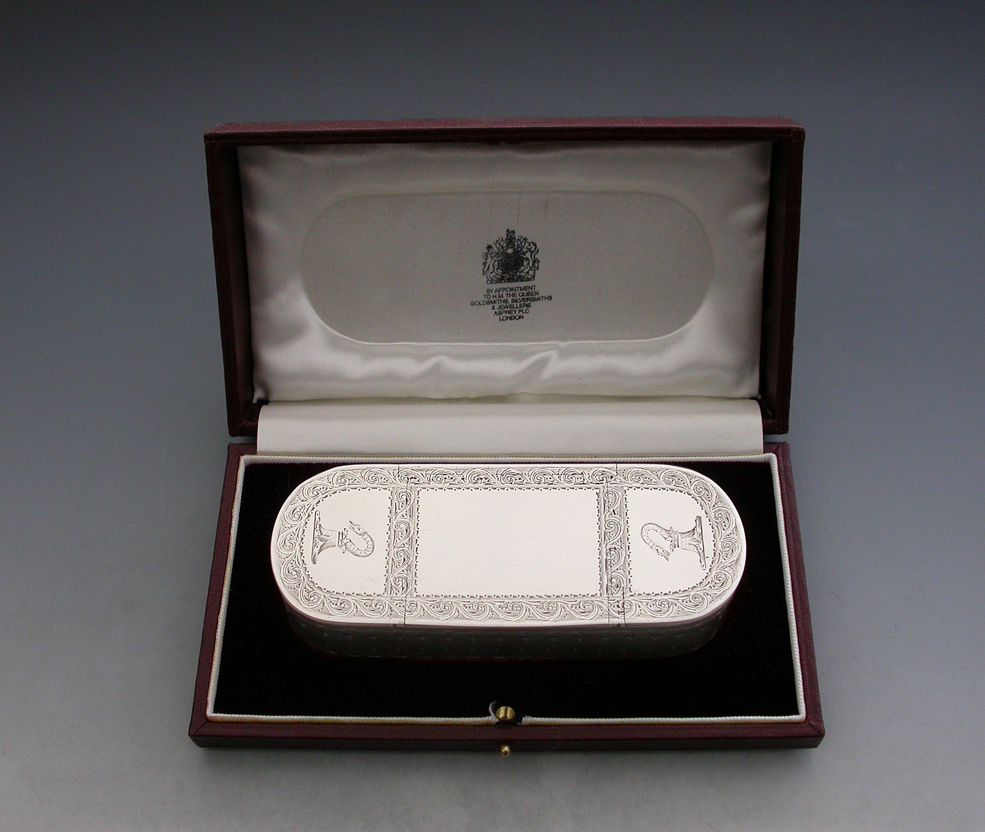 Complete with silk and velvet lined red leather fitted retailer's case by Asprey Plc.