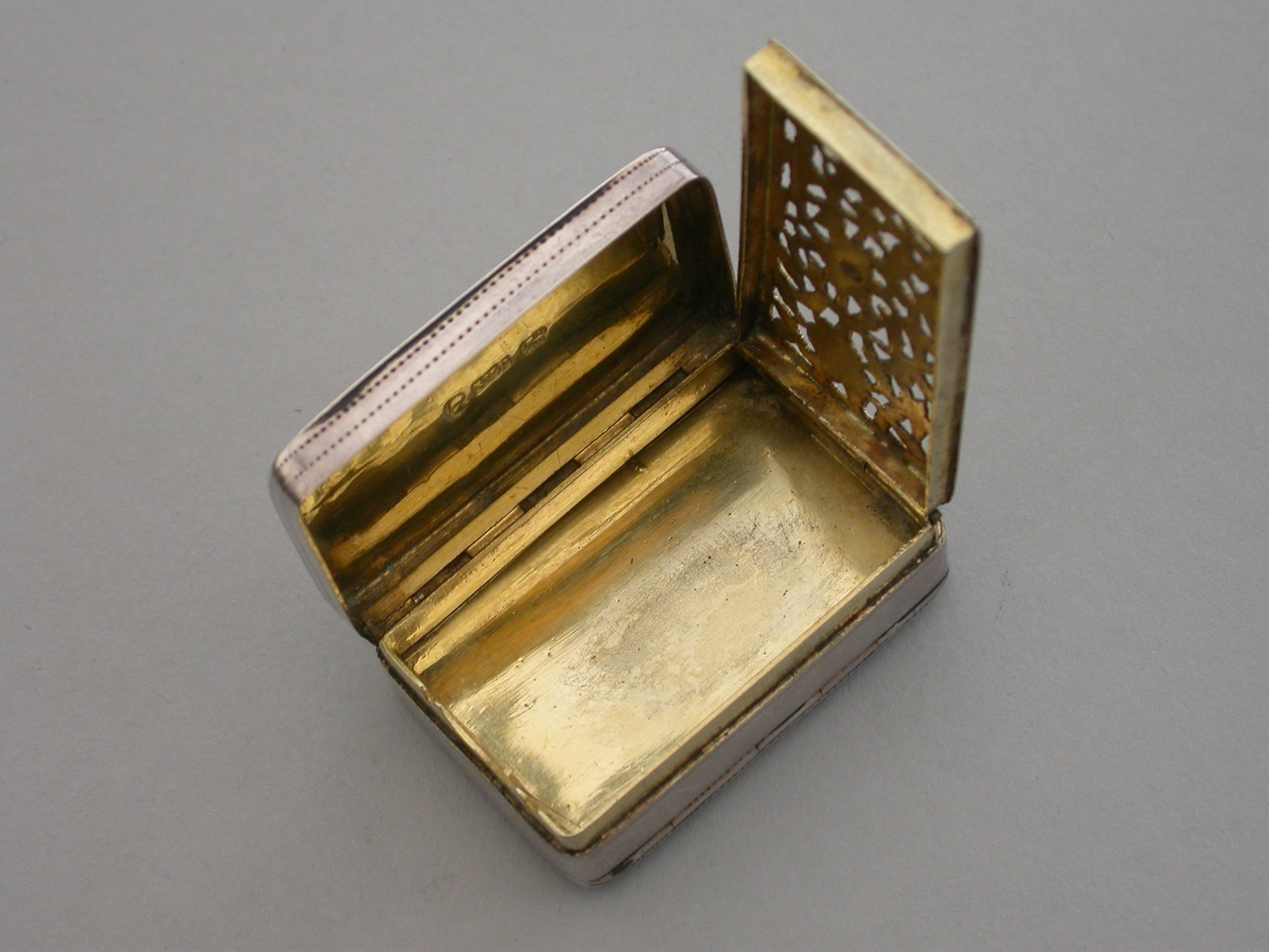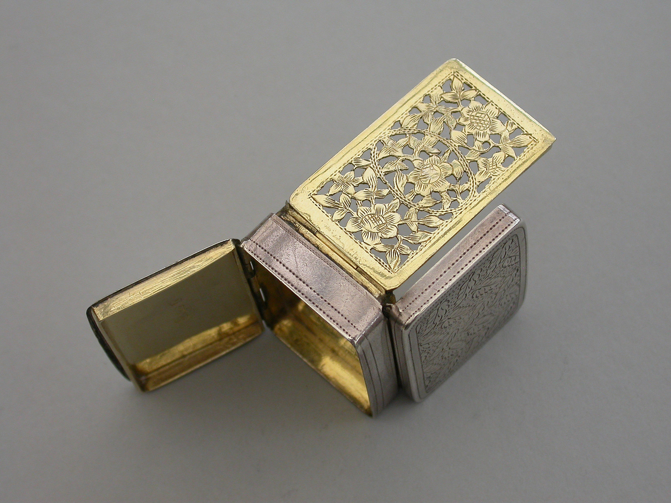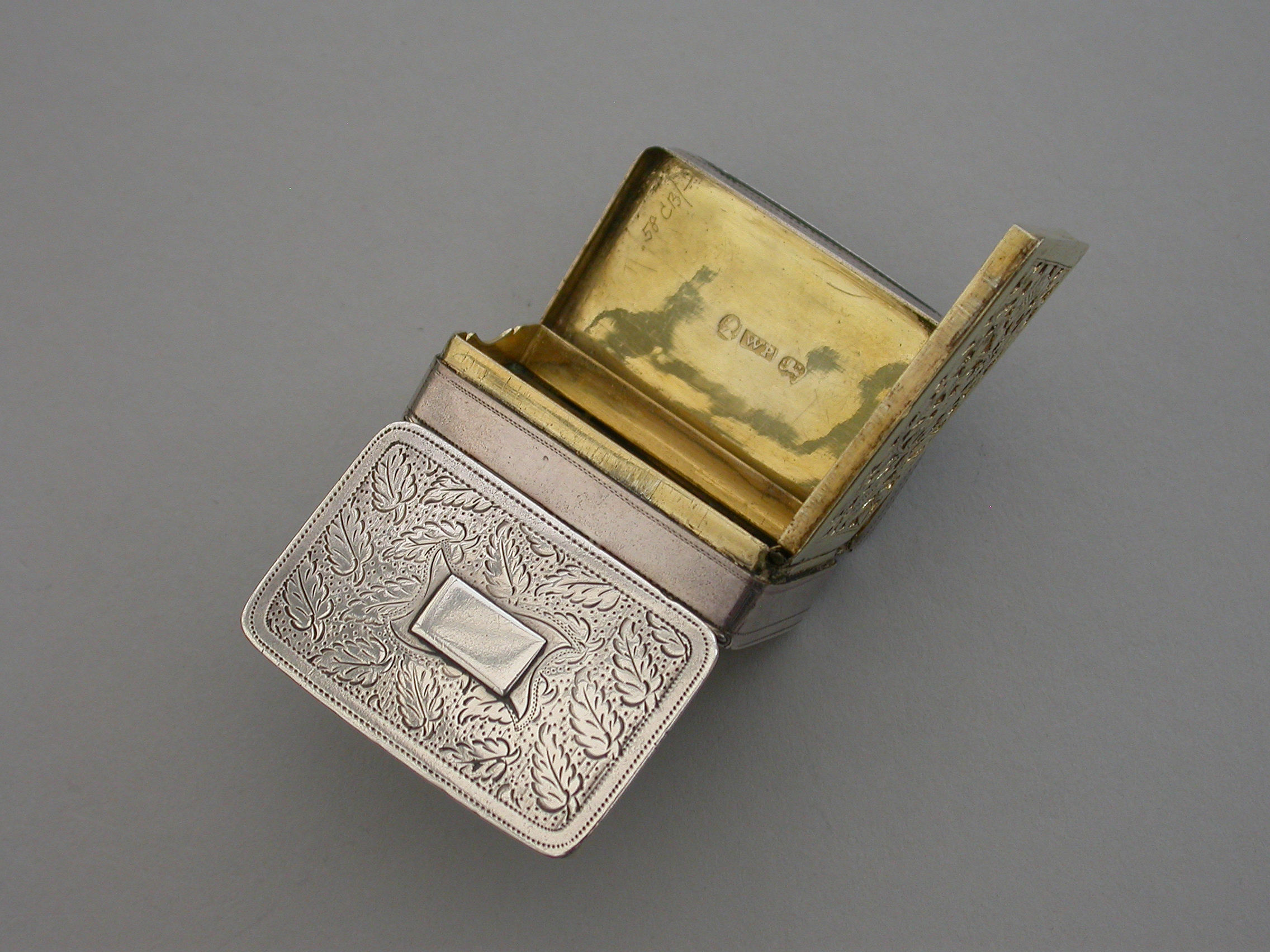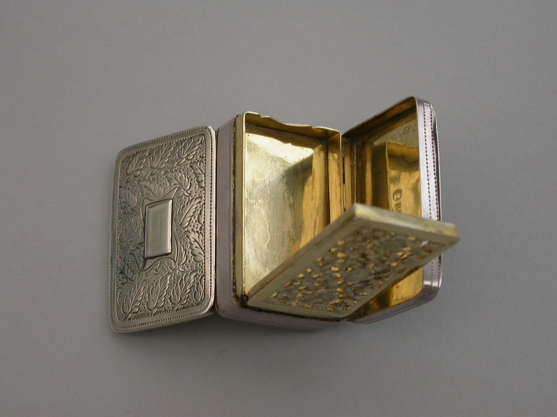 A rare George III silver combination Snuff Box and Vinaigrette of rounded rectangular form, the lid and base with foliate and prick-dot decoration, a vacant rectangular cartouche to the lid. Silver gilt interior.