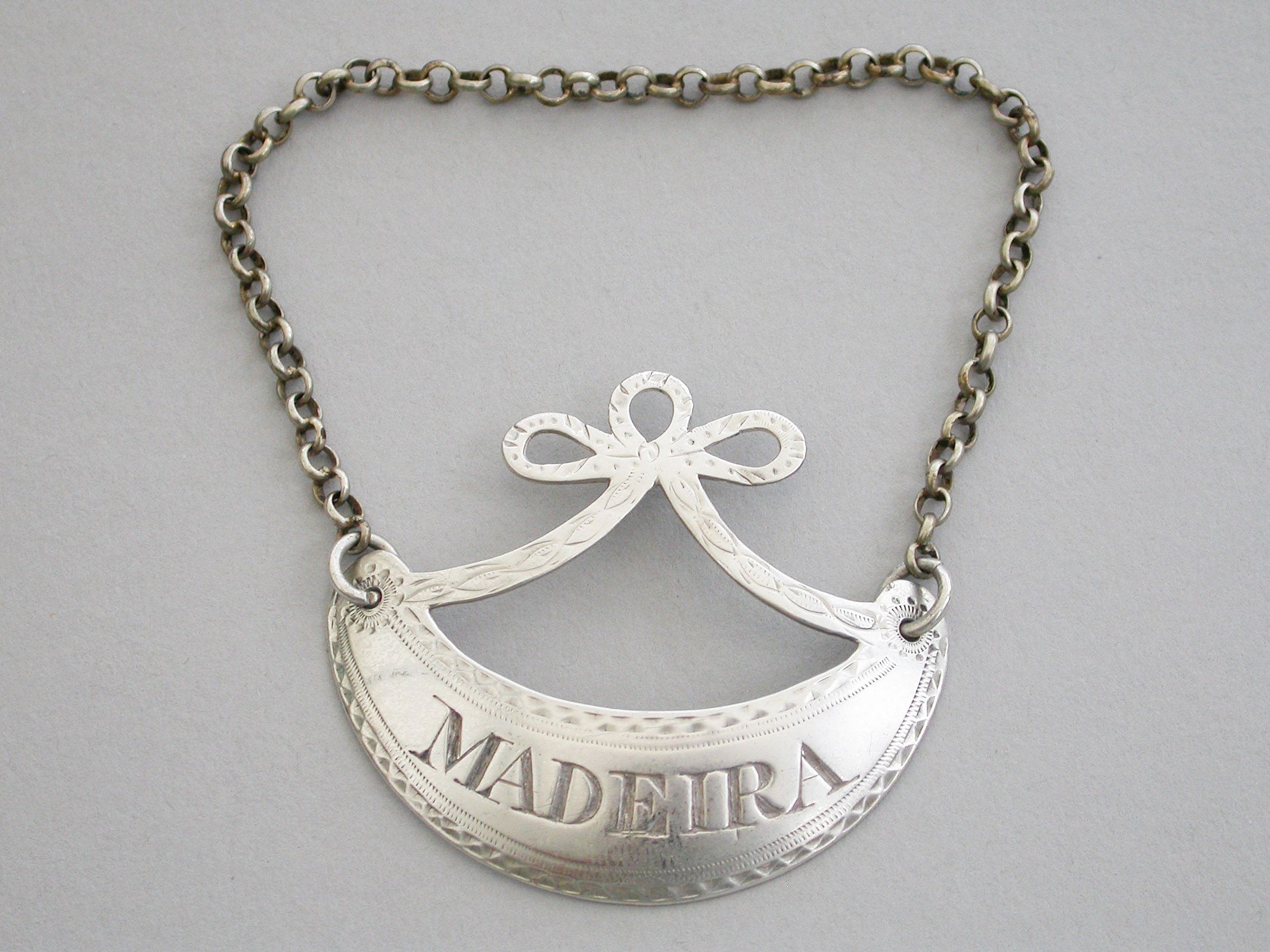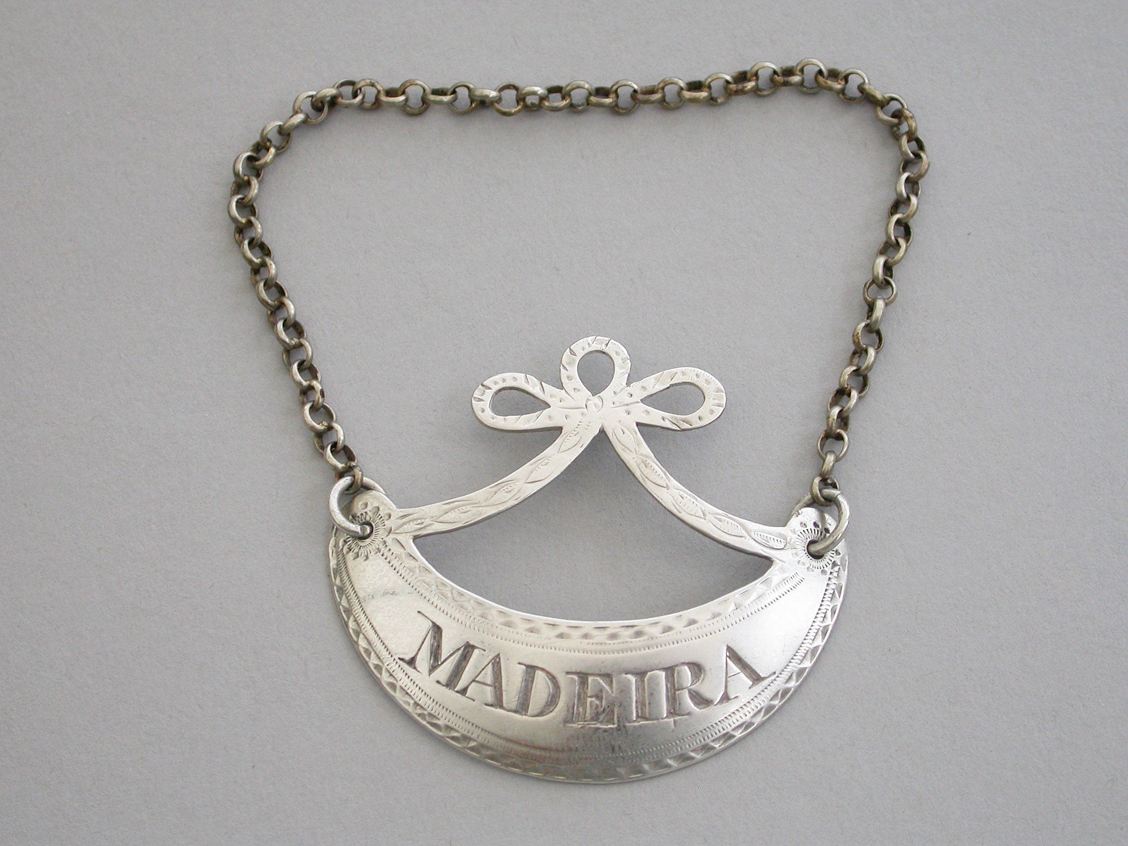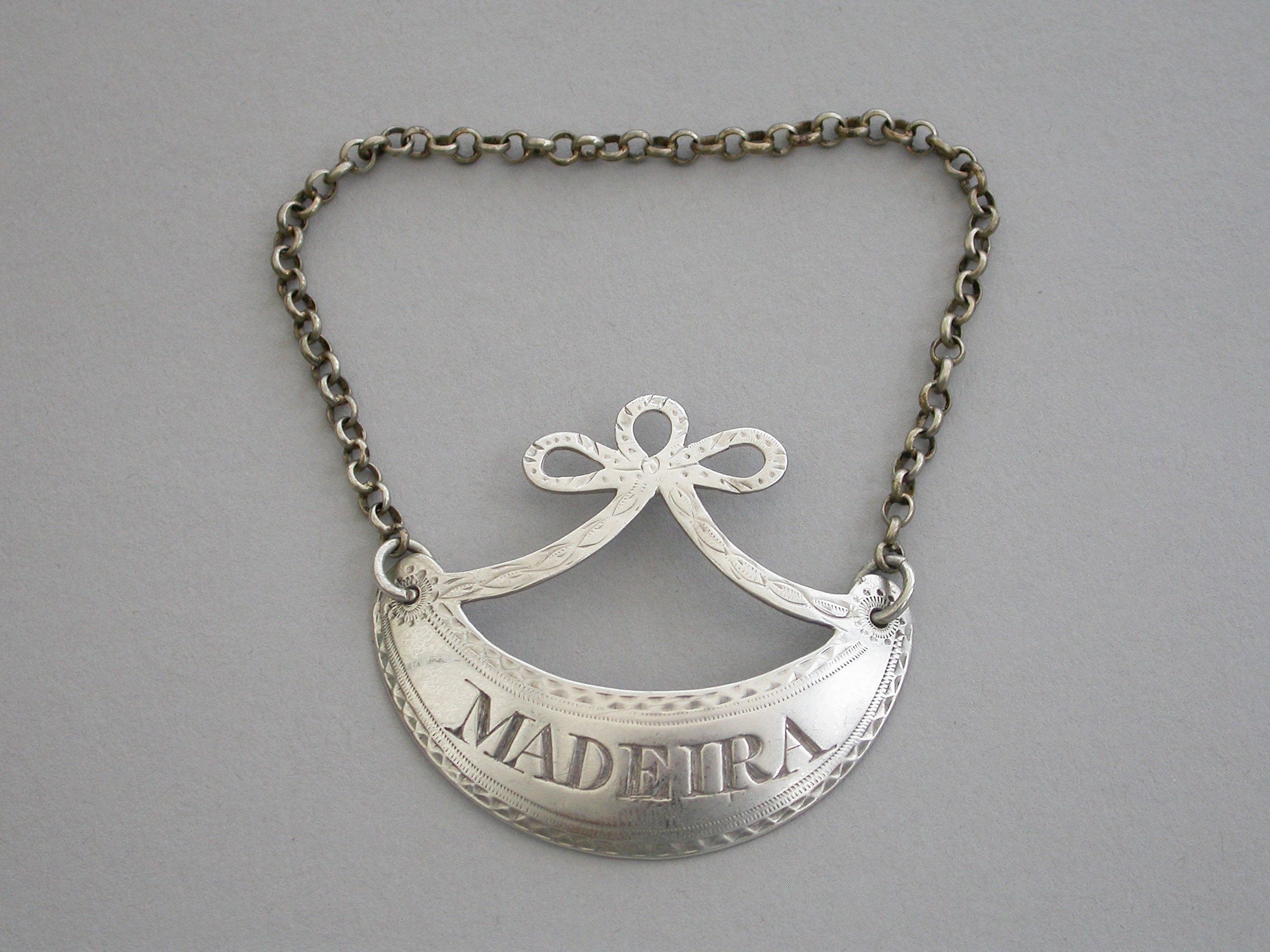 A good George III silver Wine Label of crescent shape with tied ribbon and festoon surmount, bright cut engraved borders, incised for Madeira.