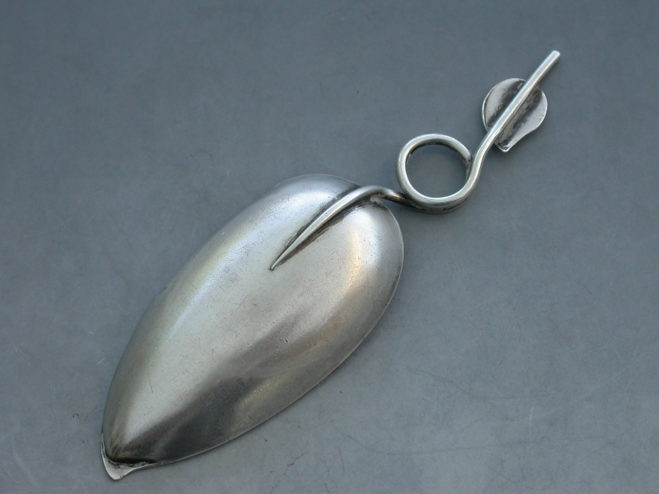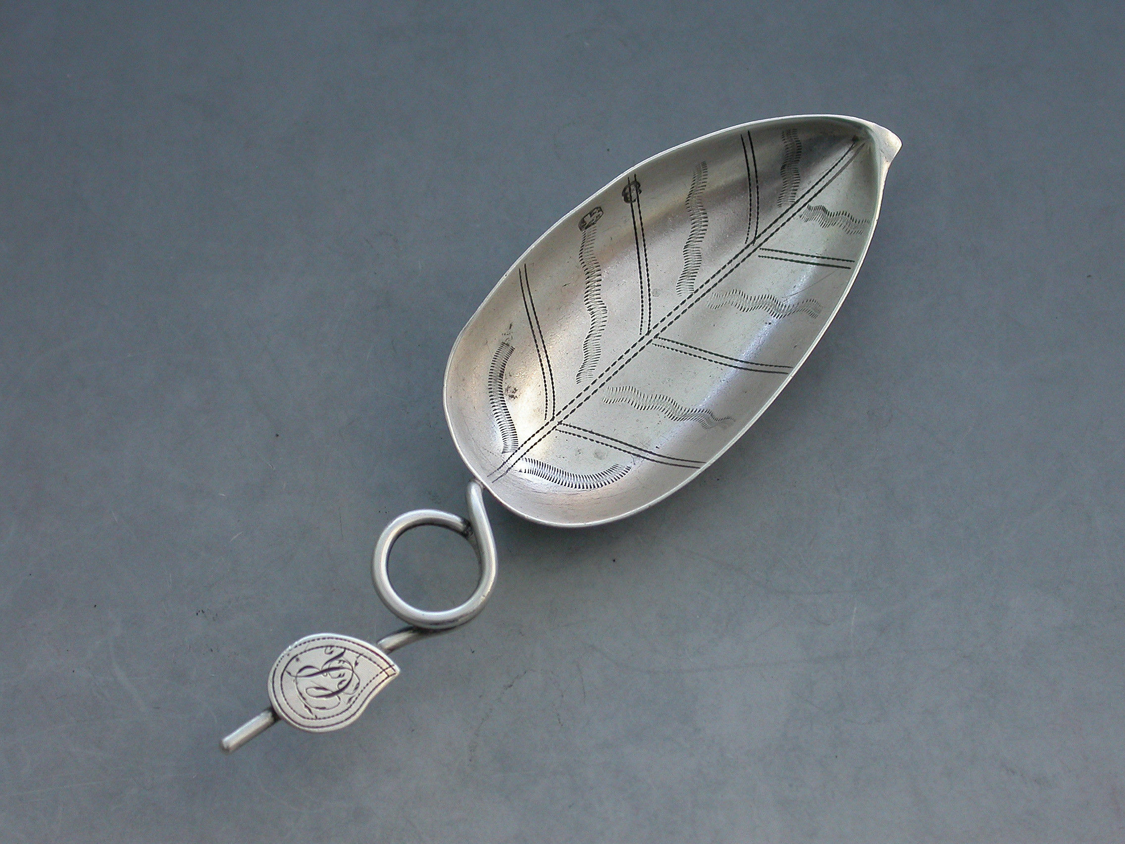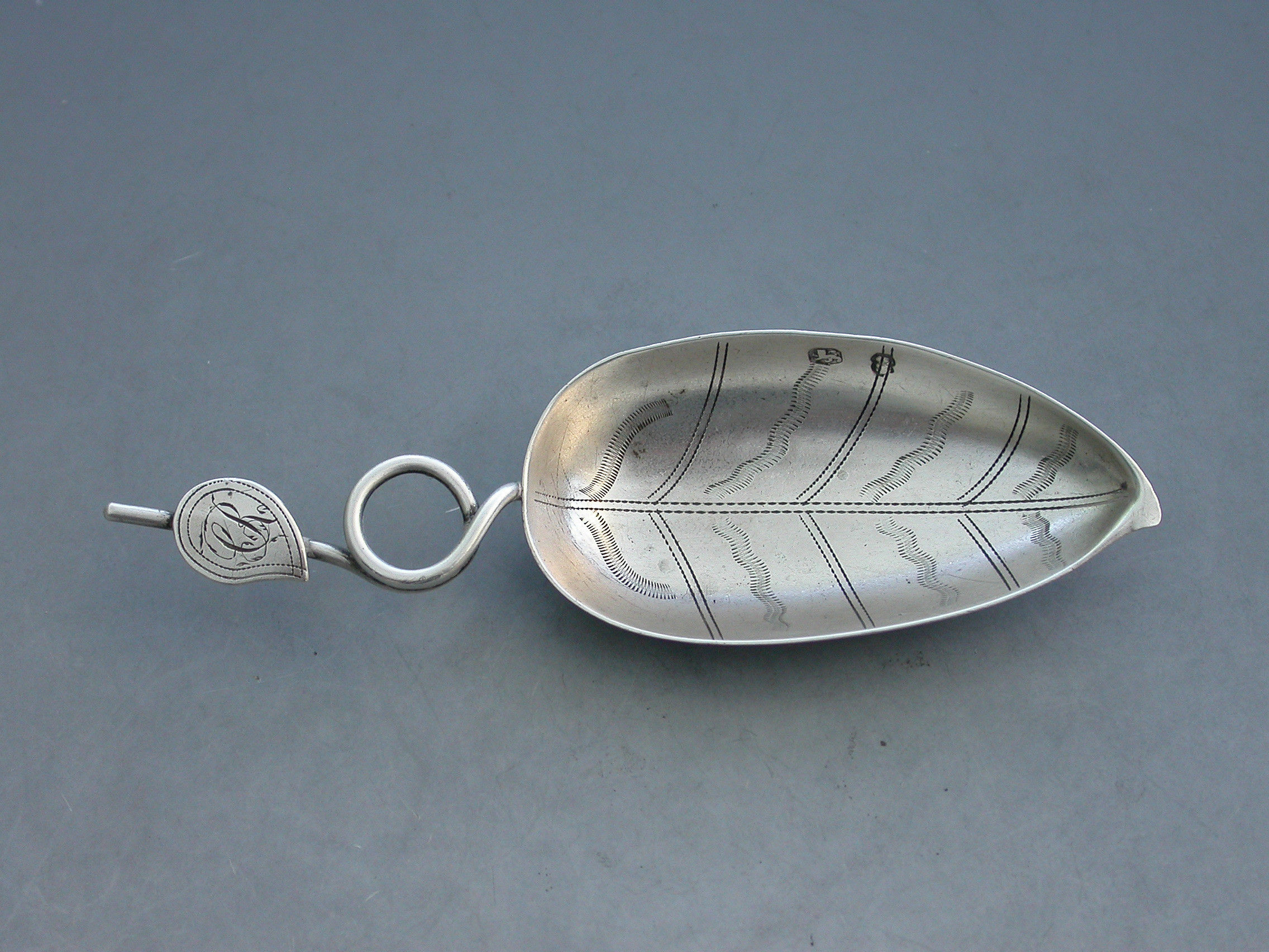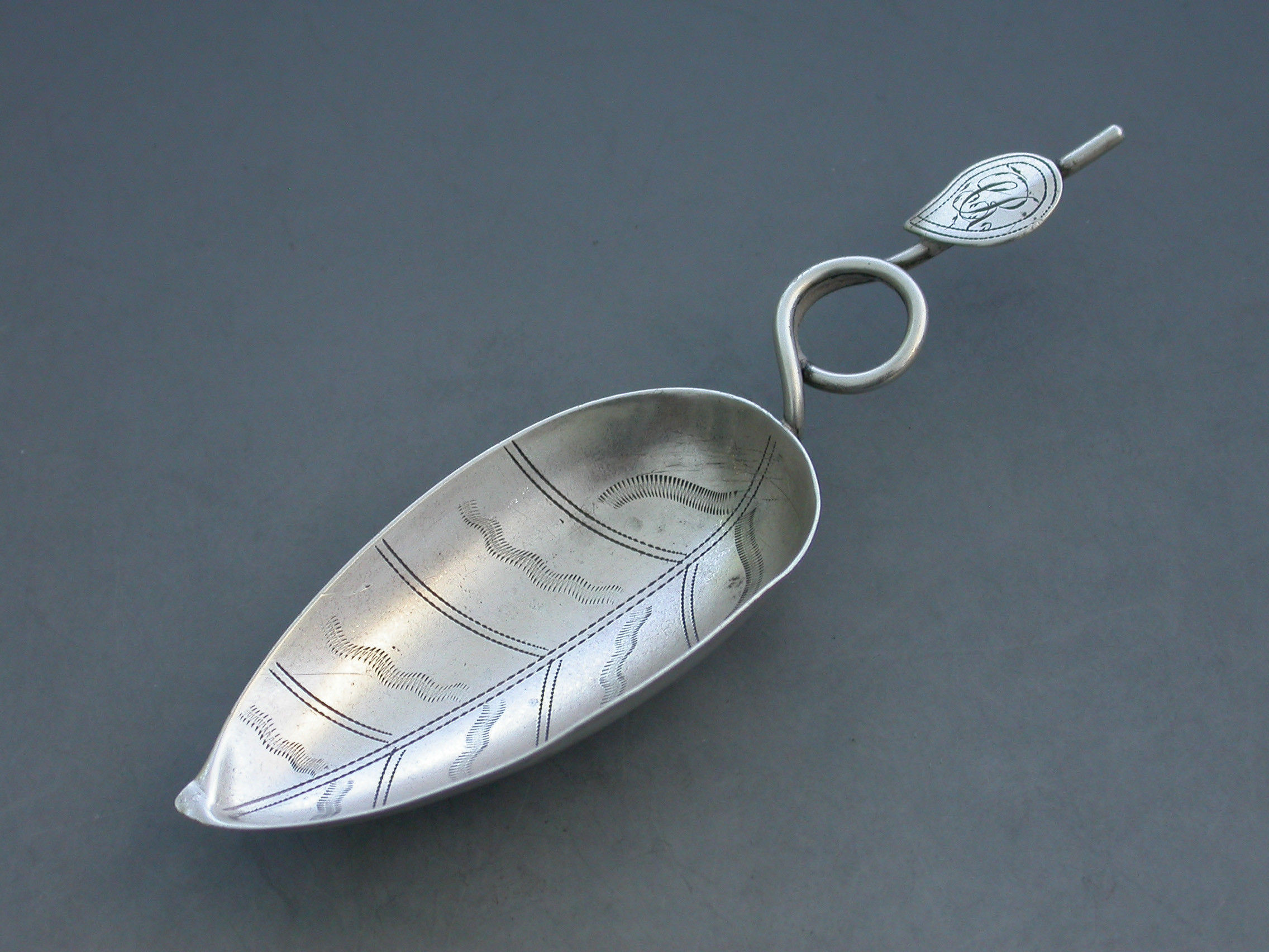 A good George III silver Caddy Spoon, the tea-leaf shape bowl engraved with veins, the twisted loop handle applied with an additional leaf shaped cartouche engraved with contemporary initials.