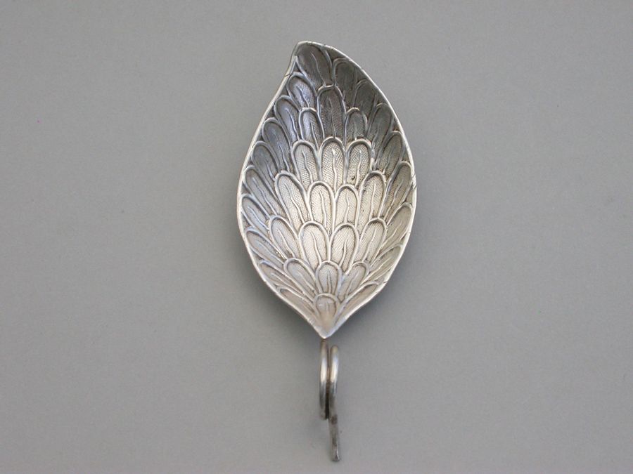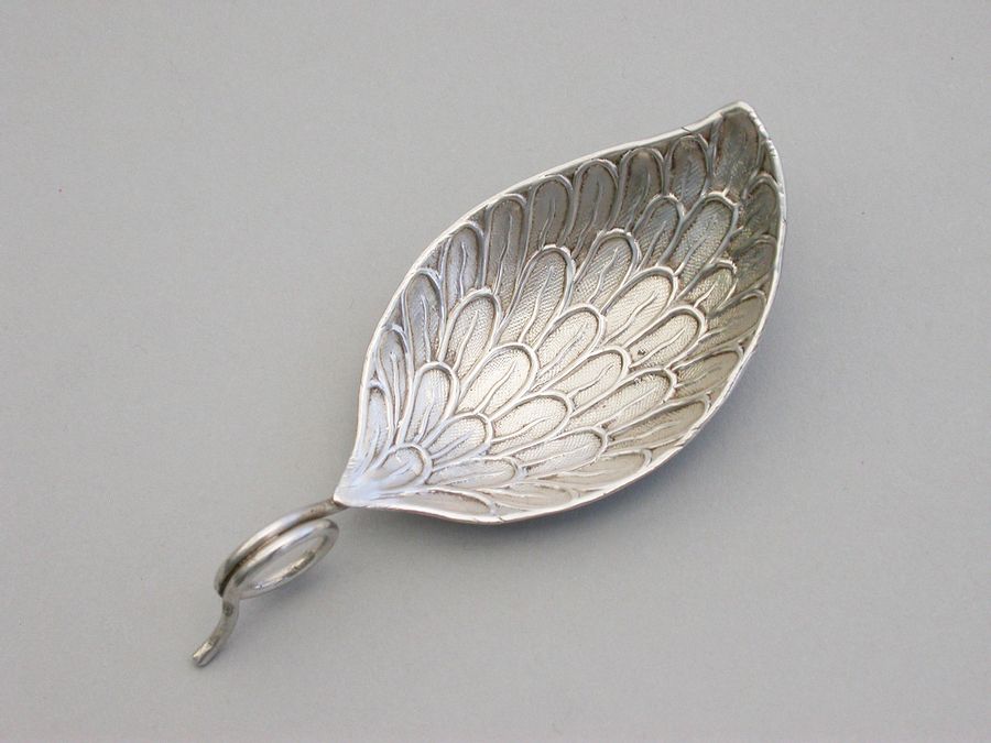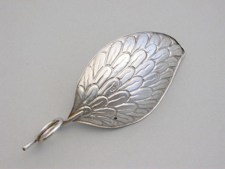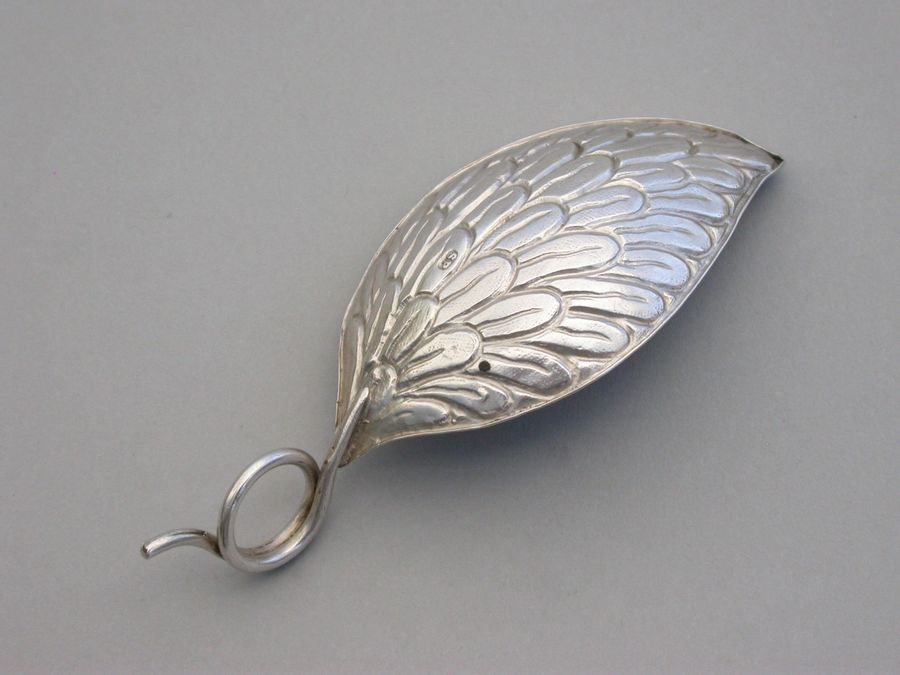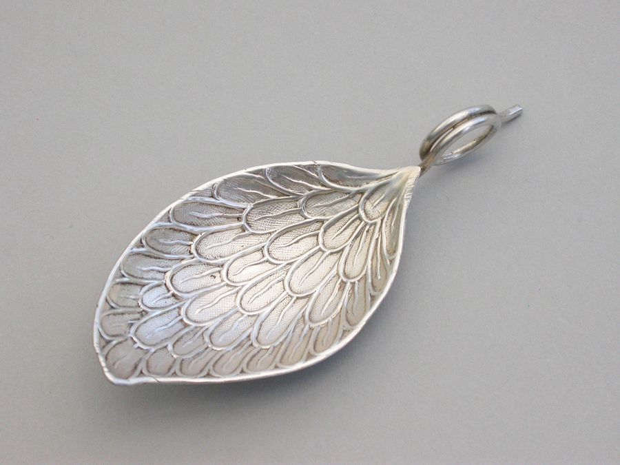 A George III die-stamped silver Caddy Spoon made in the form of a feather with twisted wire ring handle.
