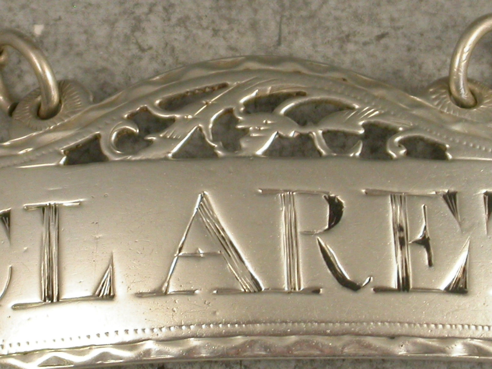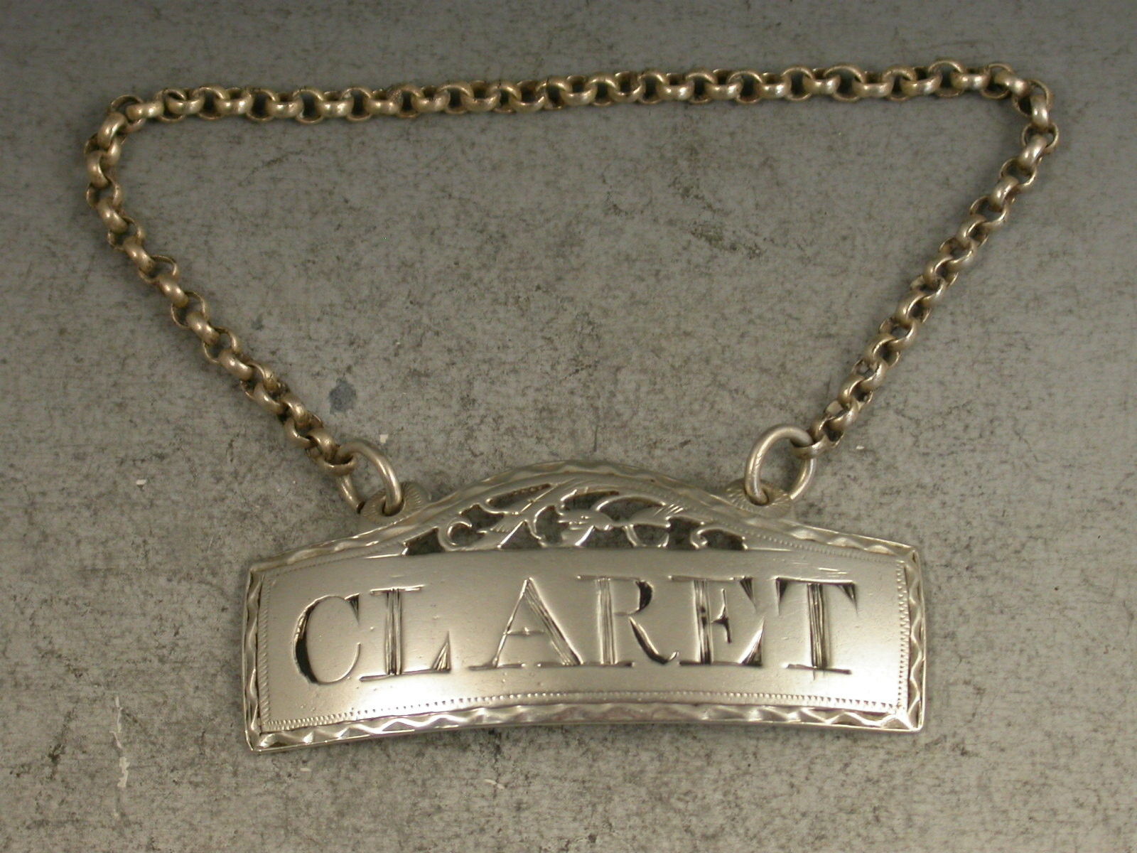 A George III silver Wine Label of rectangular form with fret pierced domed surmount and bright-cut engraved border, incised for Claret.