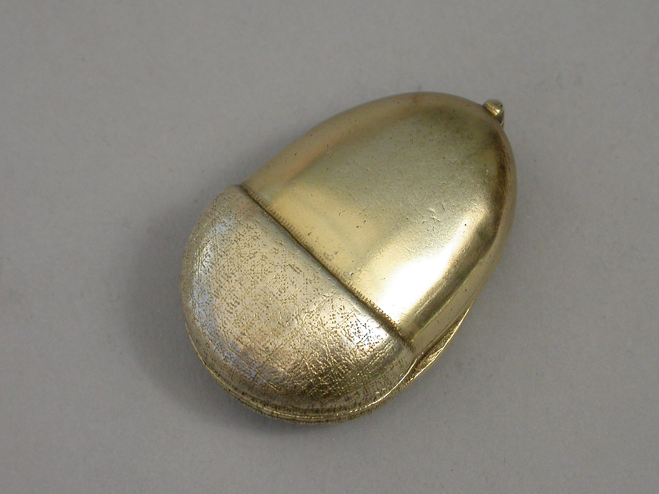 A rare George III silver gilt Vinaigrette made in the form of an Acorn, with matt engraved patterned cup, the silver gilt grille pierced with a single fern leaf.