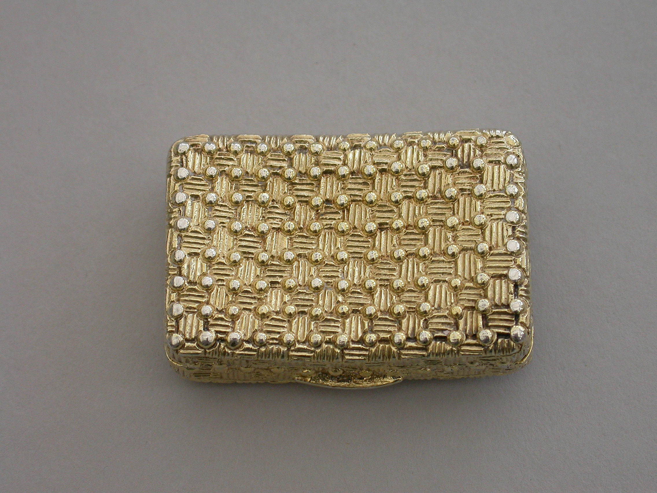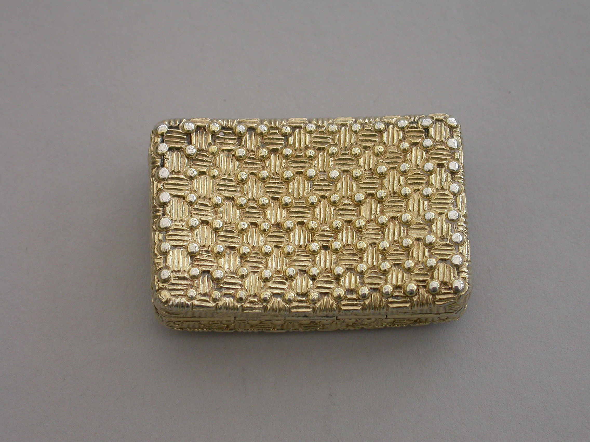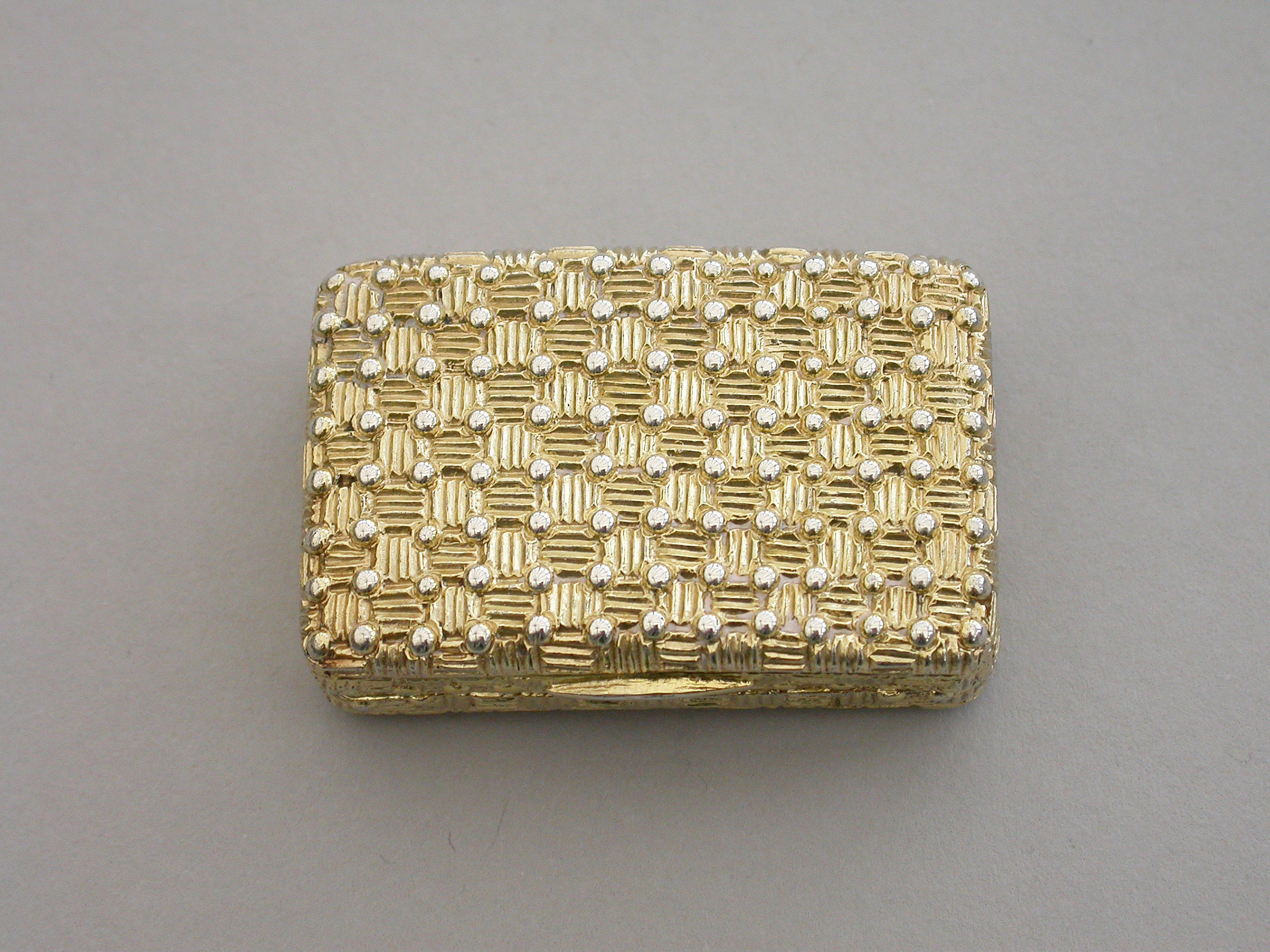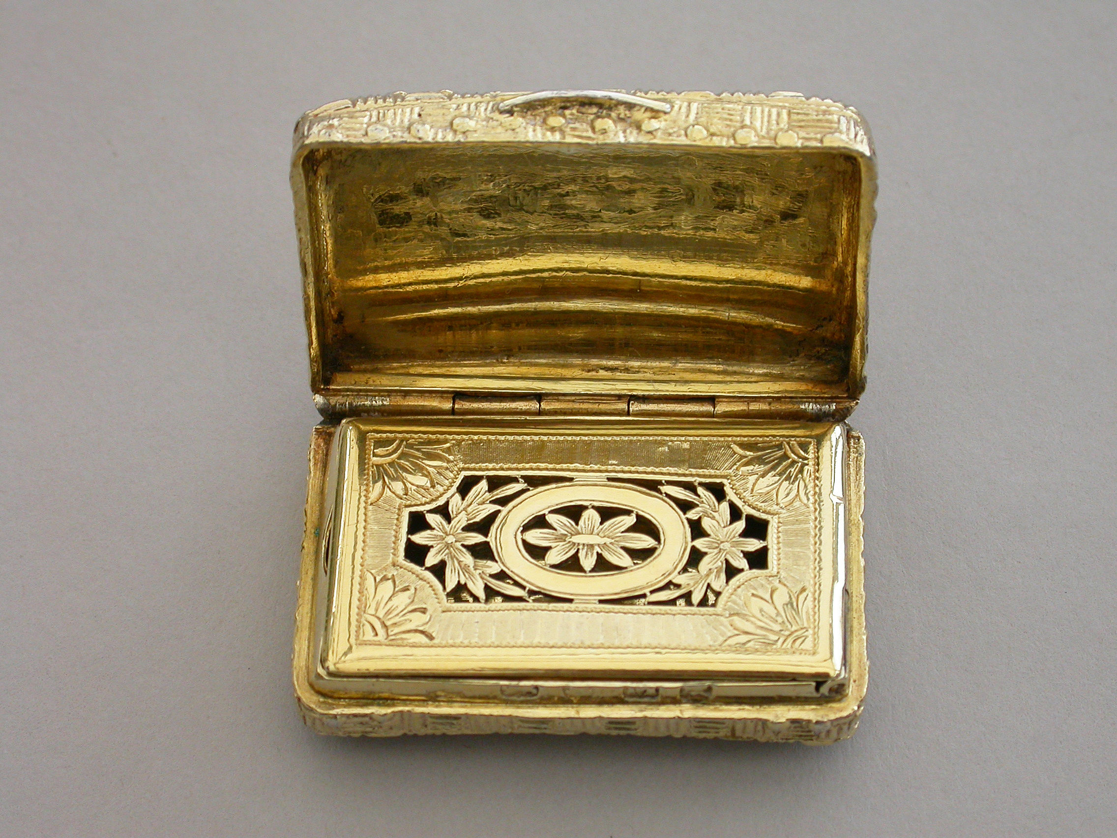 A good quality George III silver gilt Vinaigrette of curved rectangular form with all over basket weave and bead decoration. The silver gilt interior with pierced flower head grille.