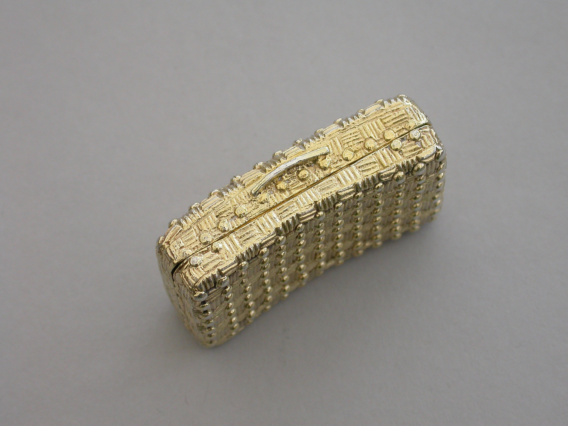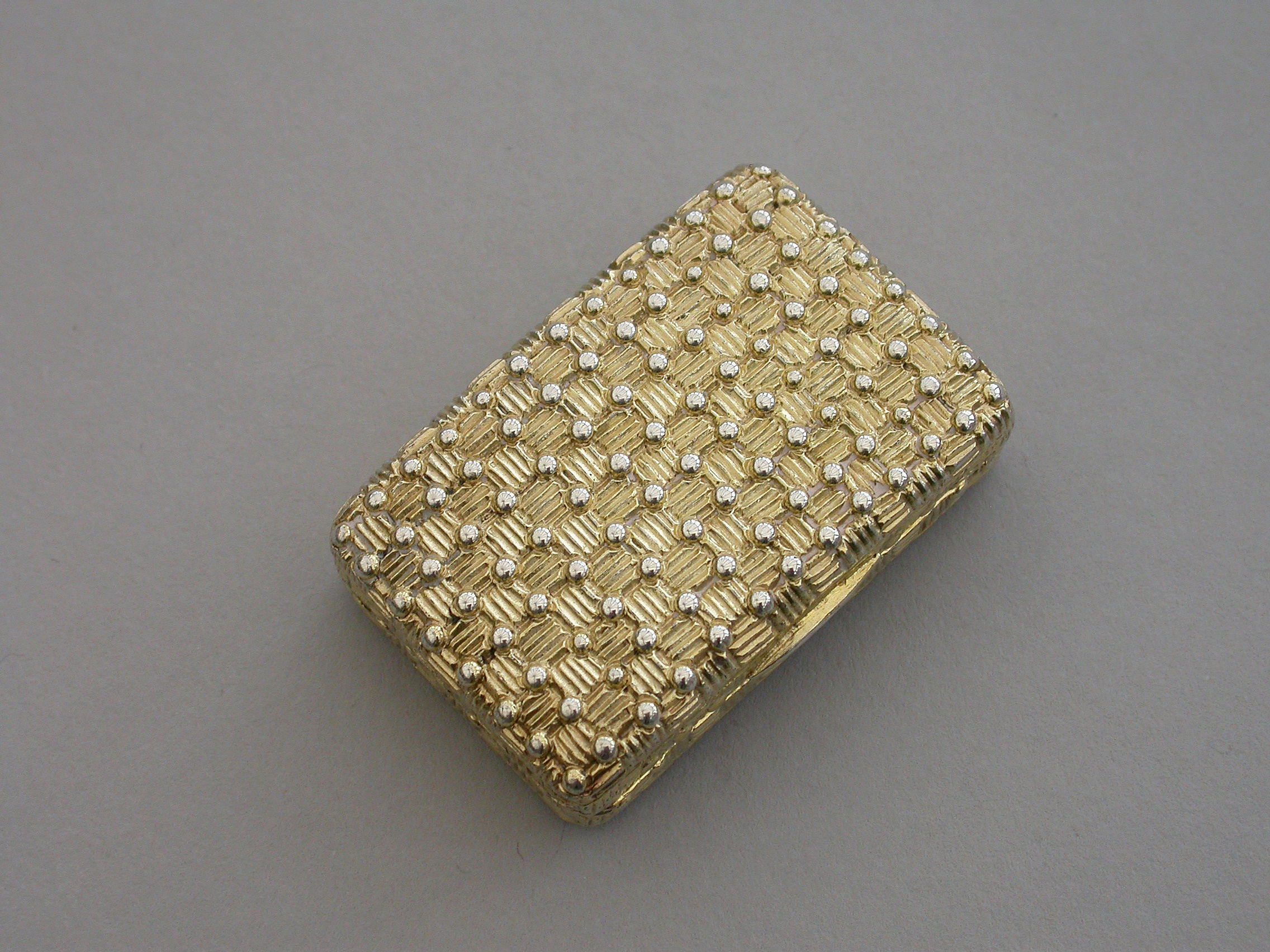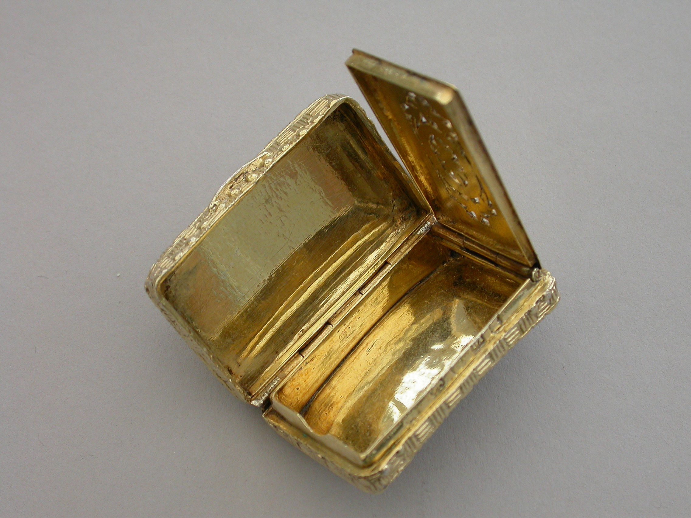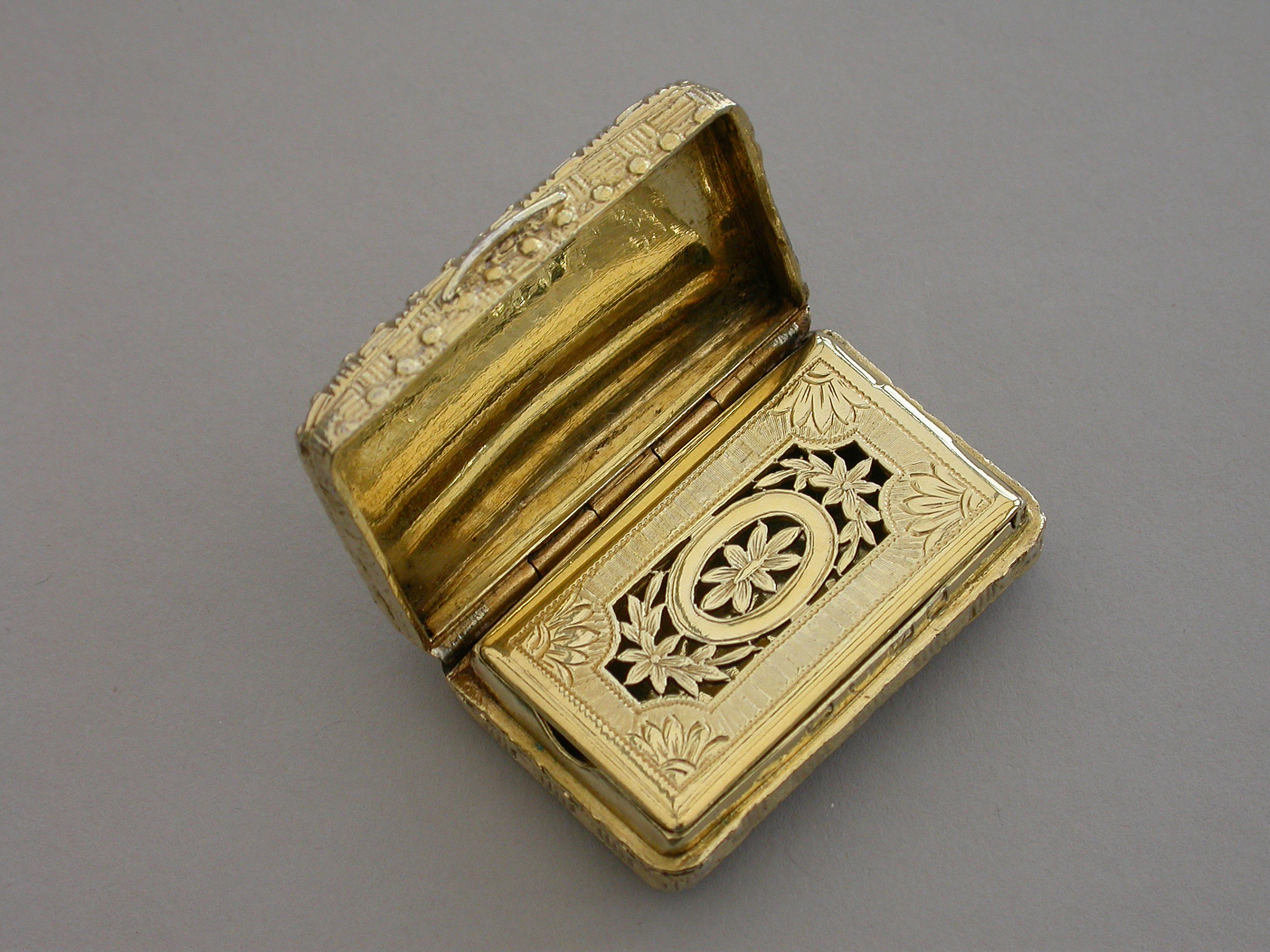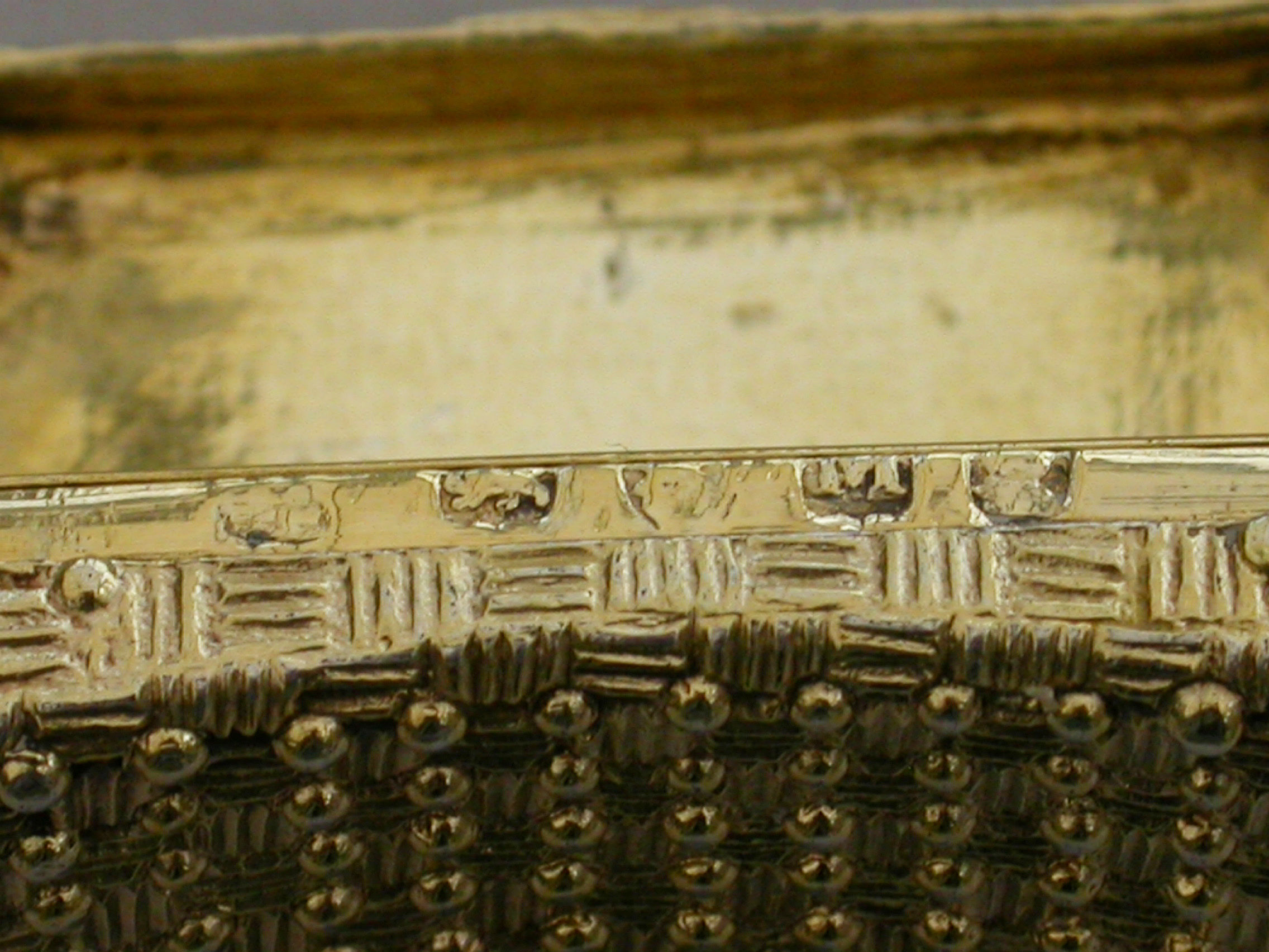 A good quality George III silver gilt Vinaigrette of curved rectangular form with all over basket weave and bead decoration. The silver gilt interior with pierced flower head grille.