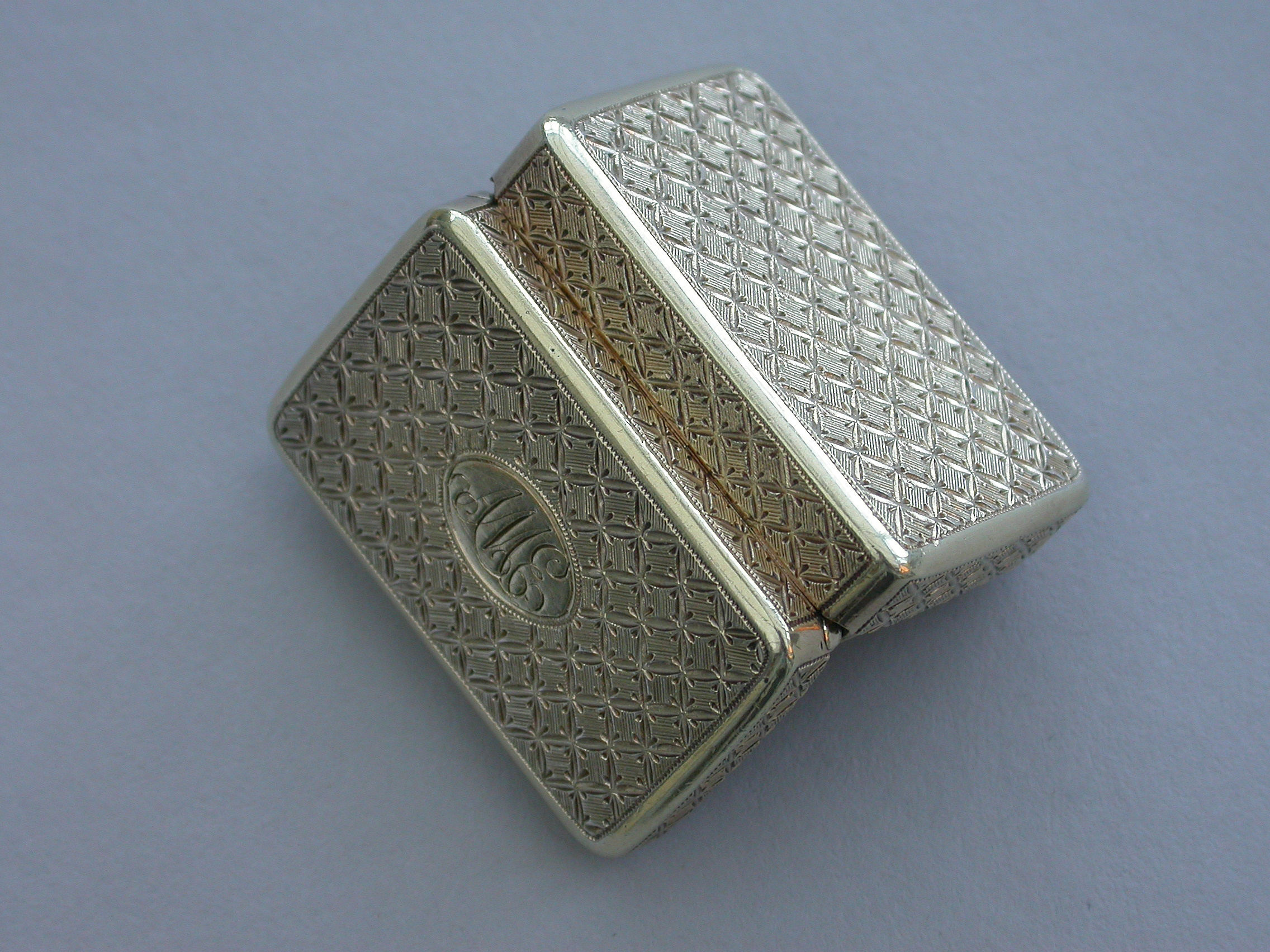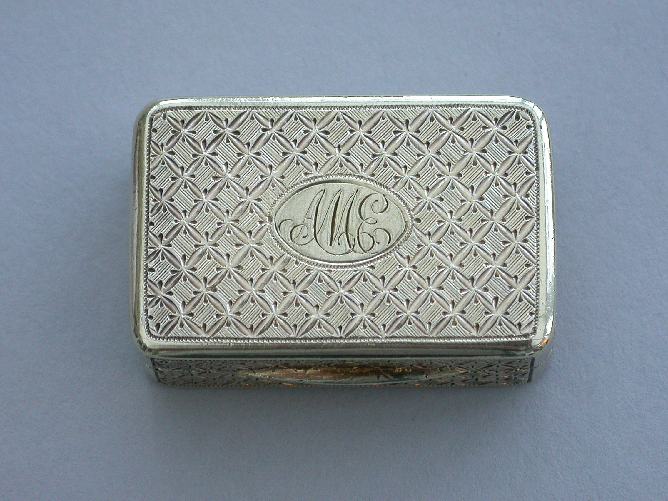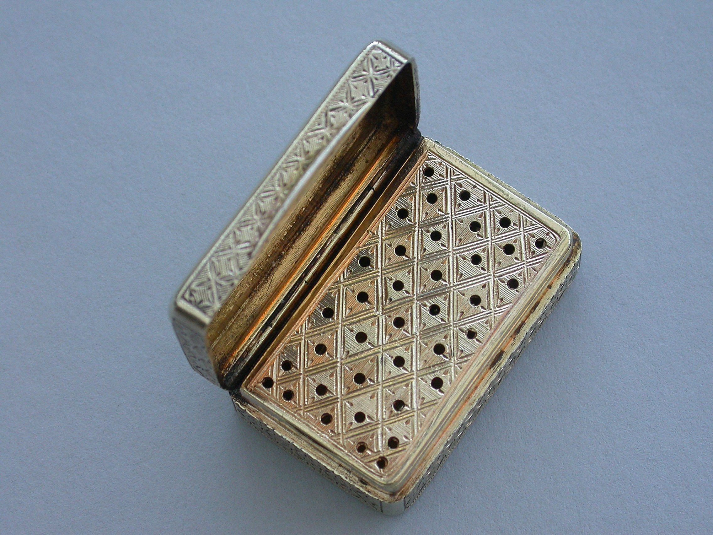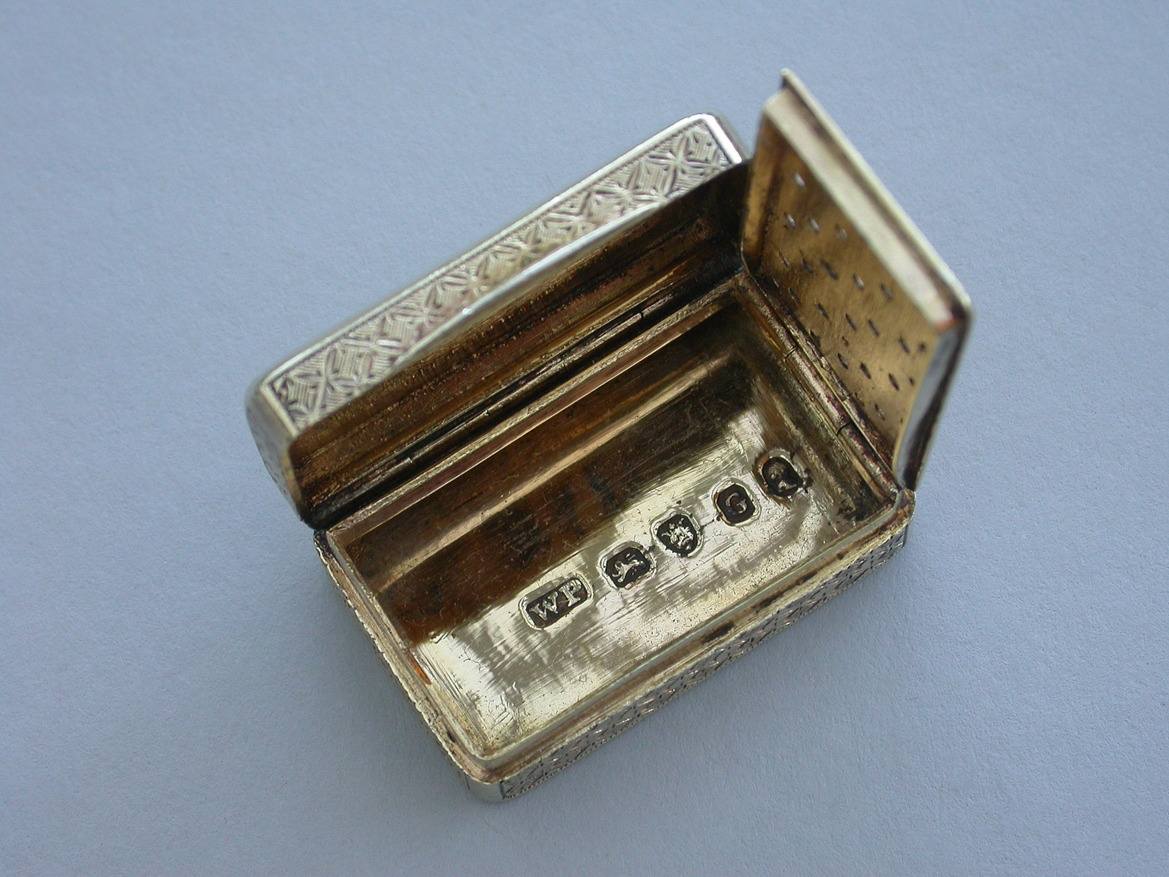 A very fine George III silver gilt Vinaigrette of rectangular form engraved all-over with quatrefoils and tear drops, the lid with oval cartouche engraved with contemporary initials 'AME'. Silver gilt interior with pierced grille with matching decoration.