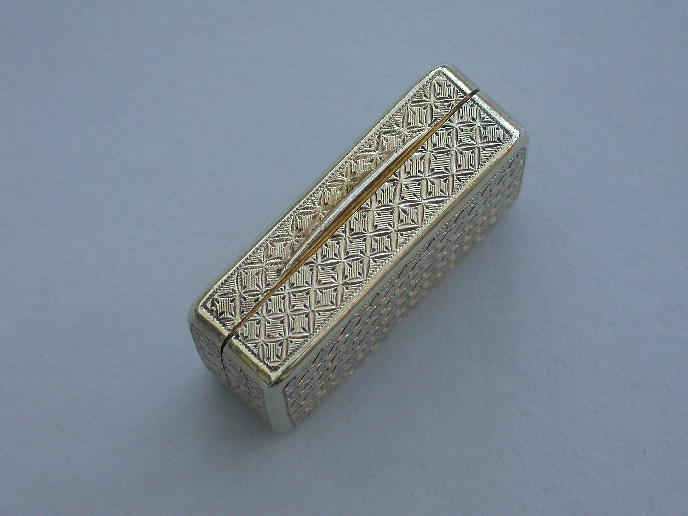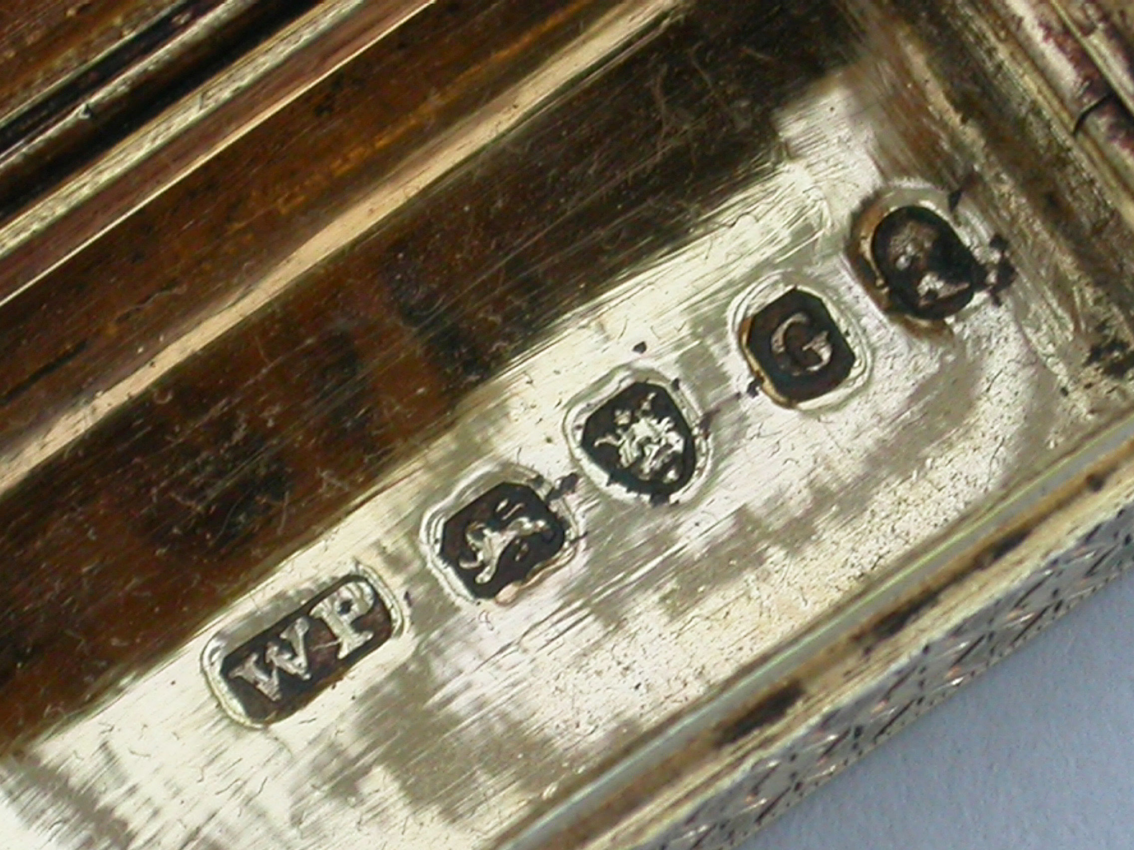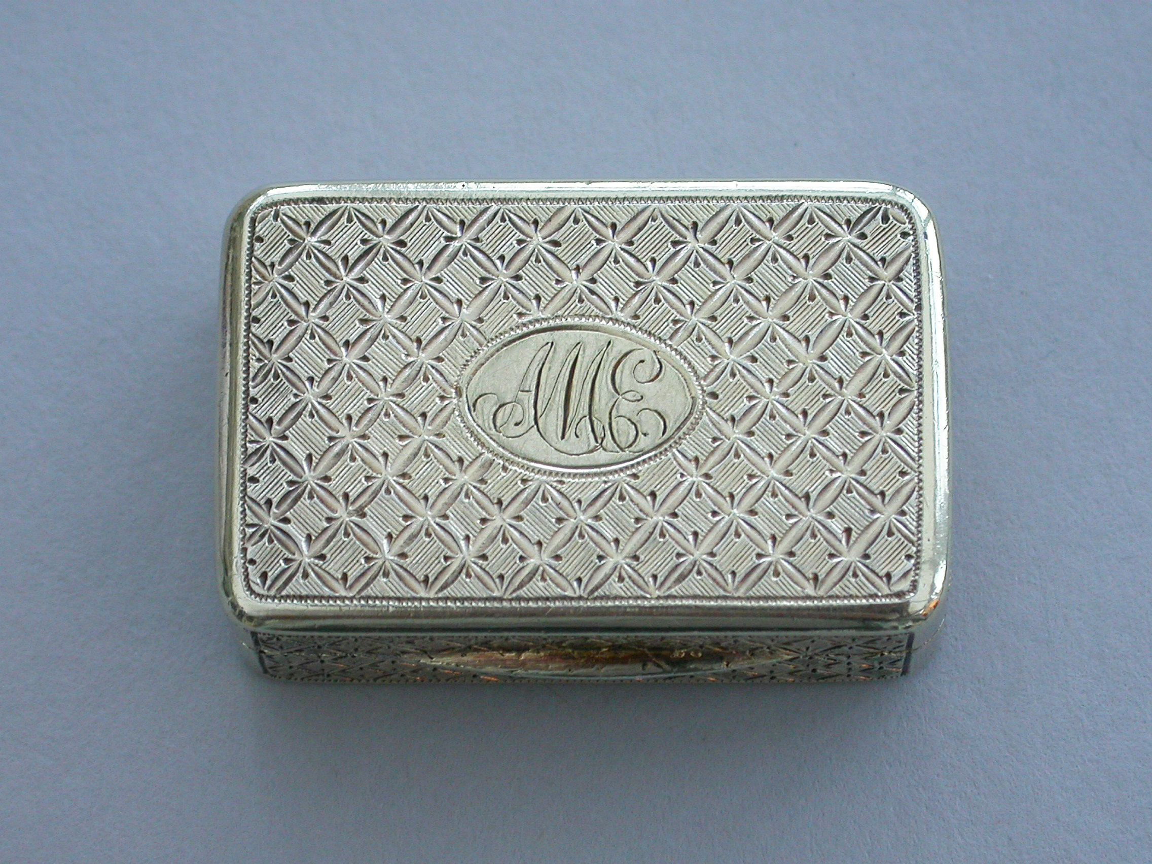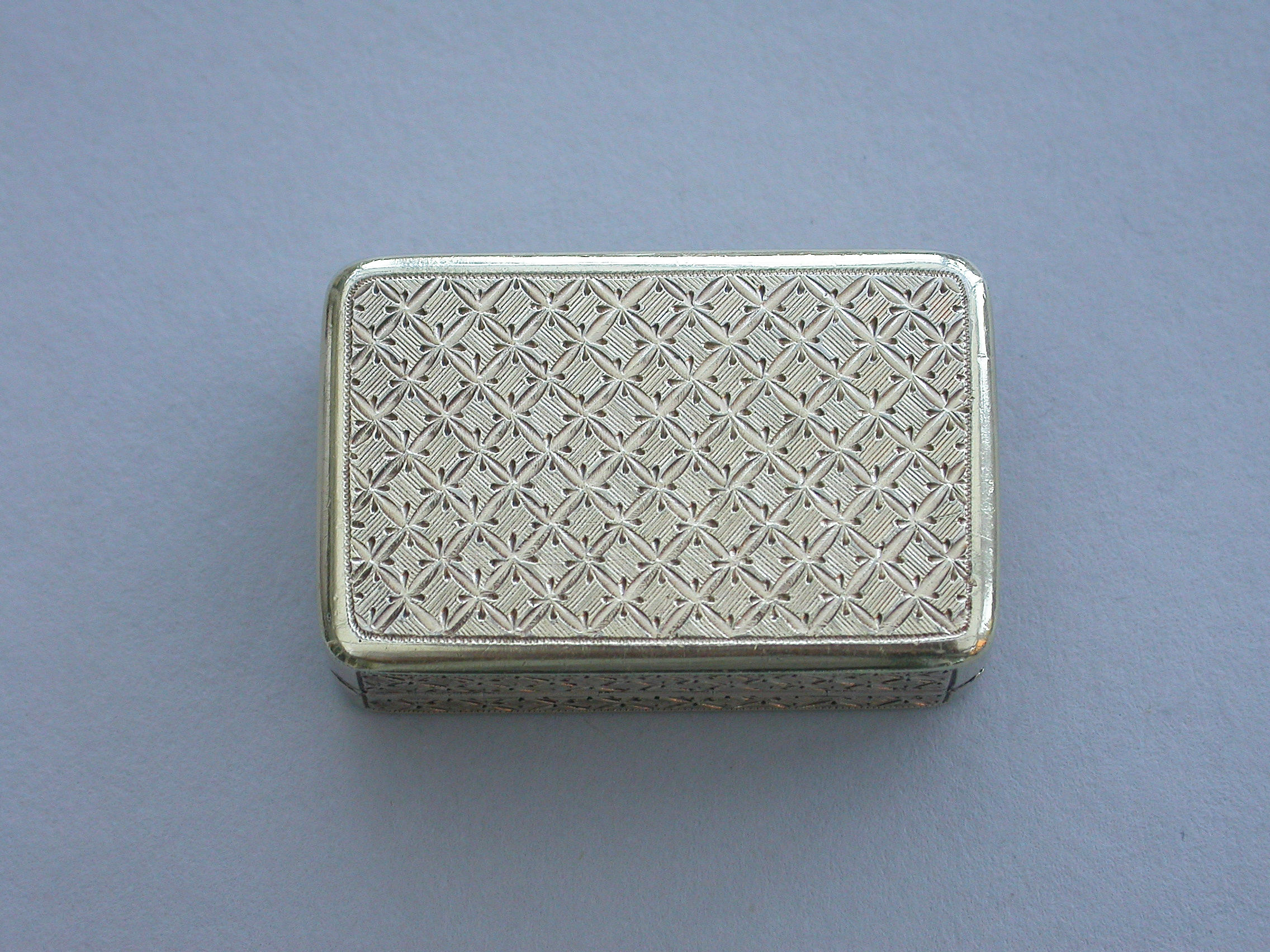 A very fine George III silver gilt Vinaigrette of rectangular form engraved all-over with quatrefoils and tear drops, the lid with oval cartouche engraved with contemporary initials 'AME'. Silver gilt interior with pierced grille with matching decoration.