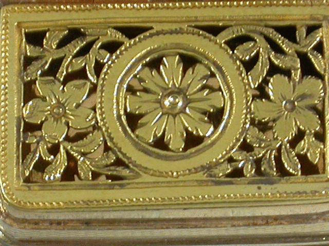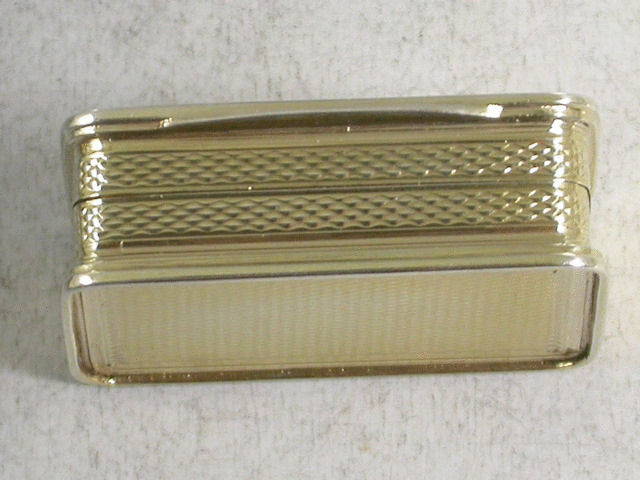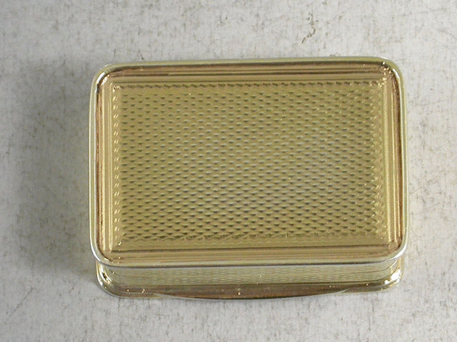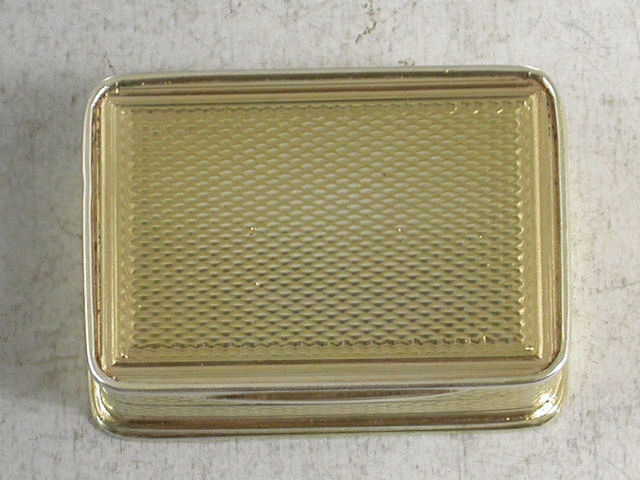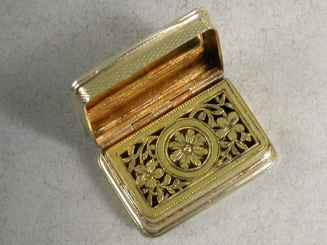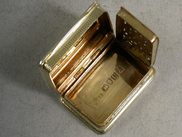 A fine George III silver gilt Vinaigrette of plain rectangular form with raised rims and thumb piece, all over engine turned decoration, the silver gilt interior with finely pierced grille with central circular sunflower motif amongst other flower heads and foliage.